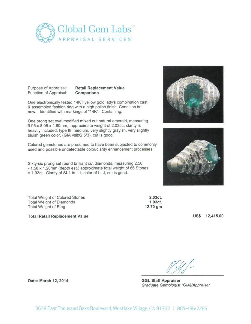 One electronically tested 14KT yellow gold Ladies combination cast & assembled fashion ring with a high polish finish. Condition is new. Identified with markings of "14K". Containing: One prong set oval modified mixed cut natural emerald, measuring 9.95 x 8.08 x 4.60mm, approximate weight of 2.03ct., clarity is heavily included, type III, medium, very slightly grayish, very slightly bluish green color, (GIA vslbG 5/3), cut is good. Colored gemstones are presumed to have been subjected to commonly used and possible undetectable color/clarity enhancement processes. Sixty-Six prong set round brilliant cut diamonds, measuring 2.50 - 1.50 x 1.20mm (depth est.) approximate total weight of 66 Stones = 1.93ct. Clarity of SI-1 to I-1, Color of I - J, Cut is Good. Total Weight of Colored Stones 2.03ct. Total Weight of Diamonds 1.93ct. Total Weight of Ring 12.70 grams. GGL Appraised.