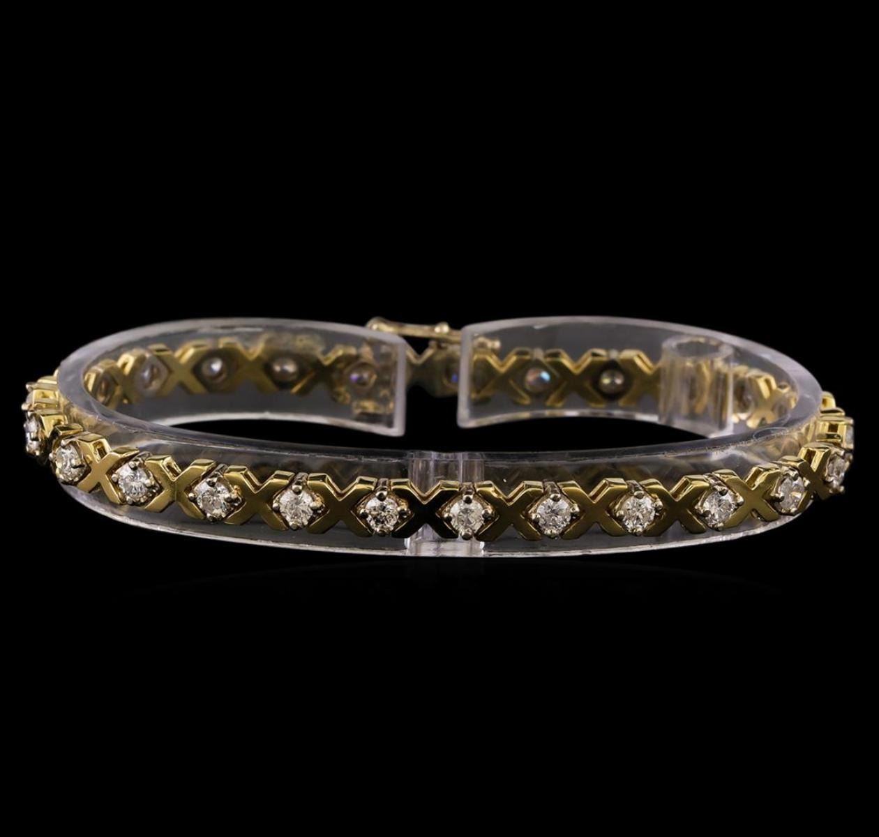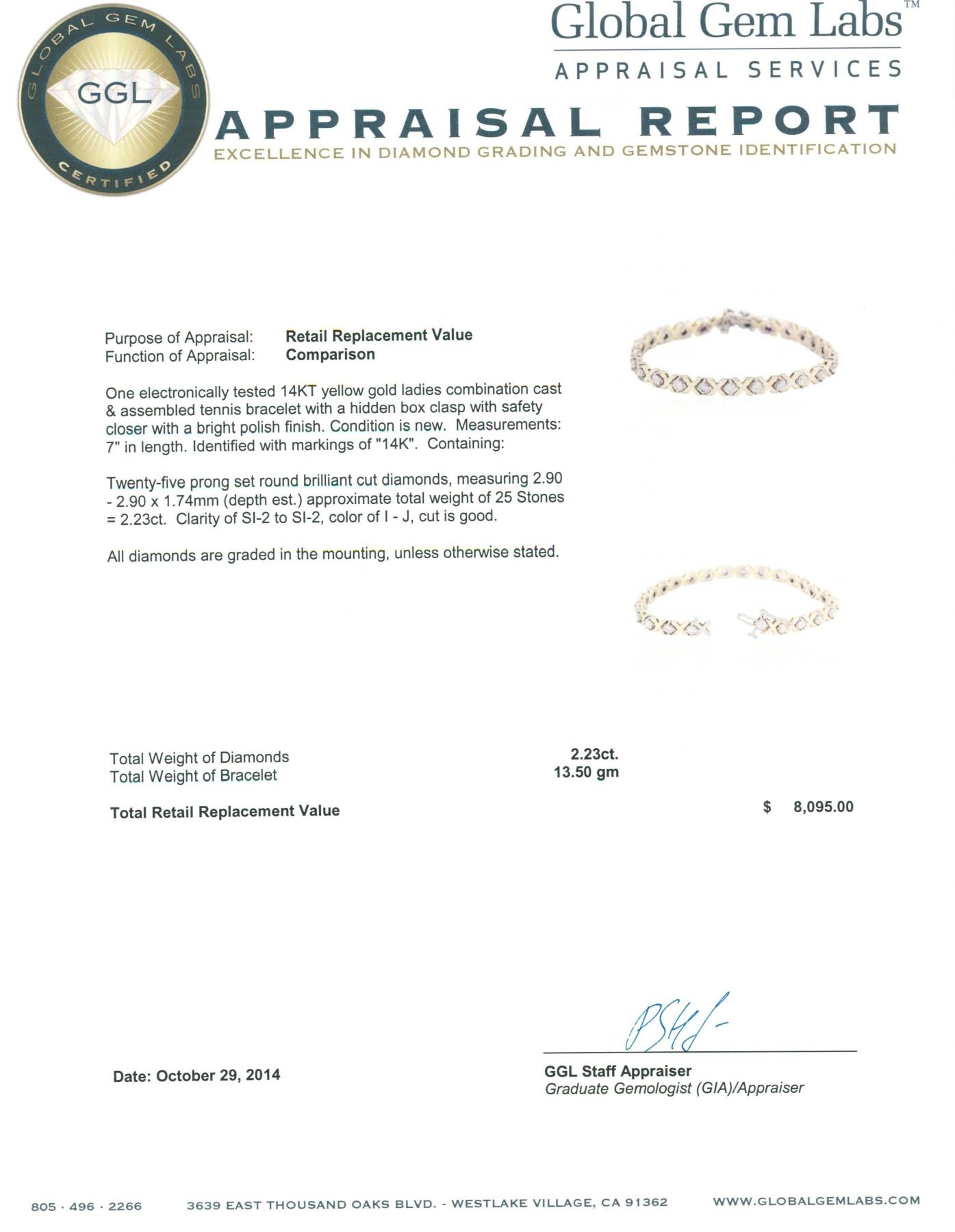 One electronically tested 14KT yellow gold ladies combination cast & assembled tennis bracelet with a hidden box clasp with safety closer with a bright polish finish. Measurements: 7 in length. Identified with markings of 14K. Condition is new. Containing: Twenty-Five prong set round brilliant cut diamonds, measuring 2.90 - 2.90 x 1.74mm (depth est.) approximate total weight of 25 Stones = 2.23ct. Clarity: SI-2 to SI-2. Color: I - J, Cut is Good. All diamonds are graded in the mounting, unless otherwise stated. Total Weight of Diamonds 2.23ct. Total Weight of Bracelet 13.50 grams. GGL Appraised.
