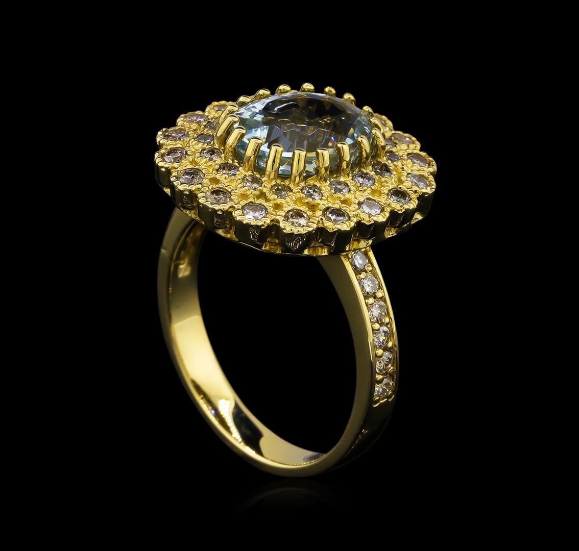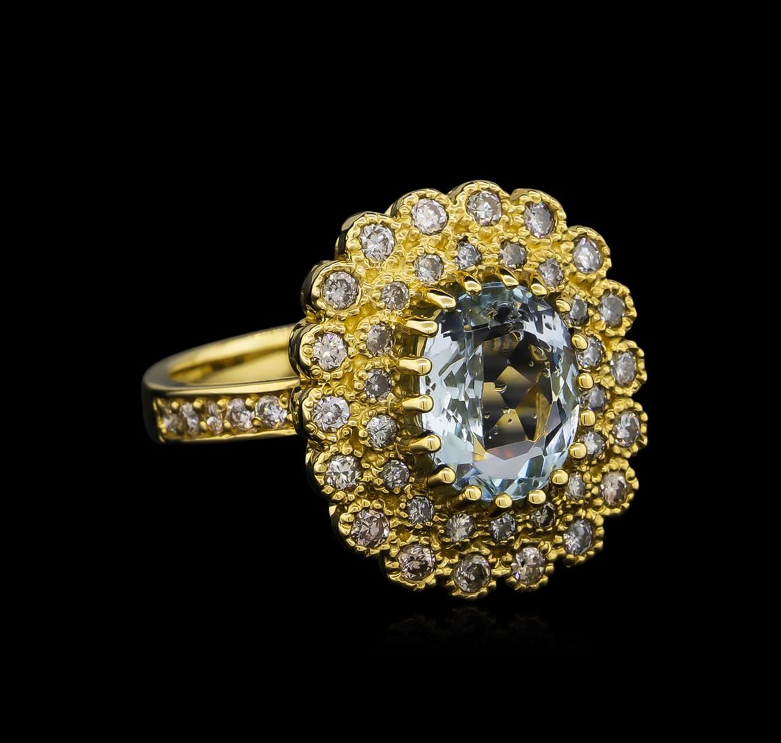 One electronically tested 14KT yellow gold ladies cast aquamarine and diamond ring. Condition is new, good workmanship. The featured aquamarine is set within a two tiered diamond lattice gallery, supported by diamond set shoulders and completed by a three millimeter wide band. Identified with markings of "K14". Containing: One prong set oval mixed cut natural aquamarine, measuring 9.80 x 7.80 x 5.00mm, 8%. bulge factor, approximate weight of 2.27ct., clarity is eye clean, type I, medium light, very slightly grayish, blue color, (GIA B 4/3), cut is good. Transmitting light with no distortion, transparent. Refractive index testing results of 1.56 to 1.57. This is a conclusive result for Aquamarine (Beryl). Graded in the setting. Forty-Eight bead & bezel set round brilliant cut diamonds, measuring 1.70 - 1.50 x 0.96mm (depth est.) approximate. Total Weight of 48 Stones = 0.81ct. Graded in the setting. Clarity: SI-2 to I-2. Color: G - I. Total Weight of Colored Stones 2.27ct. Total Weight of Diamonds 0.81ct. Total Weight of Ring 7.70 grams. AIG Appraised.