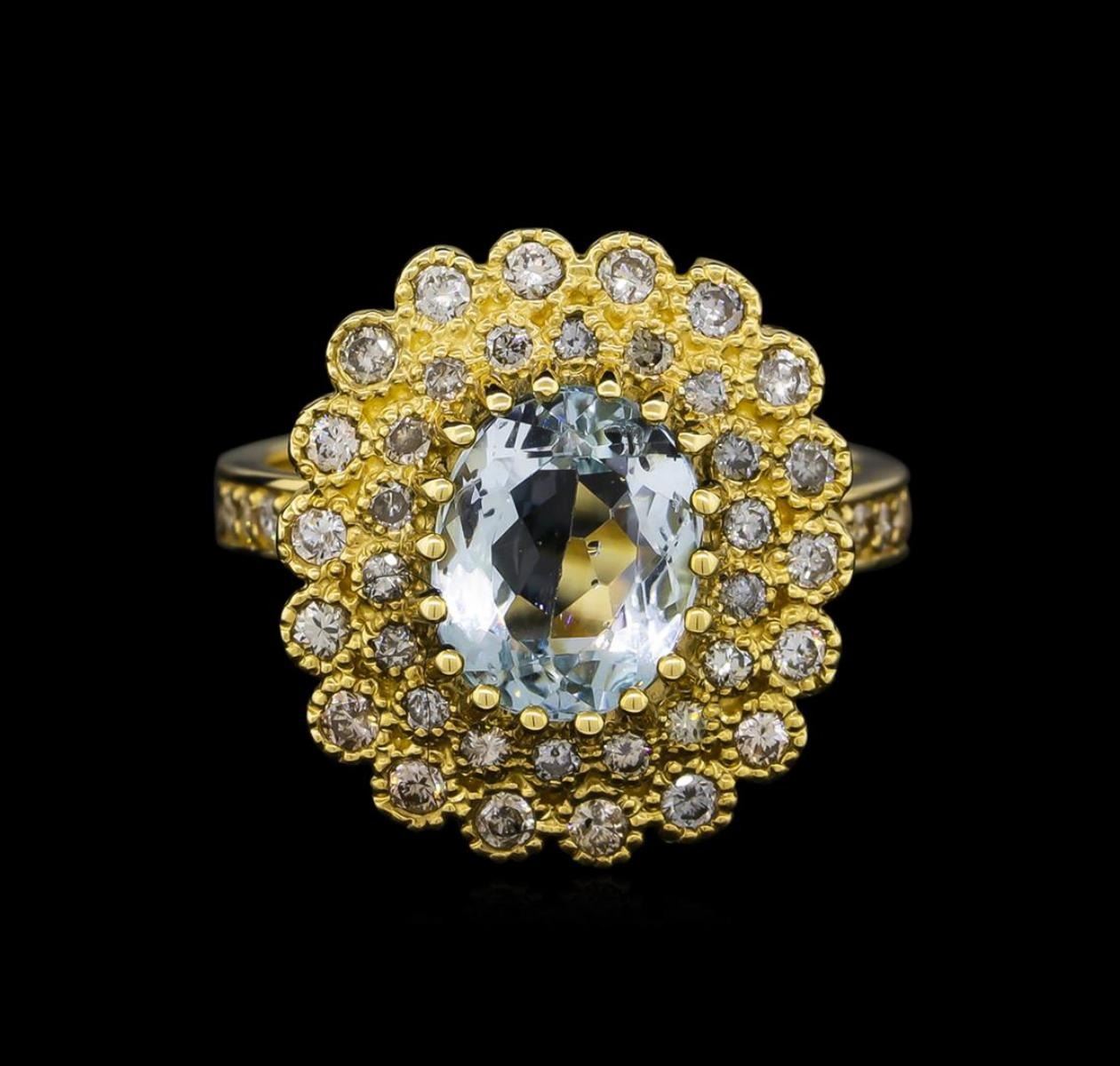 One electronically tested 14KT yellow gold ladies cast aquamarine and diamond ring. Condition is new, good workmanship. The featured aquamarine is set within a two tiered diamond lattice gallery, supported by diamond set shoulders and completed by a three millimeter wide band. Identified with markings of "K14". Containing: One prong set oval mixed cut natural aquamarine, measuring 9.80 x 7.80 x 5.00mm, 8%. bulge factor, approximate weight of 2.27ct., clarity is eye clean, type I, medium light, very slightly grayish, blue color, (GIA B 4/3), cut is good. Transmitting light with no distortion, transparent. Refractive index testing results of 1.56 to 1.57. This is a conclusive result for Aquamarine (Beryl). Graded in the setting. Forty-Eight bead & bezel set round brilliant cut diamonds, measuring 1.70 - 1.50 x 0.96mm (depth est.) approximate. Total Weight of 48 Stones = 0.81ct. Graded in the setting. Clarity: SI-2 to I-2. Color: G - I. Total Weight of Colored Stones 2.27ct. Total Weight of Diamonds 0.81ct. Total Weight of Ring 7.70 grams. AIG Appraised.