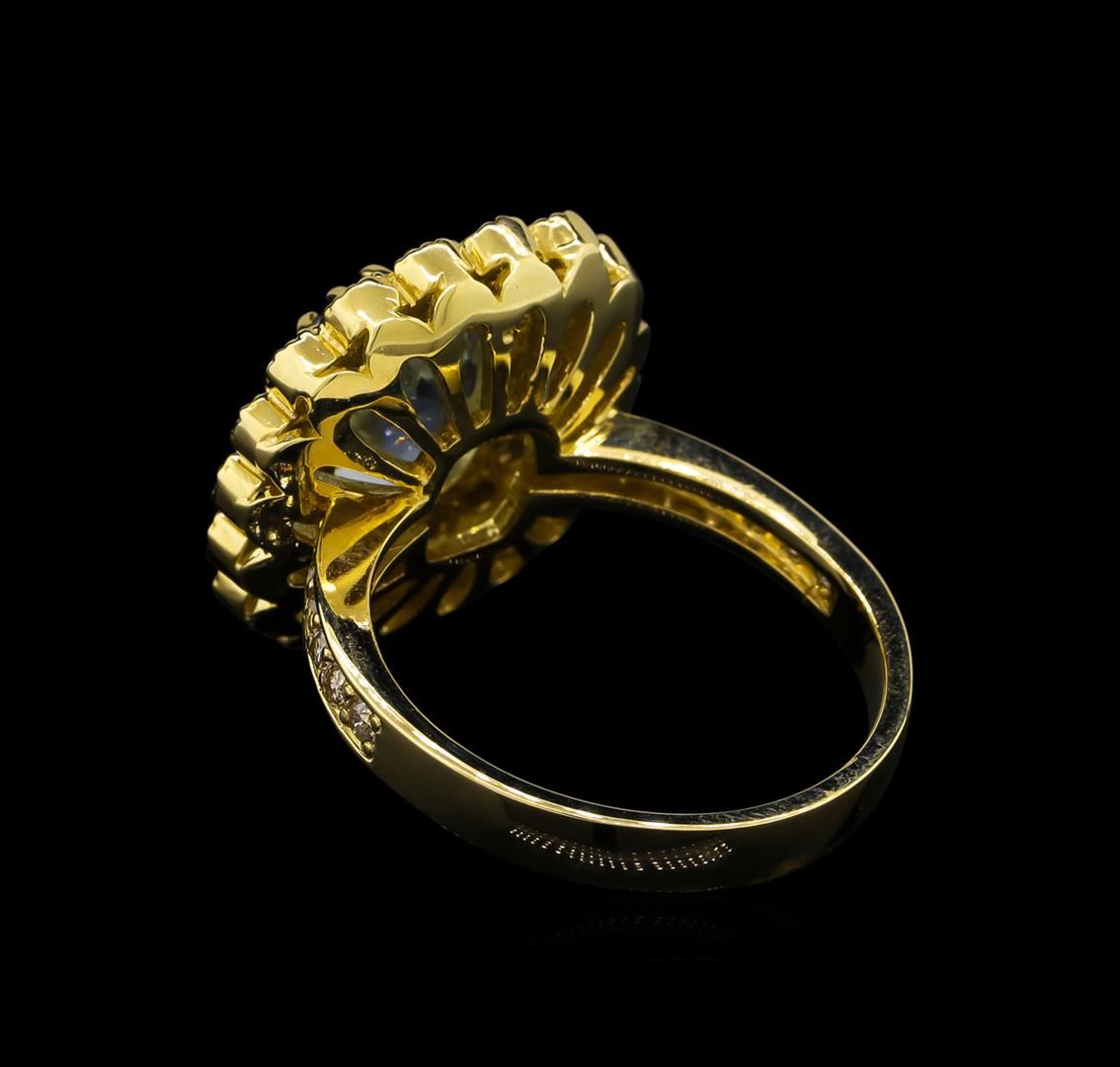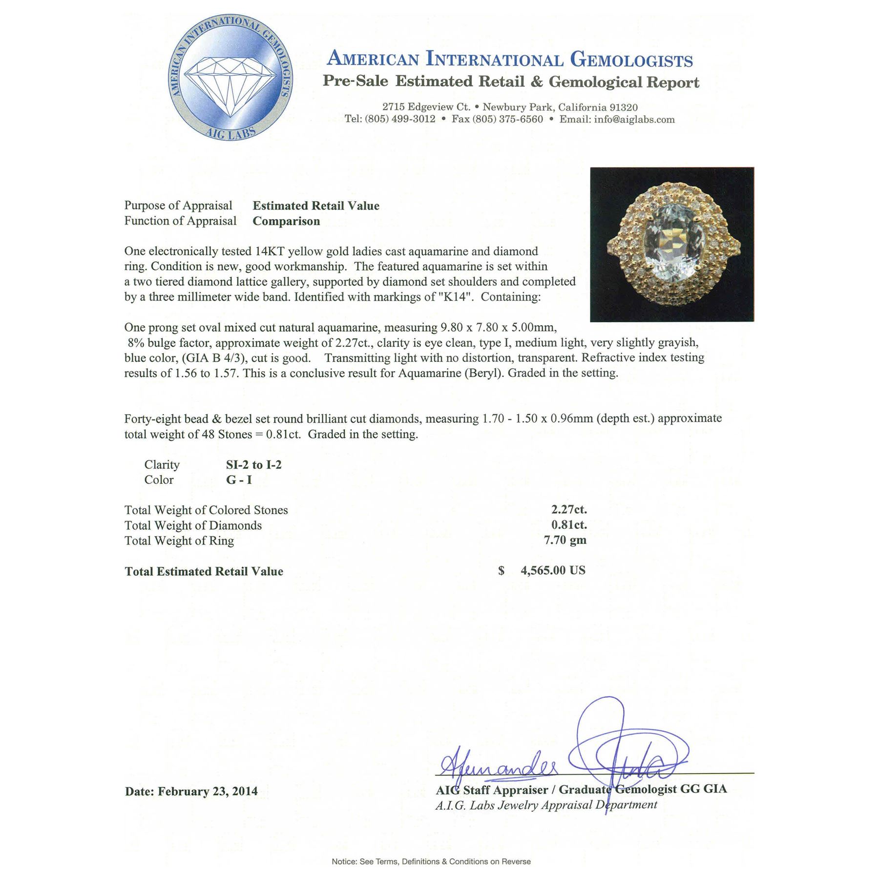 One electronically tested 14KT yellow gold ladies cast aquamarine and diamond ring. Condition is new, good workmanship. The featured aquamarine is set within a two tiered diamond lattice gallery, supported by diamond set shoulders and completed by a three millimeter wide band. Identified with markings of "K14". Containing: One prong set oval mixed cut natural aquamarine, measuring 9.80 x 7.80 x 5.00mm, 8%. bulge factor, approximate weight of 2.27ct., clarity is eye clean, type I, medium light, very slightly grayish, blue color, (GIA B 4/3), cut is good. Transmitting light with no distortion, transparent. Refractive index testing results of 1.56 to 1.57. This is a conclusive result for Aquamarine (Beryl). Graded in the setting. Forty-Eight bead & bezel set round brilliant cut diamonds, measuring 1.70 - 1.50 x 0.96mm (depth est.) approximate. Total Weight of 48 Stones = 0.81ct. Graded in the setting. Clarity: SI-2 to I-2. Color: G - I. Total Weight of Colored Stones 2.27ct. Total Weight of Diamonds 0.81ct. Total Weight of Ring 7.70 grams. AIG Appraised.