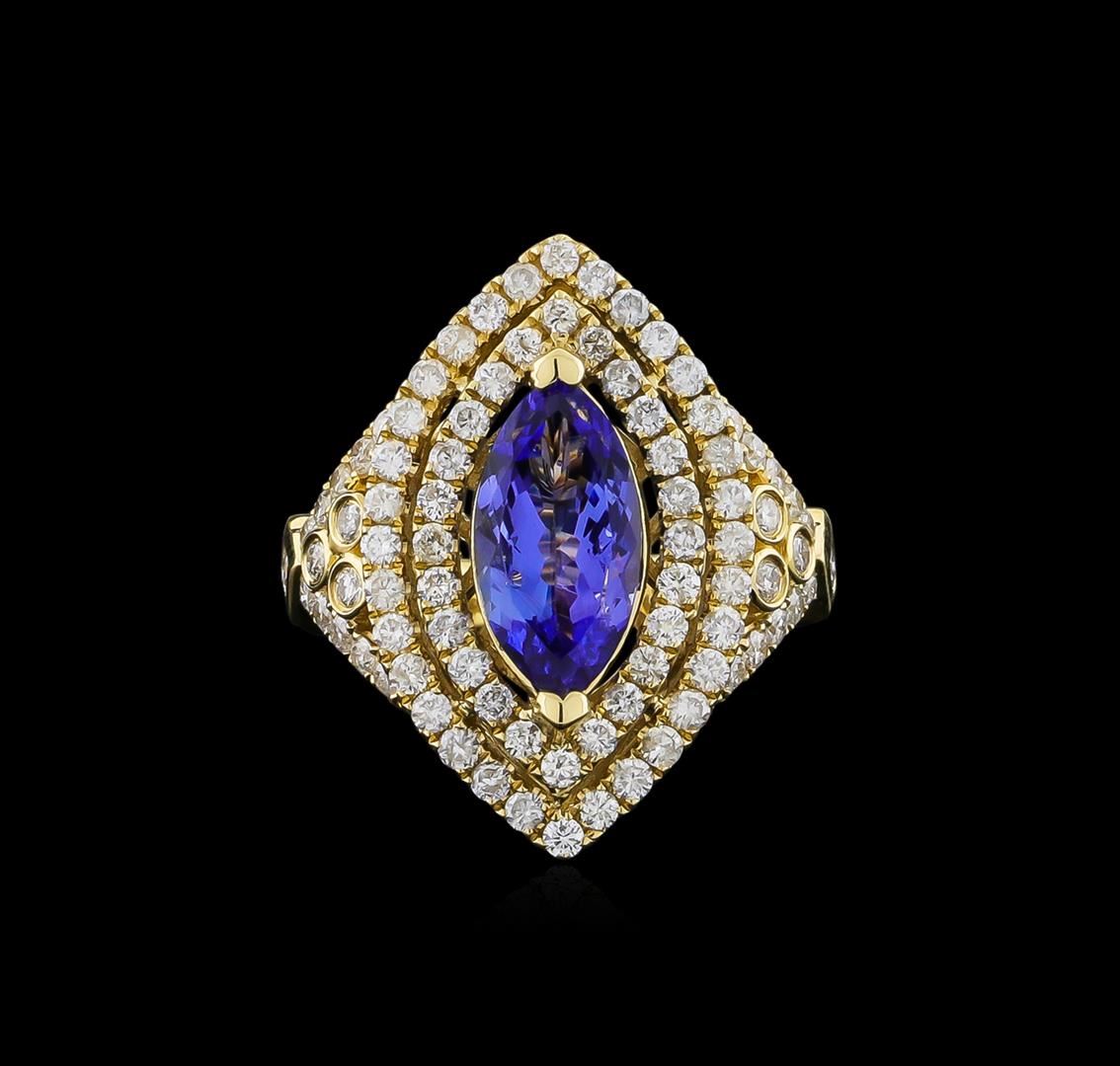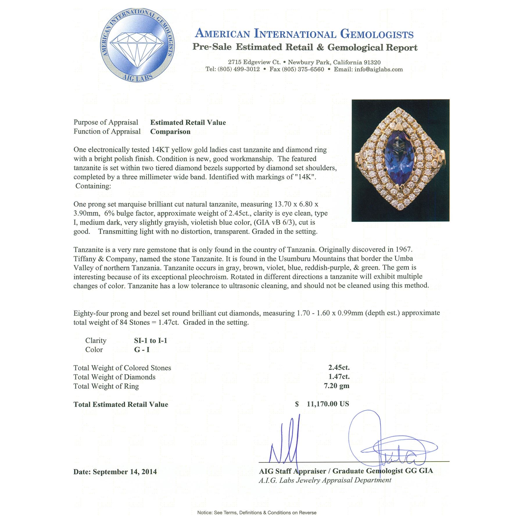 One electronically tested 14KT yellow gold ladies cast tanzanite and diamond ring with a bright polish finish. The featured tanzanite is set within two tiered diamond bezels supported by diamond set shoulders, completed by a three millimeter wide band. Identified with markings of "14K". Condition is new, good workmanship. Containing: One prong set marquise brilliant cut natural tanzanite, measuring 13.70 x 6.80 x 3.90mm, 6% bulge factor, approximate weight of 2.45ct., clarity is eye clean, type I, medium dark, very slightly grayish, violetish blue color, (GIA vB 6/3), cut is good. Transmitting light with no distortion, transparent. Graded in the setting. Tanzanite is a very rare gemstone that is only found in the country of Tanzania. Originally discovered in 1967. Tiffany & Company, named the stone Tanzanite. It is found in the Usumburu Mountains that border the Umba Valley of northern Tanzania. Tanzanite occurs in gray, brown, violet, blue, reddish-purple, & green. The gem is interesting because of its exceptional pleochroism. Rotated in different directions a tanzanite will exhibit multiple changes of color. Tanzanite has a low tolerance to ultrasonic cleaning, and should not be cleaned using this method. Eighty-Four prong and bezel set round brilliant cut diamonds, measuring 1.70 - 1.60 x 0.99mm (depth est.) approximate total weight of 84 Stones = 1.47ct. Graded in the setting. Clarity: SI-1 to I-1. Color: G - I. Total Weight of Colored Stones 2.45ct. Total Weight of Diamonds 1.47ct. Total Weight of Ring 7.20 grams. AIG Appraised.