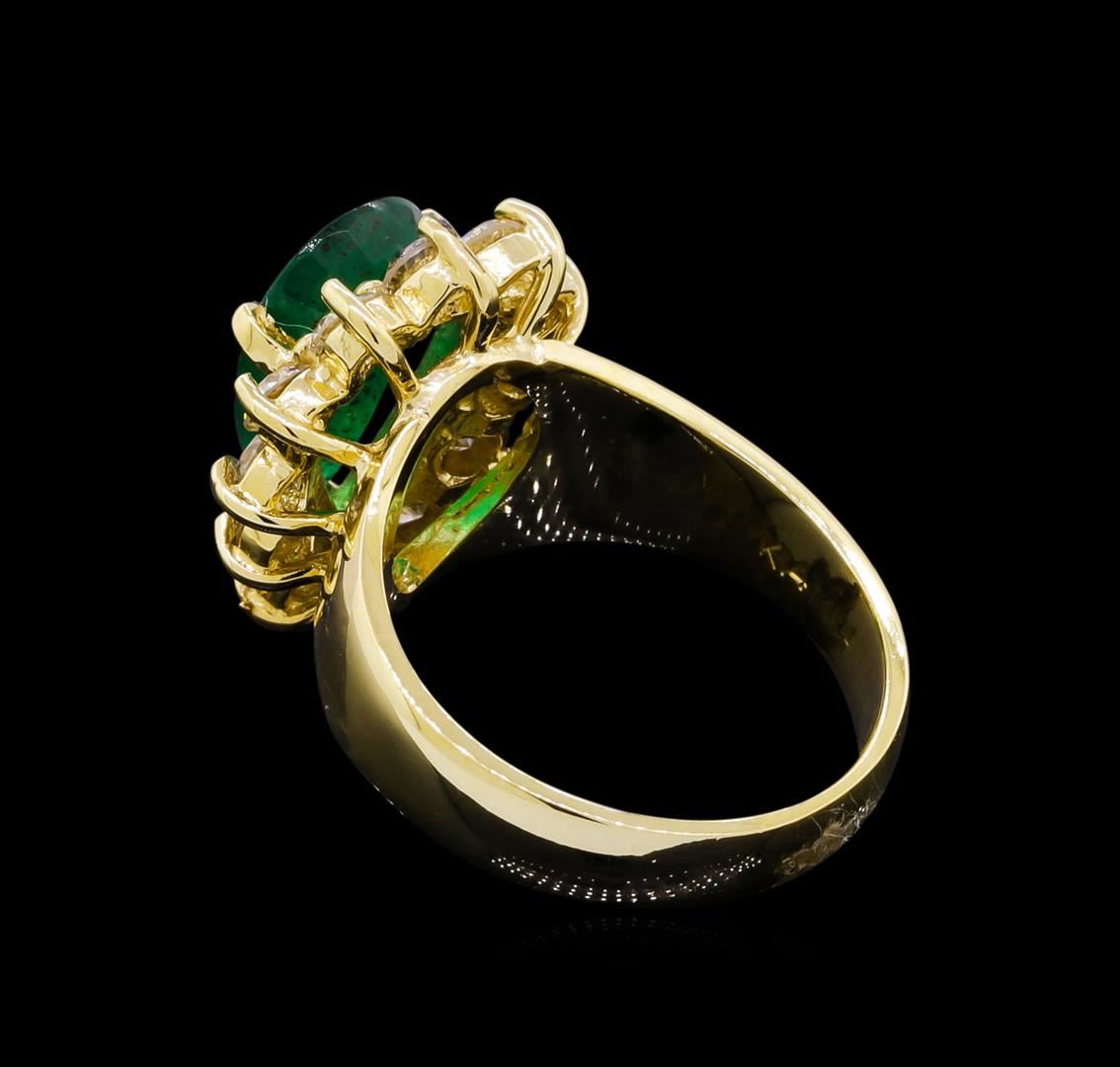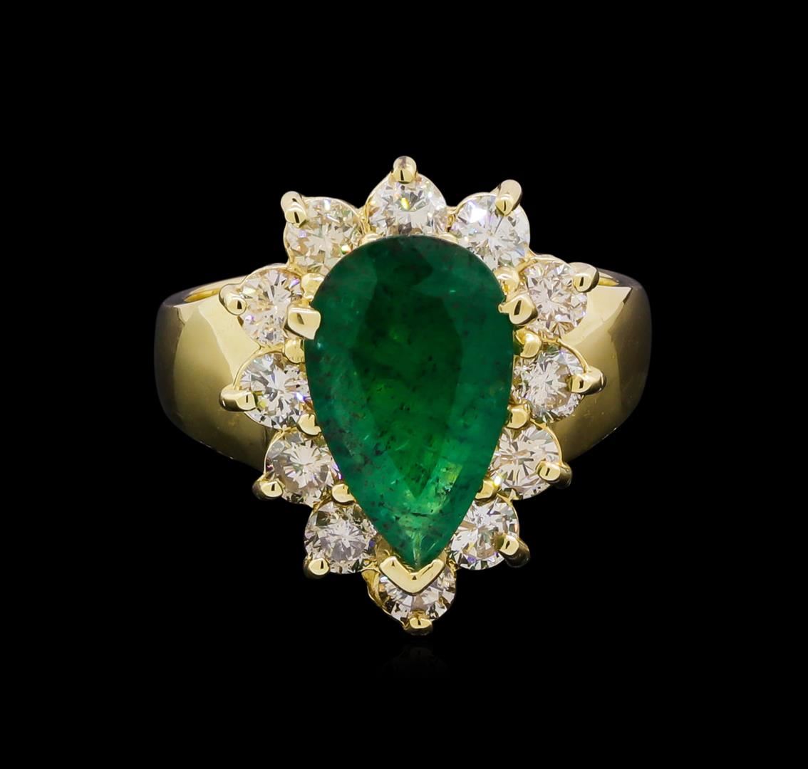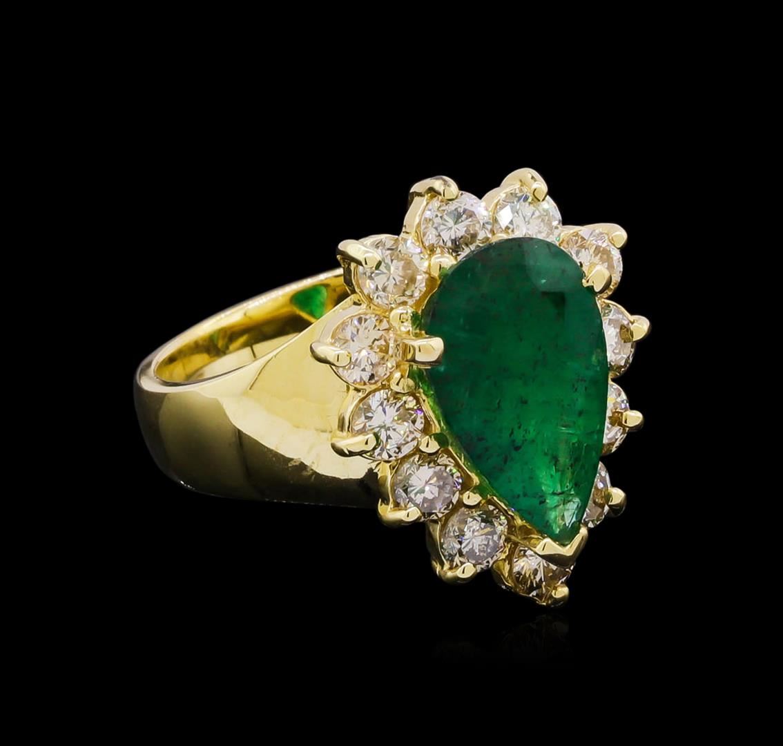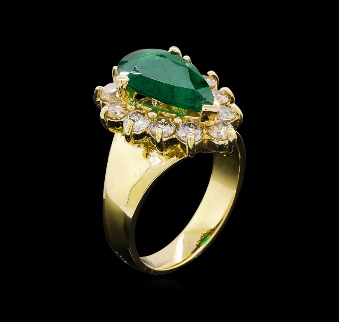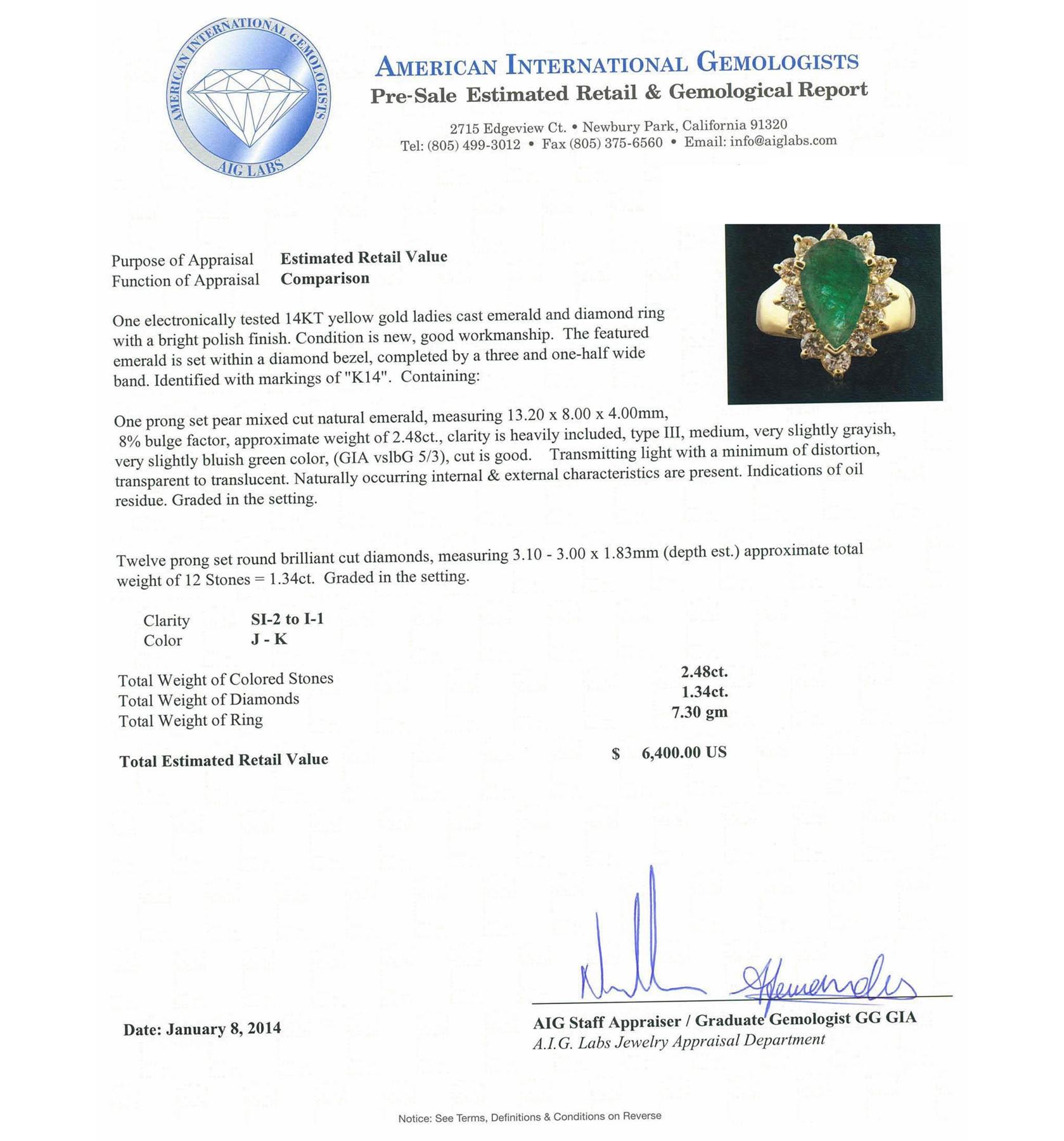 One electronically tested 14KT yellow gold ladies cast emerald and diamond ring with a bright polish finish. The featured emerald is set within a diamond bezel, completed by a three and one-half wide band. Identified with markings of "K14". Condition is new, good workmanship. Containing: One prong set pear mixed cut natural emerald, measuring 13.20 x 8.00 x 4.00mm, 8%. bulge factor, approximate weight of 2.48ct., clarity is heavily included, type III, medium, very slightly grayish, very slightly bluish green color, (GIA vslbG 5/3), cut is good. Transmitting light with a minimum of distortion, transparent to translucent. Naturally occurring internal & external characteristics are present. Indications of oil residue. Graded in the setting. Twelve prong set round brilliant cut diamonds, measuring 3.10 - 3.00 x 1.83mm (depth est.) approximate. Total Weight of 12 Stones = 1.34ct. Graded in the setting. Clarity: SI-2 to I-1 . Color: J - K. Total Weight of Colored Stones 2.48ct. Total Weight of Diamonds 1.34ct. AIG Appraised.