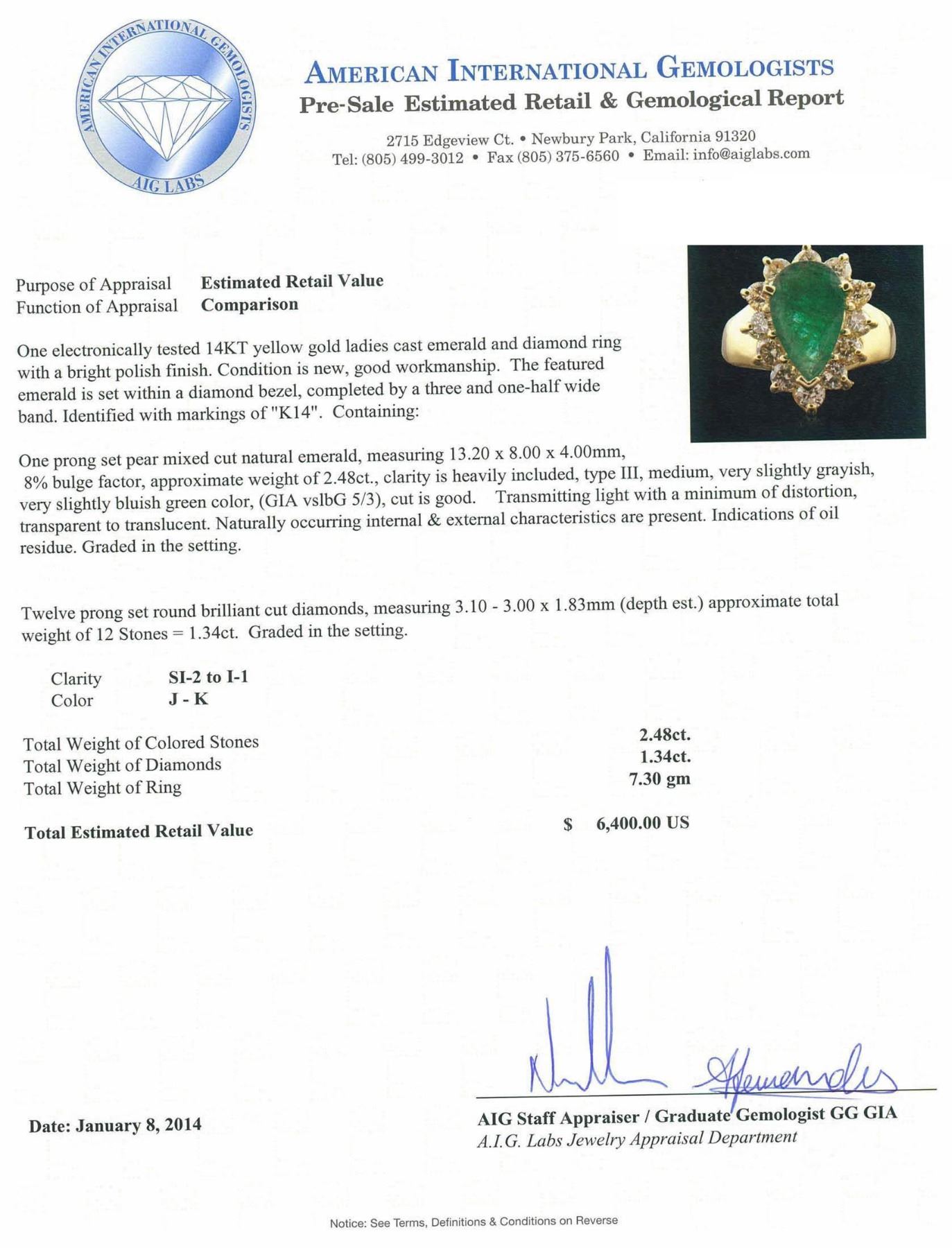 One electronically tested 14KT yellow gold ladies cast emerald and diamond ring with a bright polish finish. The featured emerald is set within a diamond bezel, completed by a three and one-half wide band. Identified with markings of "K14". Condition is new, good workmanship. Containing: One prong set pear mixed cut natural emerald, measuring 13.20 x 8.00 x 4.00mm, 8%. bulge factor, approximate weight of 2.48ct., clarity is heavily included, type III, medium, very slightly grayish, very slightly bluish green color, (GIA vslbG 5/3), cut is good. Transmitting light with a minimum of distortion, transparent to translucent. Naturally occurring internal & external characteristics are present. Indications of oil residue. Graded in the setting. Twelve prong set round brilliant cut diamonds, measuring 3.10 - 3.00 x 1.83mm (depth est.) approximate. Total Weight of 12 Stones = 1.34ct. Graded in the setting. Clarity: SI-2 to I-1 . Color: J - K. Total Weight of Colored Stones 2.48ct. Total Weight of Diamonds 1.34ct. AIG Appraised.