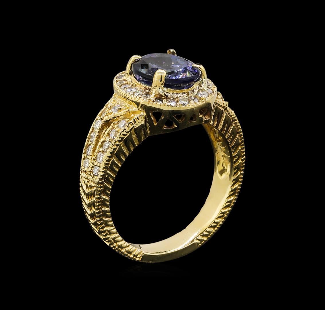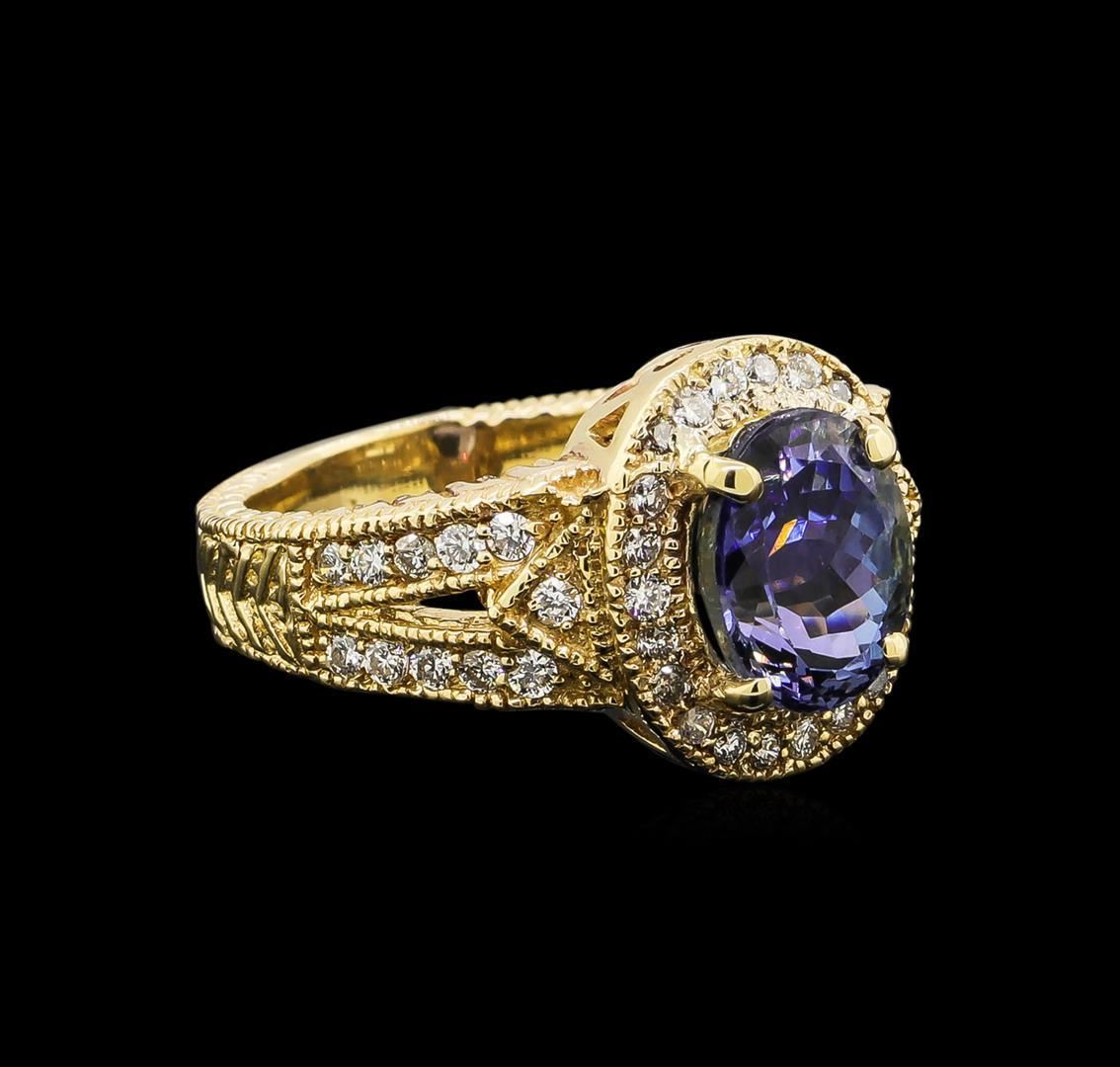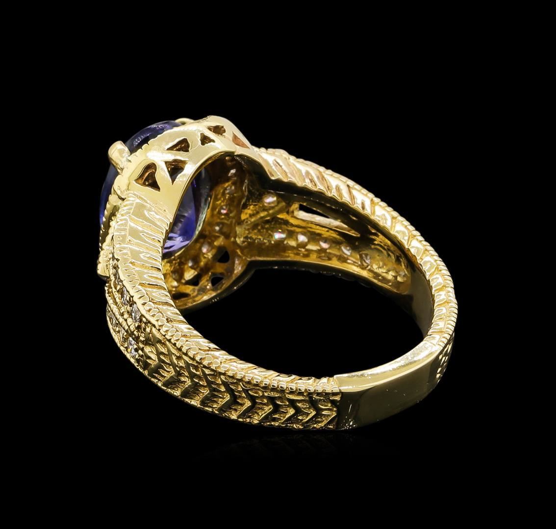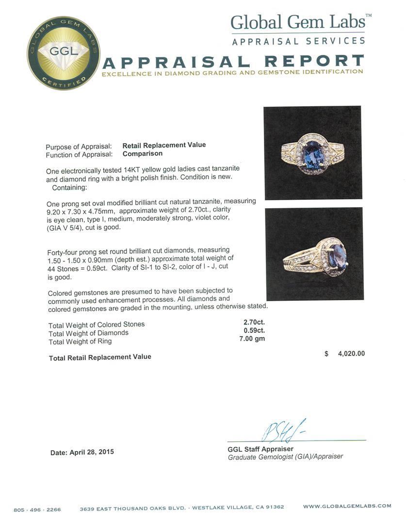 One electronically tested 14KT yellow gold ladies cast tanzanite and diamond ring with a bright polish finish. Condition is new. Containing: One prong set oval modified brilliant cut natural tanzanite, measuring 9.20 x 7.30 x 4.75mm, approximate weight of 2.70ct., clarity is eye clean, type I, medium, moderately strong, violet color, (GIA V 5/4), cut is good. Forty-Four prong set round brilliant cut diamonds, measuring 1.50 - 1.50 x 0.90mm (depth est.) approximate total weight of 44 Stones = 0.59ct. Clarity: SI-1 to SI-2. Color: I - J, Cut is Good. Colored gemstones are presumed to have been subjected to commonly used enhancement processes. All diamonds and colored gemstones are graded in the mounting, unless otherwise stated. Total Weight of Colored Stones 2.70ct. Total Weight of Diamonds 0.59ct. Total Weight of Ring 7.00 grams. GGL Appraised.