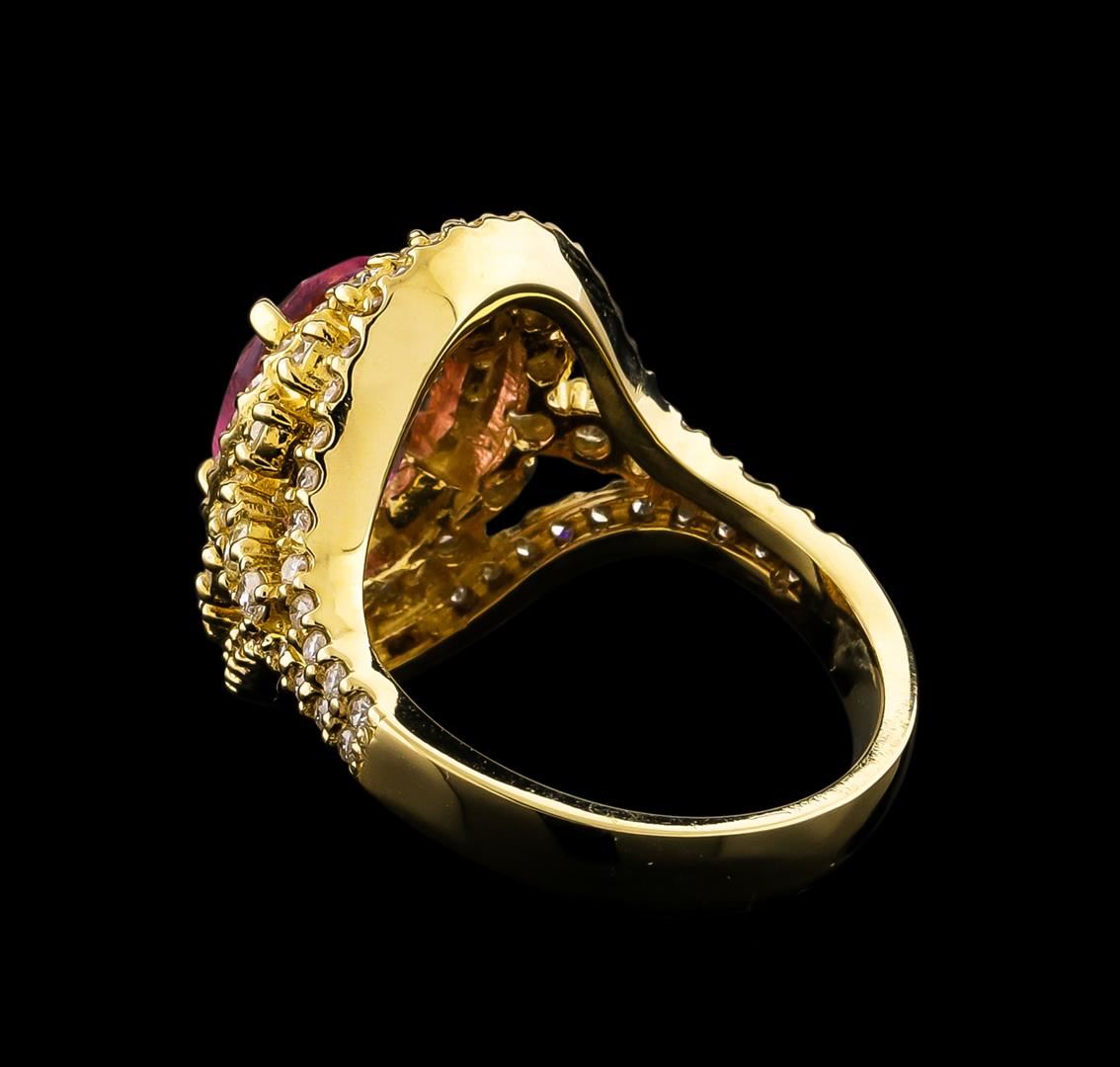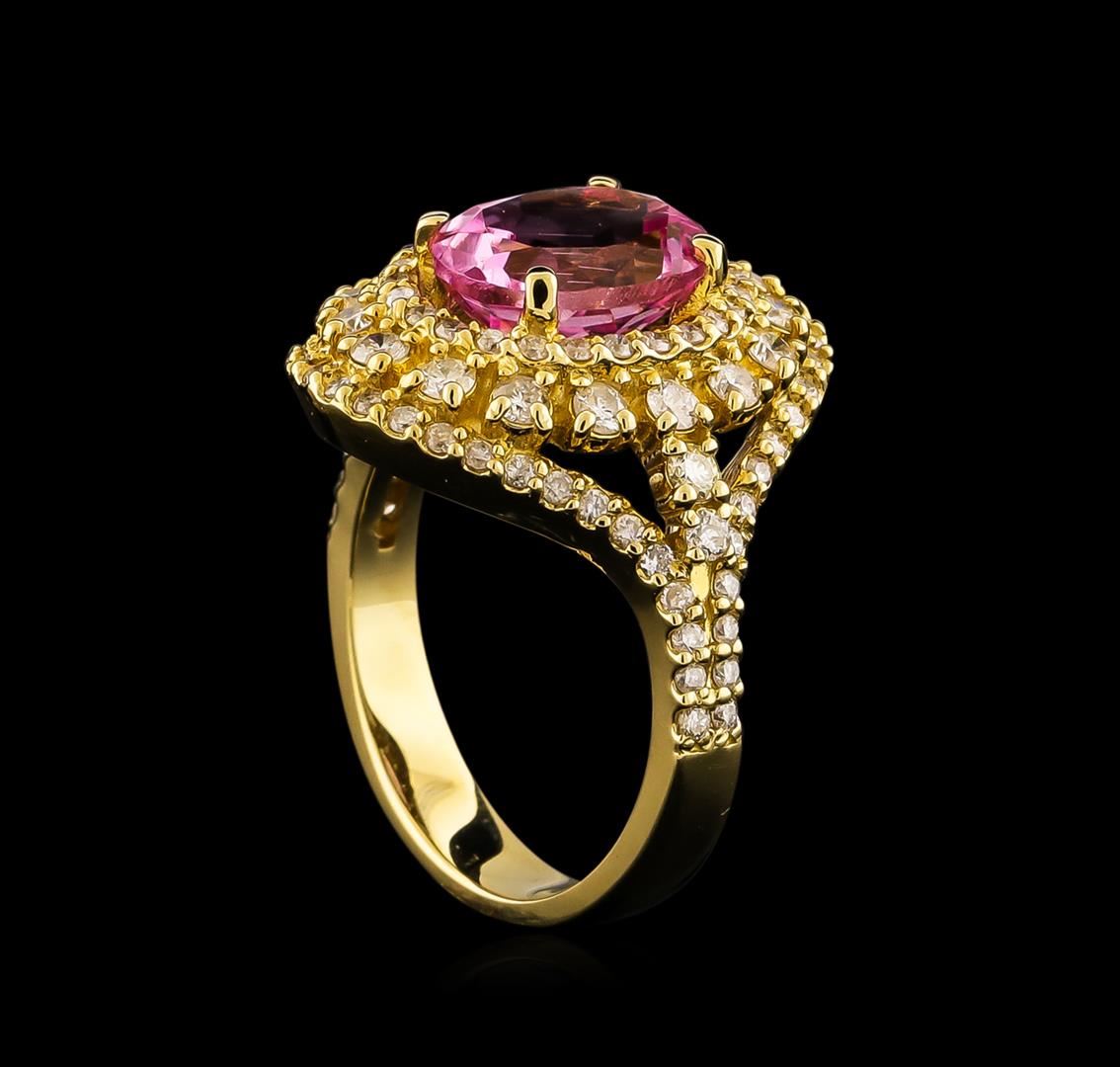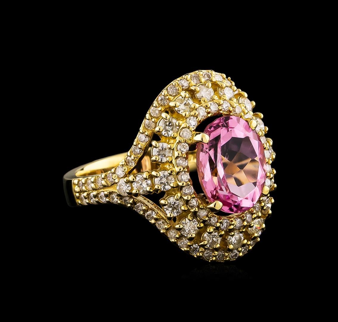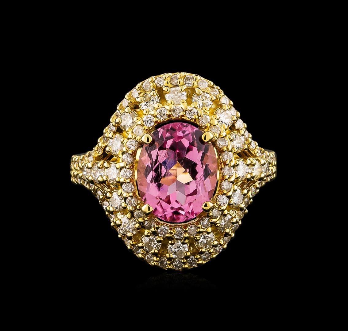 One electronically tested 14KT yellow gold ladies combination cast & assembled ring with a bright polish finish. Condition is new. Identified with markings of "K14". Containing: One prong set oval modified brilliant cut natural kunzite, measuring 10.00 x 8.00 x 5.45mm, approximate weight of 2.81ct., clarity is eye clean, type I, light, very slightly grayish, reddish purple color, (GIA rP 3/3), cut is good. Twenty-Four prong set round brilliant cut diamonds, measuring 1.10 - 1.10 x 0.66mm (depth est.) approximate. Total Weight of 24 Stones = 0.12ct. Clarity: I-1 to I-2. Color: I - J, Cut is Good. Seventy-Six prong set round brilliant cut diamonds, measuring 2.20 - 1.30 x 1.05mm (depth est.) approximate. Total Weight of 76 Stones = 0.99ct. Clarity: I-1 to I-2. Color: I - J, Cut is Good. Colored gemstones are presumed to have been subjected to commonly used enhancement processes. All diamonds and colored gemstones are graded in the mounting, unless otherwise stated. Total Weight of Colored Stones 2.81ct. Total Weight of Diamonds 1.11ct. Total Weight of Ring 7.70 grams. GGL Appraised.