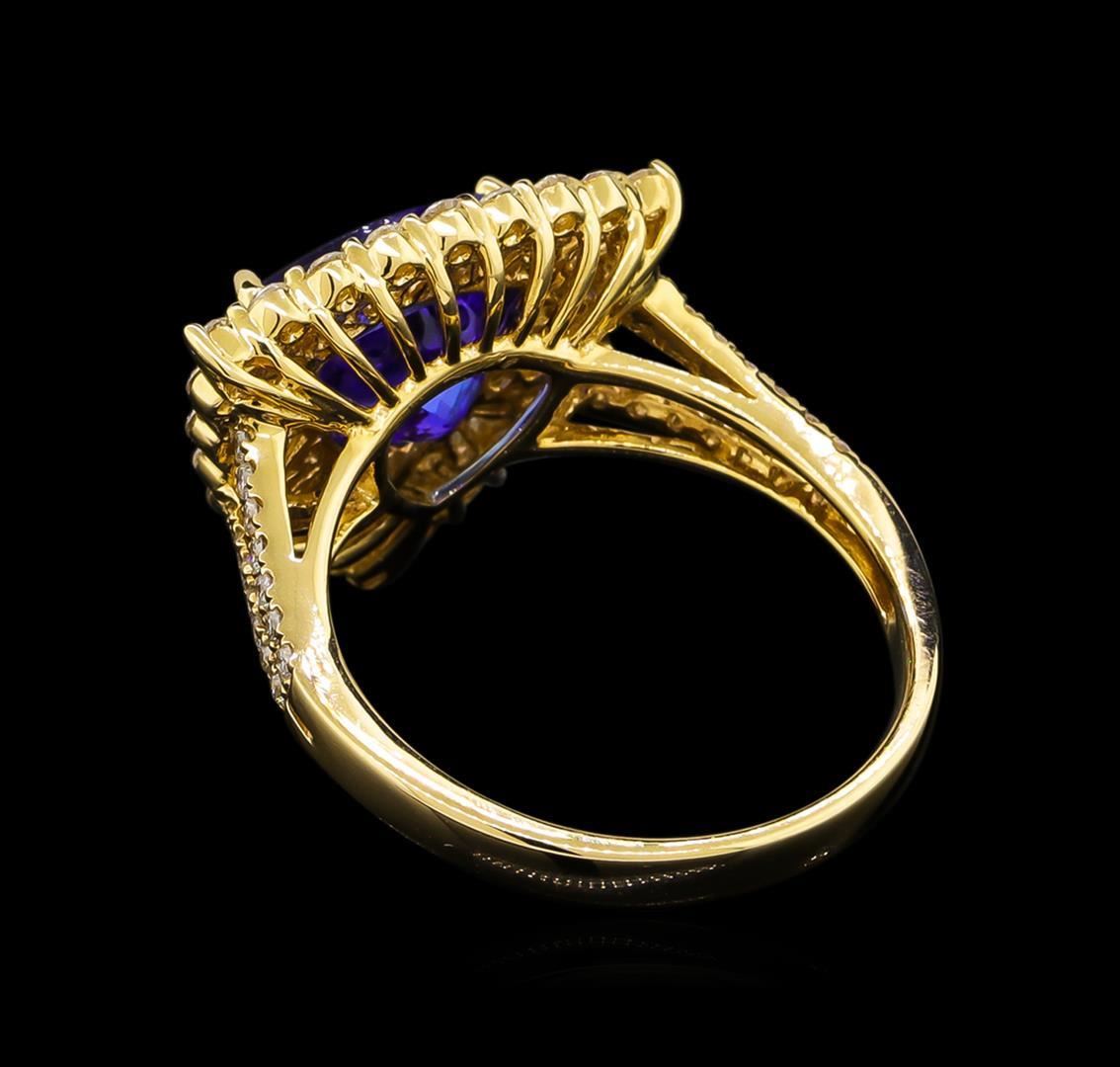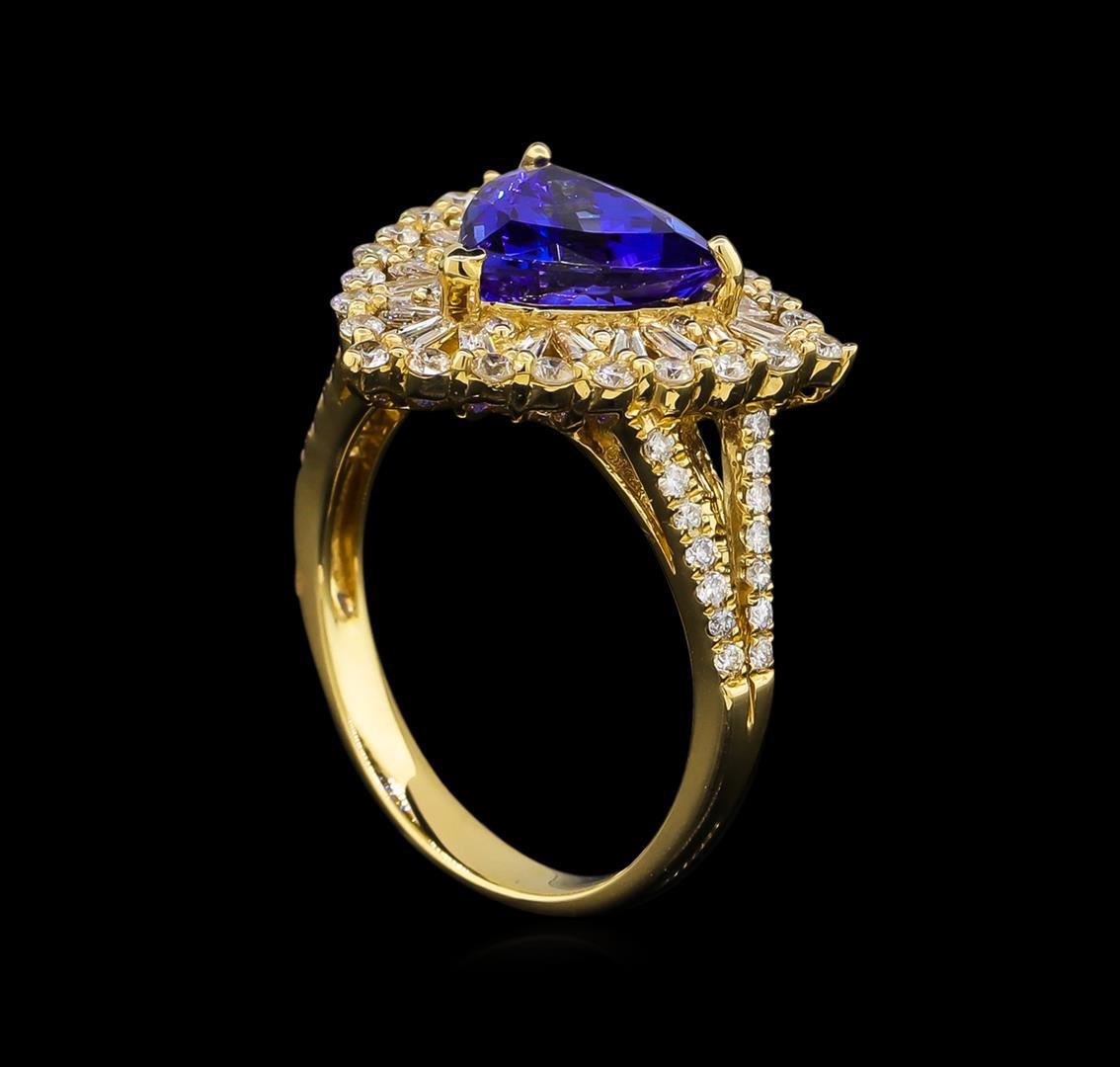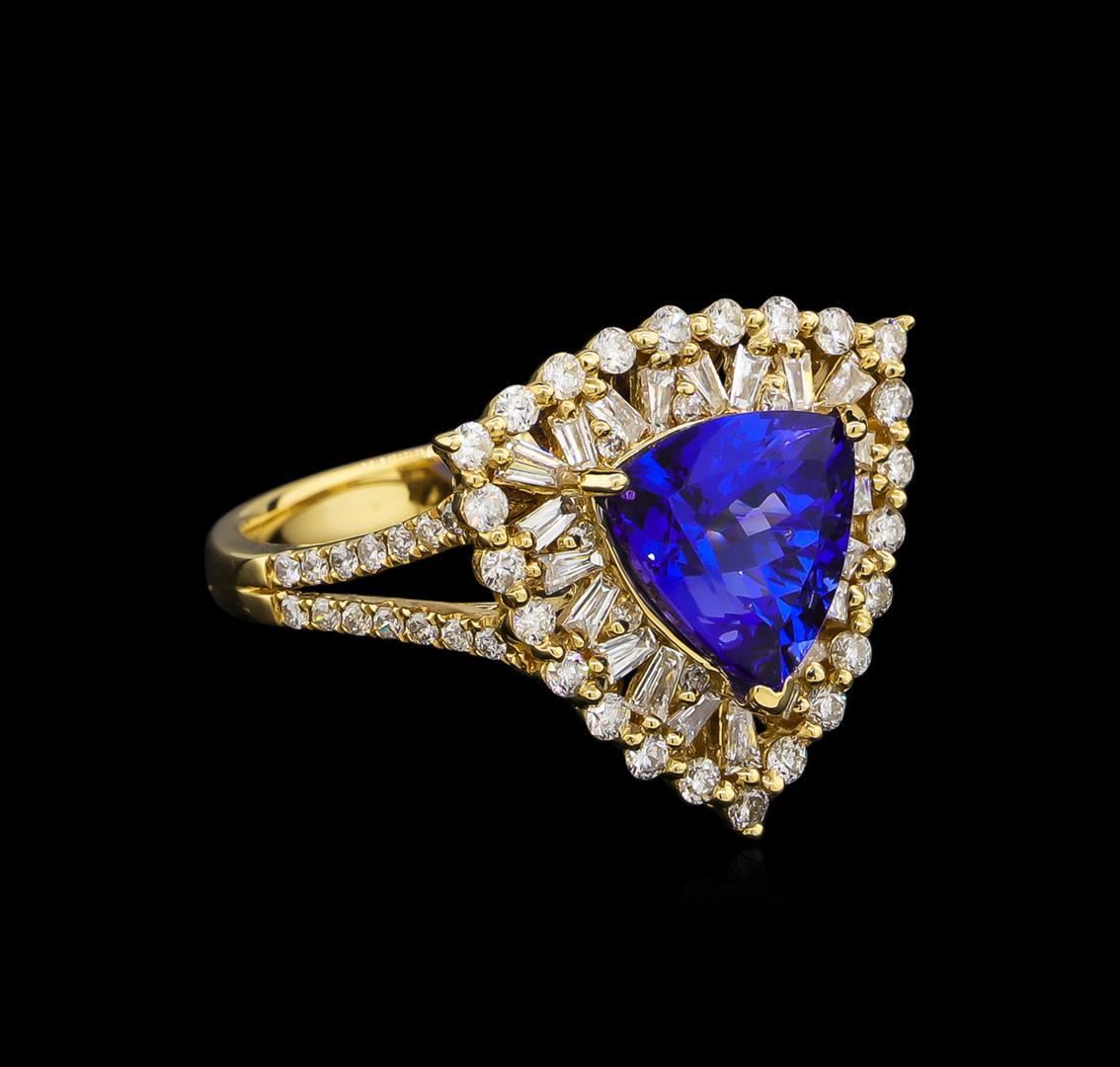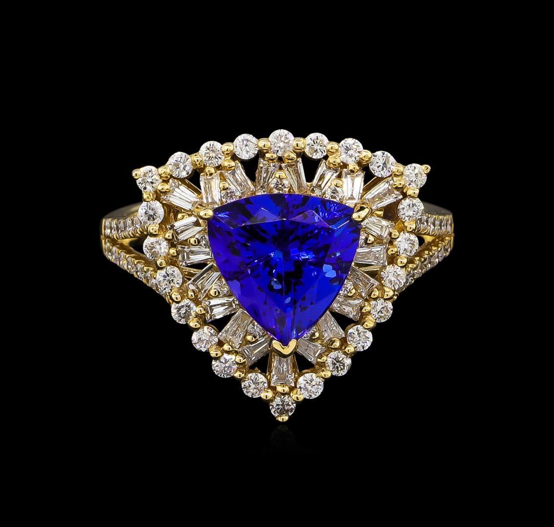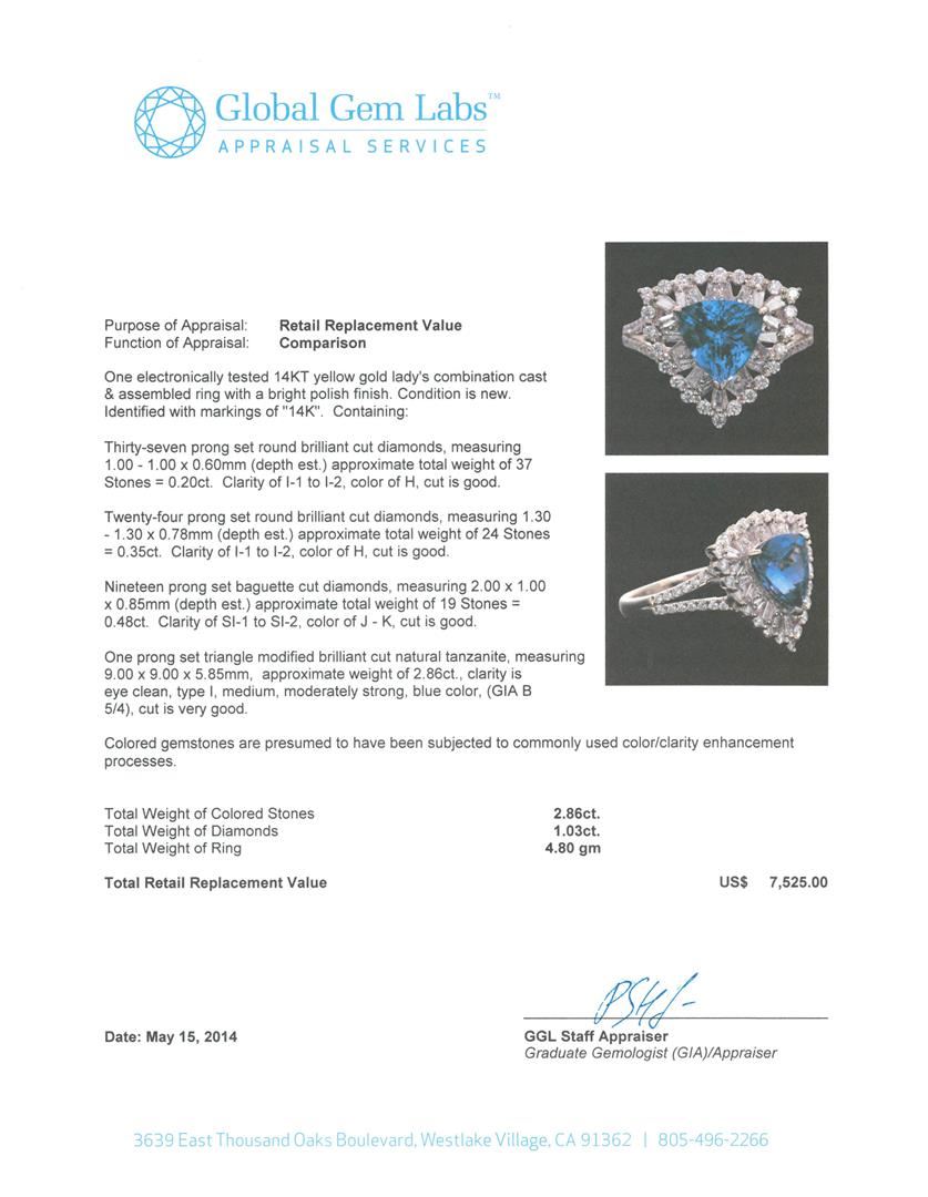 One electronically tested 14KT yellow gold Ladies combination cast & assembled ring with a bright polish finish. Identified with markings of "14K". Condition is new. Containing: Thirty-Seven prong set round brilliant cut diamonds, measuring 1.00 - 1.00 x 0.60mm (depth est.) approximate total weight of 37 Stones = 0.20ct. Clarity of I-1 to I-2, Color of H, Cut is Good. Twenty-Four prong set round brilliant cut diamonds, measuring 1.30 - 1.30 x 0.78mm (depth est.) approximate total weight of 24 Stones = 0.35ct. Clarity of I-1 to I-2, Color of H, Cut is Good. Nineteen prong set baguette cut diamonds, measuring 2.00 x 1.00 x 0.85mm (depth est.) approximate total weight of 19 Stones = 0.48ct. Clarity of SI-1 to SI-2, Color of J - K, Cut is Good. One prong set triangle modified brilliant cut natural tanzanite, measuring 9.00 x 9.00 x 5.85mm, approximate weight of 2.86ct., clarity is eye clean, type I, medium, moderately strong, blue color, (GIA B 5/4), cut is very good. Colored gemstones are presumed to have been subjected to commonly used color/clarity enhancement processes. Total Weight of Colored Stones 2.86ct. Total Weight of Diamonds 1.03ct. Total Weight of Ring 4.80 grams. GGL Appraised.
