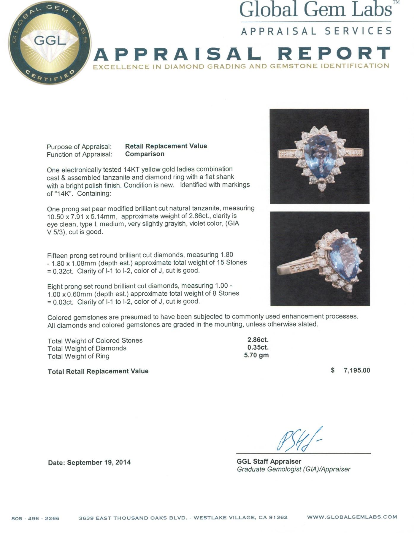 One electronically tested 14KT yellow gold ladies combination cast & assembled tanzanite and diamond ring with a flat shank with a bright polish finish. Identified with markings of "14K". Condition is new. Containing: One prong set pear modified brilliant cut natural tanzanite, measuring 10.50 x 7.91 x 5.14mm, approximate weight of 2.86ct., clarity is eye clean, type I, medium, very slightly grayish, violet color, (GIA V 5/3), cut is good. Fifteen prong set round brilliant cut diamonds, measuring 1.80 - 1.80 x 1.08mm (depth est.) approximate total weight of 15 Stones = 0.32ct. Clarity: I-1 to I-2. Color: J, Cut is Good. Eight prong set round brilliant cut diamonds, measuring 1.00 - 1.00 x 0.60mm (depth est.) approximate total weight of 8 Stones = 0.03ct. Clarity: I-1 to I-2. Color: J, Cut is Good. Colored gemstones are presumed to have been subjected to commonly used enhancement processes. All diamonds and colored gemstones are graded in the mounting, unless otherwise stated. Total Weight of Colored Stones 2.86ct. Total Weight of Diamonds 0.35ct. Total Weight of Ring 5.70 grams. GGL Appraised.