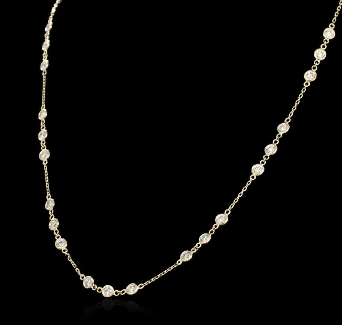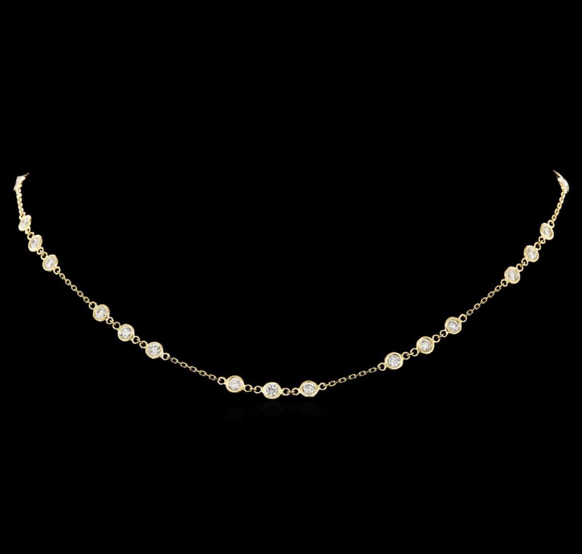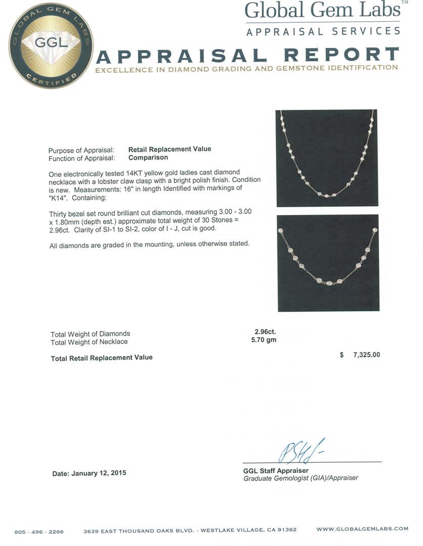 One electronically tested 14KT yellow gold ladies cast diamond necklace with a lobster claw clasp with a bright polish finish. Measurements: 16" in length Identified with markings of "K14". Condition is new. Containing: Thirty bezel set round brilliant cut diamonds, measuring 3.00 - 3.00 x 1.80mm (depth est.) approximate total weight of 30 Stones = 2.96ct. Clarity: SI-1 to SI-2. Color: I - J, Cut is Good. All diamonds are graded in the mounting, unless otherwise stated. Total Weight of Diamonds 2.96ct. Total Weight of Necklace 5.70 grams. GGL Appraised.