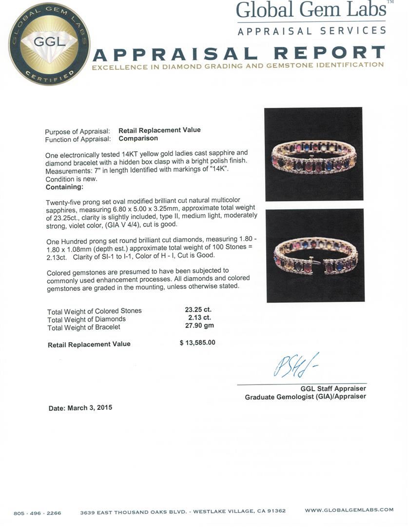 One electronically tested 14KT yellow gold ladies cast sapphire and diamond bracelet with a hidden box clasp with a bright polish finish. Measurements: 7" in length Identified with markings of "14K". Condition is new. Containing: Twenty-five prong set oval modified brilliant cut natural multicolor sapphires, measuring 6.80 x 5.00 x 3.25mm, approximate total weight of 23.25ct., clarity is slightly included, type II, medium light, moderately strong, violet color, (GIA V 4/4), cut is good. One Hundred prong set round brilliant cut diamonds, measuring 1.80 - 1.80 x 1.08mm (depth est.) approximate total weight of 100 Stones = 2.13ct. Clarity: SI-1 to I-1. Color: H - I, Cut is Good. Colored gemstones are presumed to have been subjected to commonly used enhancement processes. All diamonds and colored gemstones are graded in the mounting, unless otherwise stated. Total Weight of Colored Stones 23.25ct. Total Weight of Diamonds 2.13ct. Total Weight of Bracelet 27.90 grams. GGL Appraised.