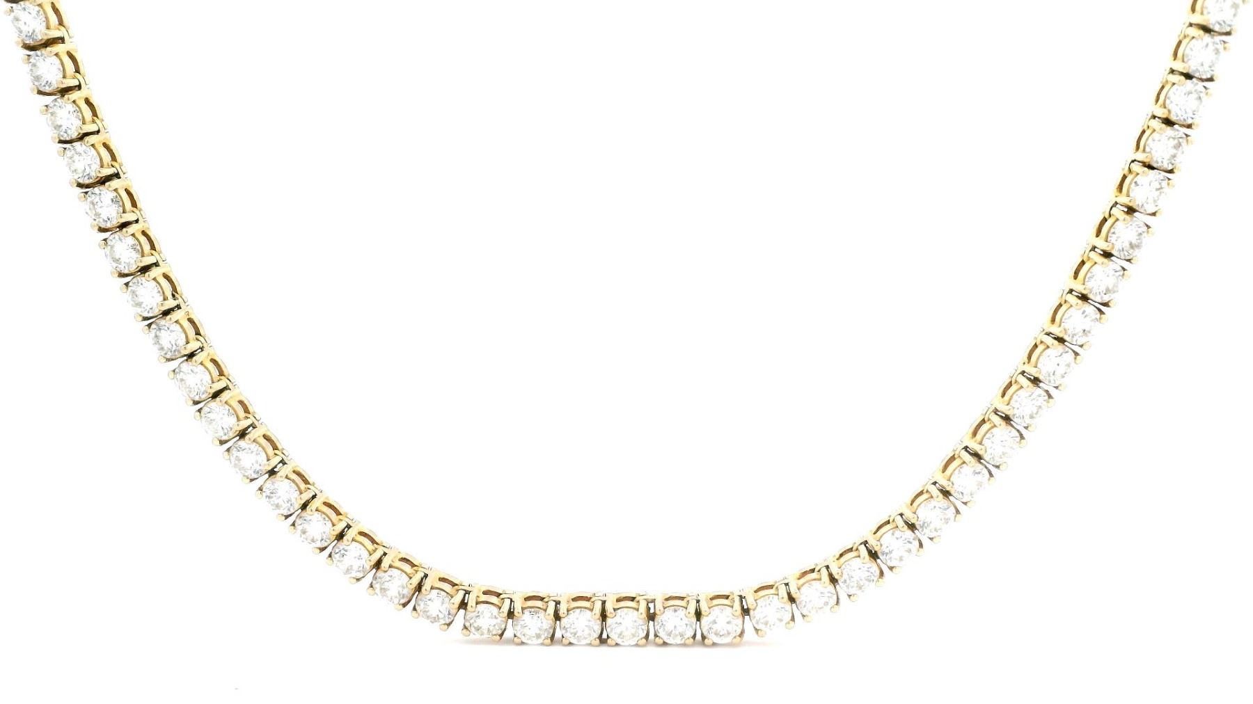 This exquisite 14KT yellow gold eternity necklace features a timeless design with a secure tongue clasp and fold-under safety. The piece showcases 158 round brilliant cut diamonds, totaling an impressive 29.50 carats, meticulously prong-set along the entire length of the 27-inch chain. Each diamond is graded H-I in color and VS-1 to SI-1 in clarity, exhibiting exceptional brilliance and fire. The basket motif setting enhances the structural integrity while maintaining a refined and elegant look.