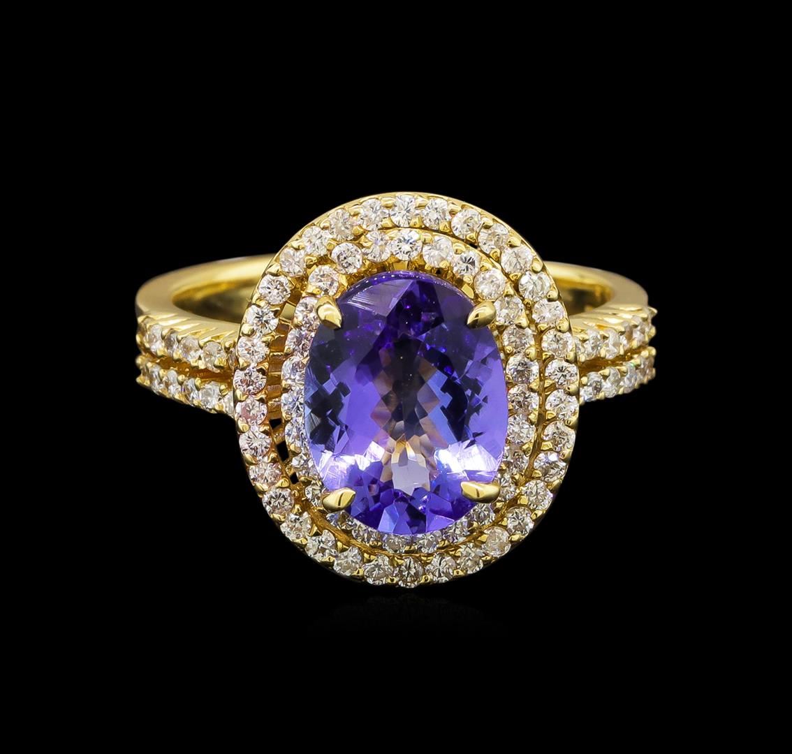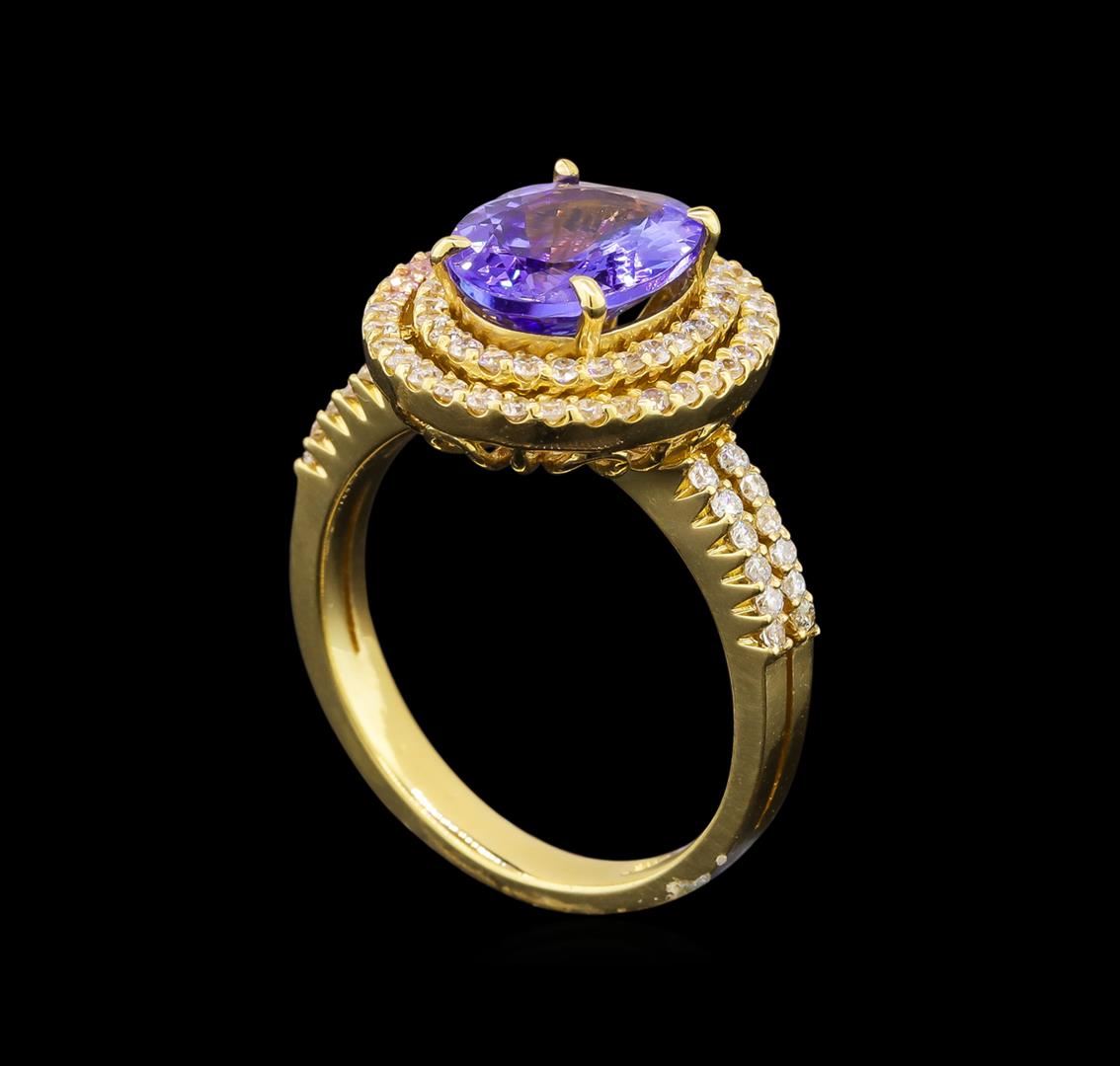 One electronically tested 14KT yellow gold ladies cast tanzanite and diamond ring with a bright polish finish. Identified with markings of "14K". Condition is new. Containing: One prong set oval modified brilliant cut natural tanzanite, measuring 10.30 x 8.00 x 5.21mm, approximate weight of 3.02ct., clarity is eye clean, type I, medium light, very slightly grayish, violet color, (GIA V 4/3), cut is very good. Eighty-Four prong set round brilliant cut diamonds, measuring 1.20 - 1.20 x 0.72mm (depth est.) approximate total weight of 84 Stones = 0.53ct. Clarity: I-1 to I-2. Color: I - J, Cut is Good. Colored gemstones are presumed to have been subjected to commonly used enhancement processes. All diamonds and colored gemstones are graded in the mounting, unless otherwise stated. Total Weight of Colored Stones 3.02ct. Total Weight of Diamonds 0.53ct. Total Weight of Ring 5.80 grams. GGL Appraised.