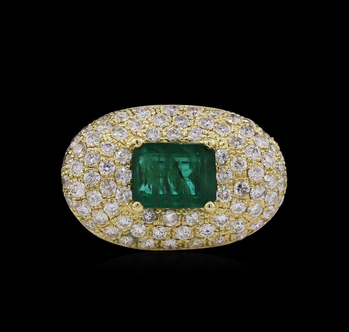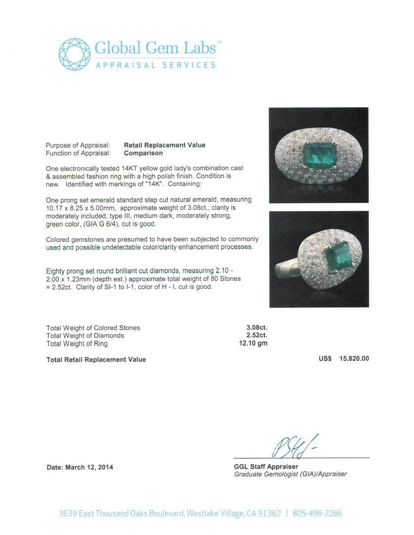 One electronically tested 14KT yellow gold Ladies combination cast & assembled fashion ring with a high polish finish. Condition is new. Identified with markings of "14K". Containing: One prong set emerald standard step cut natural emerald, measuring 10.17 x 8.25 x 5.00mm, approximate weight of 3.08ct., clarity is moderately included, type III, medium dark, moderately strong, green color, (GIA G 6/4), cut is good. Colored gemstones are presumed to have been subjected to commonly used and possible undetectable color/clarity enhancement processes. Eighty prong set round brilliant cut diamonds, measuring 2.10 - 2.00 x 1.23mm (depth est.) approximate total weight of 80 Stones = 2.52ct. Clarity of SI-1 to I-1, Color of H - I, Cut is Good. Total Weight of Colored Stones 3.08ct. Total Weight of Diamonds 2.52ct. Total Weight of Ring 12.10 grams. GGL Appraised.