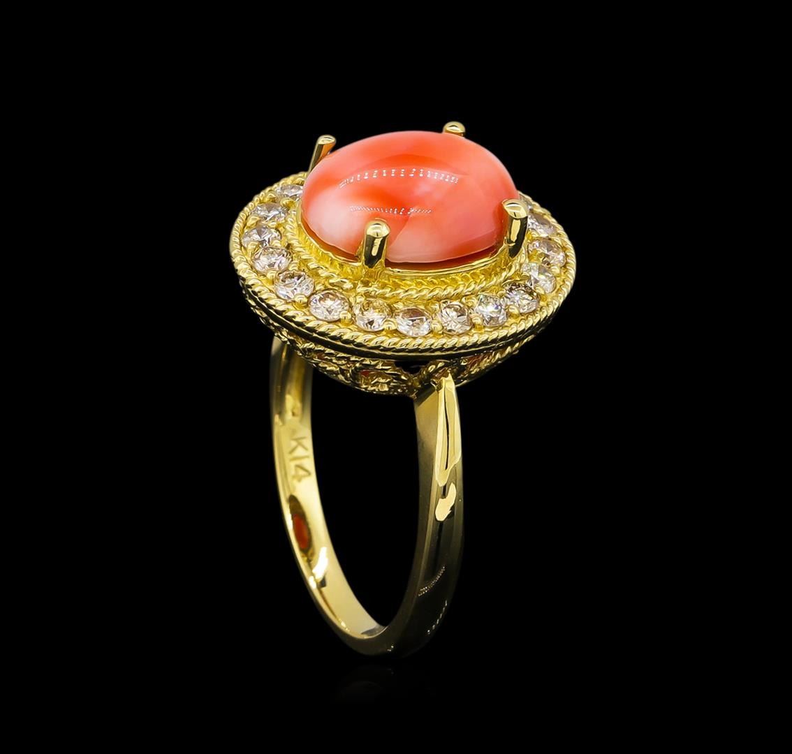 One electronically tested 14KT yellow gold ladies cast coral and diamond ring with a bright and milgrain finish. Condition is new, good workmanship. The featured coral is set within a diamond lattice gallery, completed by a two millimeter wide band. Identified with markings of "K14". Containing: One prong set oval cabochon cut natural salmon coral, measuring 10.90 x 9.00 x 4.50mm, approximate weight of 3.16ct., clarity is severely included, medium light, moderately strong, reddish orange color, (GIA rO 4/4), cut is good. Transmitting light very diffusely, opaque. Naturally occurring internal & external characteristics are present. Graded in the setting. Coral (Corallium Japonicum) is formed undersea by microscopic animals called coral polyps. These tiny, creatures form minute, hard shells. As a colony grows, it takes on complex branching, tree-like forms which allows the maximum number of polyps to be fed by the nutrients in the water. It grows about one quarter inch per year. This color of coral is commonly treated to improve or change the color and stability. Evidence that may confirm this is typically lacking. Twenty bead set round brilliant cut diamonds, measuring 2.00 - 1.90 x 1.17mm (depth est.) approximate. Total Weight of 20 Stones = 0.64ct. Graded in the setting. Clarity: SI-1 to I-1. Color: G - I. Total Weight of Colored Stones 3.16ct. Total Weight of Diamonds 0.64ct. Total Weight of Ring 5.80 grams. AIG Appraised.