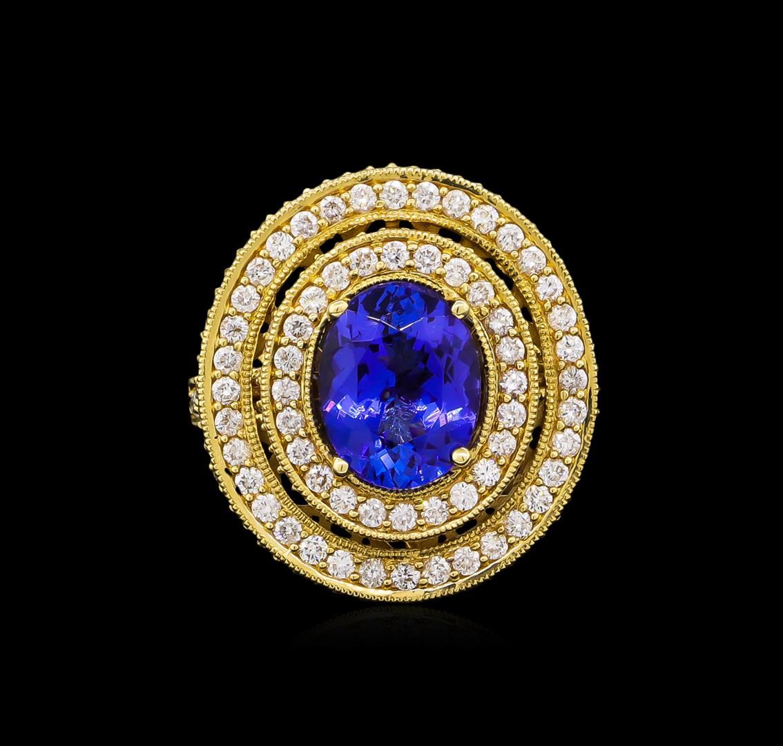 One electronically tested 14KT yellow gold Ladies combination cast & assembled ring with a bright polish finish. Condition is new. Identified with markings of "14K". Containing: One Hundred Eighty-Two prong set round brilliant cut diamonds, measuring 1.40 - 1.40 x 0.84mm (depth est.) approximate. Total Weight of 182 Stones = 2.03ct. Clarity: I-1 to I-2. Color: H - I, Cut is Good. One prong set oval modified brilliant cut natural tanzanite, measuring 10.90 x 8.10 x 5.27mm, exact weight 3.40 ct., clarity is eye clean, type I, medium, moderately strong, bluish violet color, (GIA bV 5/4), cut is very good. Colored gemstones are presumed to have been subjected to commonly used and possible undetectable color/clarity enhancement processes. Total Weight of Colored Stones 3.40 ct. Total Weight of Diamonds 2.03ct. Total Weight of Ring 9.90 grams. GGL Appraised.