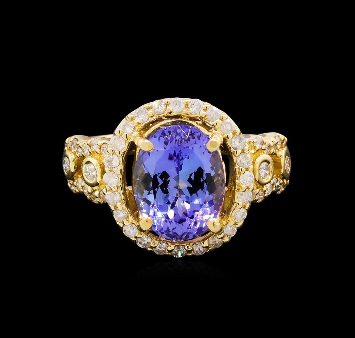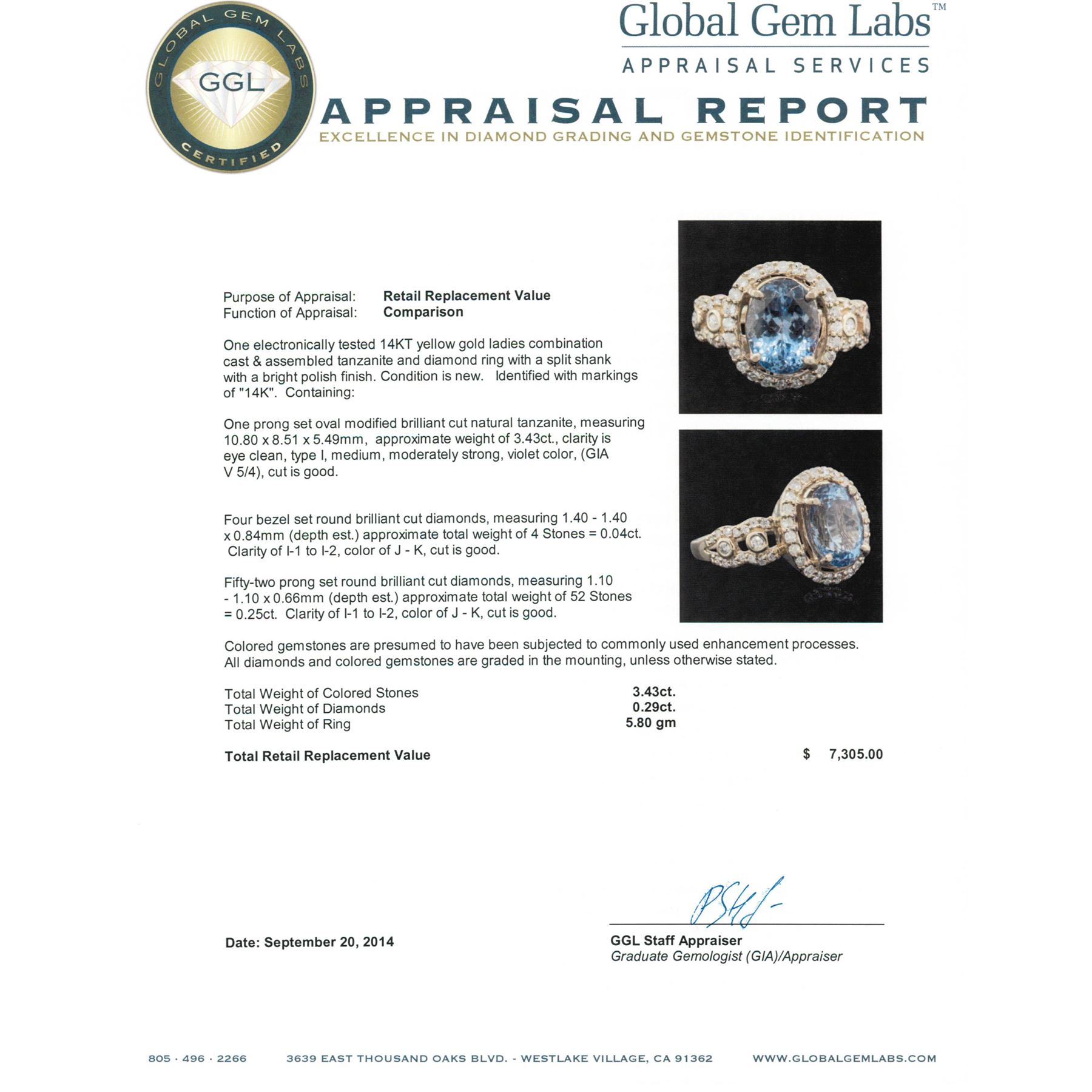 One electronically tested 14KT yellow gold ladies combination cast & assembled tanzanite and diamond ring with a split shank with a bright polish finish. Identified with markings of "14K". Condition is new. Containing: One prong set oval modified brilliant cut natural tanzanite, measuring 10.80 x 8.51 x 5.49mm, approximate weight of 3.43ct., clarity is eye clean, type I, medium, moderately strong, violet color, (GIA V 5/4), cut is good. Four bezel set round brilliant cut diamonds, measuring 1.40 - 1.40 x 0.84mm (depth est.) approximate total weight of 4 Stones = 0.04ct. Clarity: I-1 to I-2. Color: J - K, Cut is Good. Fifty-Two prong set round brilliant cut diamonds, measuring 1.10 - 1.10 x 0.66mm (depth est.) approximate total weight of 52 Stones = 0.25ct. Clarity: I-1 to I-2. Color: J - K, Cut is Good. Colored gemstones are presumed to have been subjected to commonly used enhancement processes. All diamonds and colored gemstones are graded in the mounting, unless otherwise stated. Total Weight of Colored Stones 3.43ct. Total Weight of Diamonds 0.29ct. Total Weight of Ring 5.80 grams. GGL Appraised.