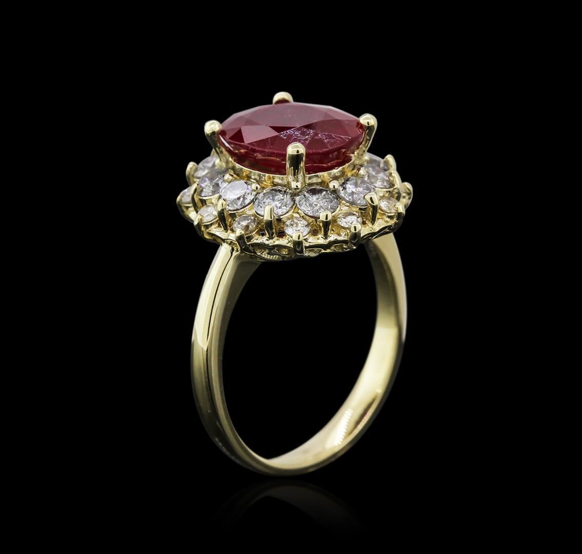 One electronically tested 14KT yellow gold ladies cast ruby and diamond ring with a bright polish finish. Identified with markings of "K14". Condition is new. Containing: One prong set oval modified brilliant cut natural ruby, measuring 10.79 x 8.88 x 4.41mm, approximate weight of 3.55ct., clarity is heavily included, type II, medium dark, very slightly brownish, strongly purplish red color, (GIA stpR 6/3), cut is good. Twelve prong set round brilliant cut diamonds, measuring 3.00 - 3.00 x 1.80mm (depth est.) approximate total weight of 12 Stones = 1.19ct. Clarity: I-2 to I-3. Color: I - J, Cut is Good. Twelve prong set round brilliant cut diamonds, measuring 1.00 - 7.00 x 1.70mm (depth est.) approximate total weight of 12 Stones = 1.99ct. Clarity: SI-2 to I-1. Color: J - K, Cut is Good. Diamonds and colored gemstones are graded in the mounting, unless otherwise stated. Colored gemstones are presumed to have been subjected to commonly used enhancement processes. Total Weight of Colored Stones 3.55ct. Total Weight of Diamonds 3.18ct. Total Weight of Ring 6.60 grams. GGL Appraised.