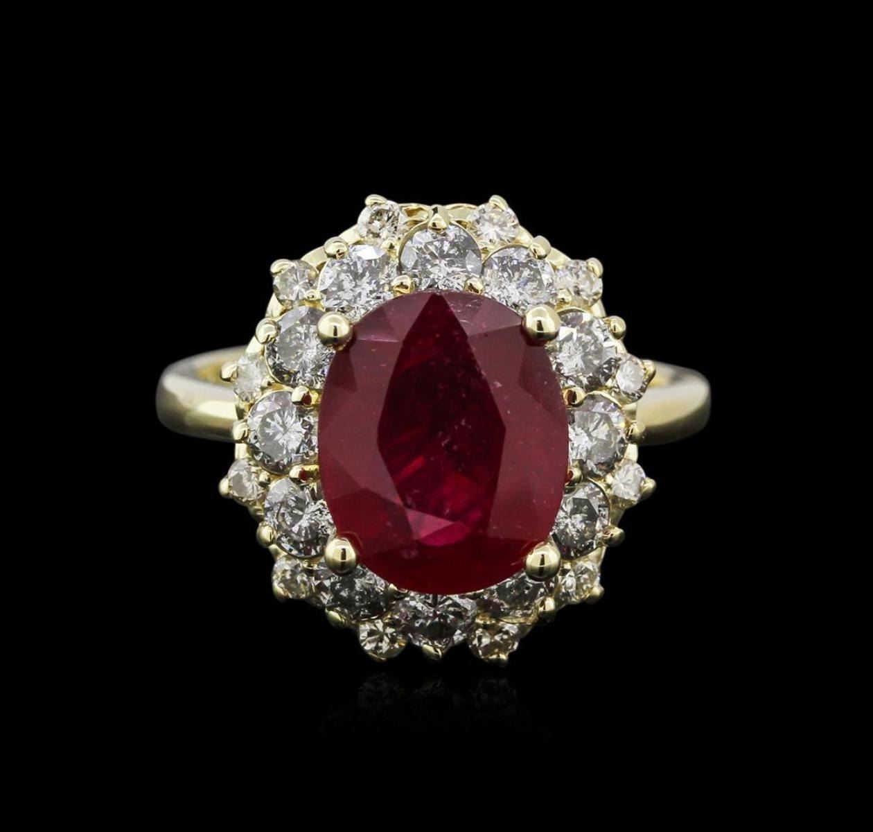 One electronically tested 14KT yellow gold ladies cast ruby and diamond ring with a bright polish finish. Identified with markings of "K14". Condition is new. Containing: One prong set oval modified brilliant cut natural ruby, measuring 10.79 x 8.88 x 4.41mm, approximate weight of 3.55ct., clarity is heavily included, type II, medium dark, very slightly brownish, strongly purplish red color, (GIA stpR 6/3), cut is good. Twelve prong set round brilliant cut diamonds, measuring 3.00 - 3.00 x 1.80mm (depth est.) approximate total weight of 12 Stones = 1.19ct. Clarity: I-2 to I-3. Color: I - J, Cut is Good. Twelve prong set round brilliant cut diamonds, measuring 1.00 - 7.00 x 1.70mm (depth est.) approximate total weight of 12 Stones = 1.99ct. Clarity: SI-2 to I-1. Color: J - K, Cut is Good. Diamonds and colored gemstones are graded in the mounting, unless otherwise stated. Colored gemstones are presumed to have been subjected to commonly used enhancement processes. Total Weight of Colored Stones 3.55ct. Total Weight of Diamonds 3.18ct. Total Weight of Ring 6.60 grams. GGL Appraised.