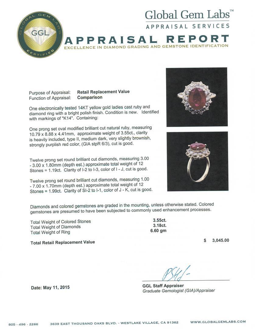 One electronically tested 14KT yellow gold ladies cast ruby and diamond ring with a bright polish finish. Identified with markings of "K14". Condition is new. Containing: One prong set oval modified brilliant cut natural ruby, measuring 10.79 x 8.88 x 4.41mm, approximate weight of 3.55ct., clarity is heavily included, type II, medium dark, very slightly brownish, strongly purplish red color, (GIA stpR 6/3), cut is good. Twelve prong set round brilliant cut diamonds, measuring 3.00 - 3.00 x 1.80mm (depth est.) approximate total weight of 12 Stones = 1.19ct. Clarity: I-2 to I-3. Color: I - J, Cut is Good. Twelve prong set round brilliant cut diamonds, measuring 1.00 - 7.00 x 1.70mm (depth est.) approximate total weight of 12 Stones = 1.99ct. Clarity: SI-2 to I-1. Color: J - K, Cut is Good. Diamonds and colored gemstones are graded in the mounting, unless otherwise stated. Colored gemstones are presumed to have been subjected to commonly used enhancement processes. Total Weight of Colored Stones 3.55ct. Total Weight of Diamonds 3.18ct. Total Weight of Ring 6.60 grams. GGL Appraised.