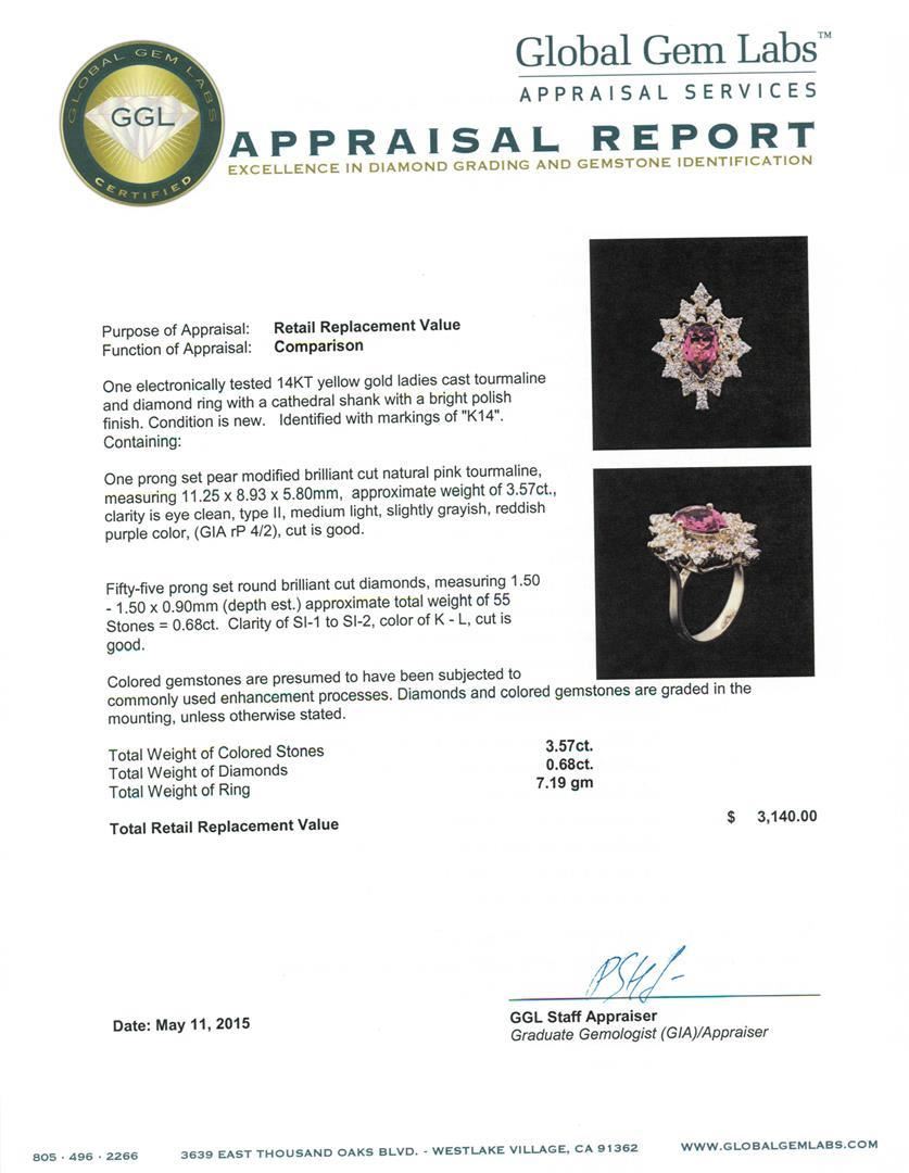 One electronically tested 14KT yellow gold ladies cast tourmaline and diamond ring with a cathedral shank with a bright polish finish. Identified with markings of "K14". Condition is new. Containing: One prong set pear modified brilliant cut natural pink tourmaline, measuring 11.25 x 8.93 x 5.80mm, approximate weight of 3.57ct., clarity is eye clean, type II, medium light, slightly grayish, reddish purple color, (GIA rP 4/2), cut is good. Fifty-Five prong set round brilliant cut diamonds, measuring 1.50 - 1.50 x 0.90mm (depth est.) approximate total weight of 55 Stones = 0.68ct. Clarity: SI-1 to SI-2. Color: K - L, Cut is Good. Colored gemstones are presumed to have been subjected to commonly used enhancement processes. Diamonds and colored gemstones are graded in the mounting, unless otherwise stated. Total Weight of Colored Stones 3.57ct. Total Weight of Diamonds 0.68ct. Total Weight of Ring 7.19 grams. GGL Appraised.