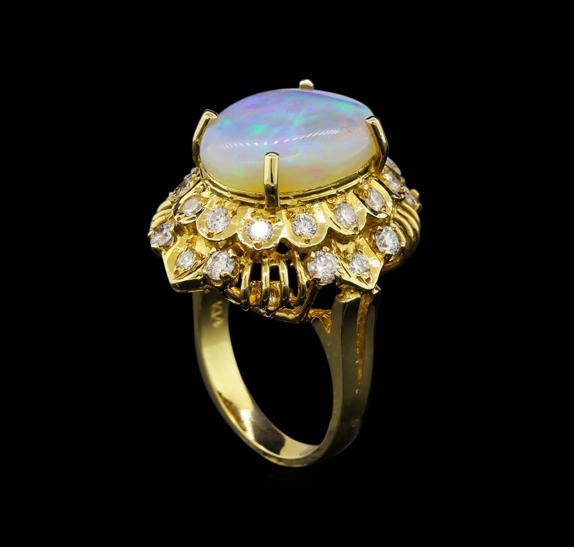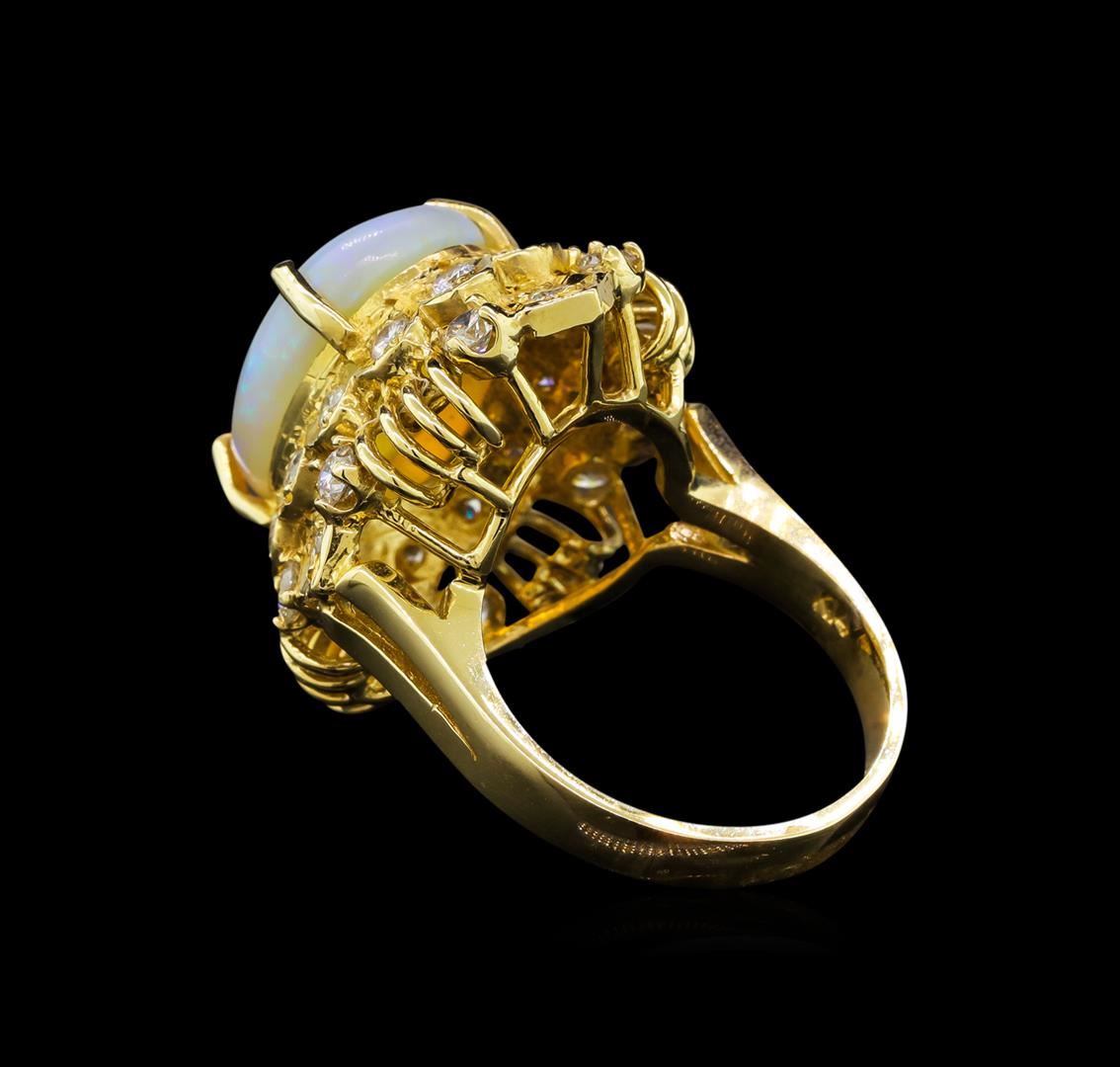 One electronically tested 14KT yellow gold ladies cast opal and diamond ring with a bright polish finish. Identified with markings of "14K". Condition is new. Containing: One white opal that is cut in a oval shape and is prong set, measuring 16.00 mm long x 11.00 mm wide, and 4.70 mm thick and the approximate weight is 3.68 carats. The opal has a somewhat bright, blue-green play of color (fire) in a flashfire pattern; a medium dome; a good cut; no inclusions; consistent in its brightness and pattern; and is somewhat directional. Twenty-Seven prong set round brilliant cut diamonds, measuring 2.80 - 2.00 x 1.44mm (depth est.) approximate total weight of 27 Stones = 1.37ct. Clarity: SI-1 to SI-2. Color: I - J, Cut is Good. Colored gemstones are presumed to have been subjected to commonly used enhancement processes. All diamonds and colored gemstones are graded in the mounting, unless otherwise stated. Total Weight of Diamonds 1.37ct. Total Weight of Opals 3.68ct. Total Weight of Ring 11.40 grams. GGL Appraised.