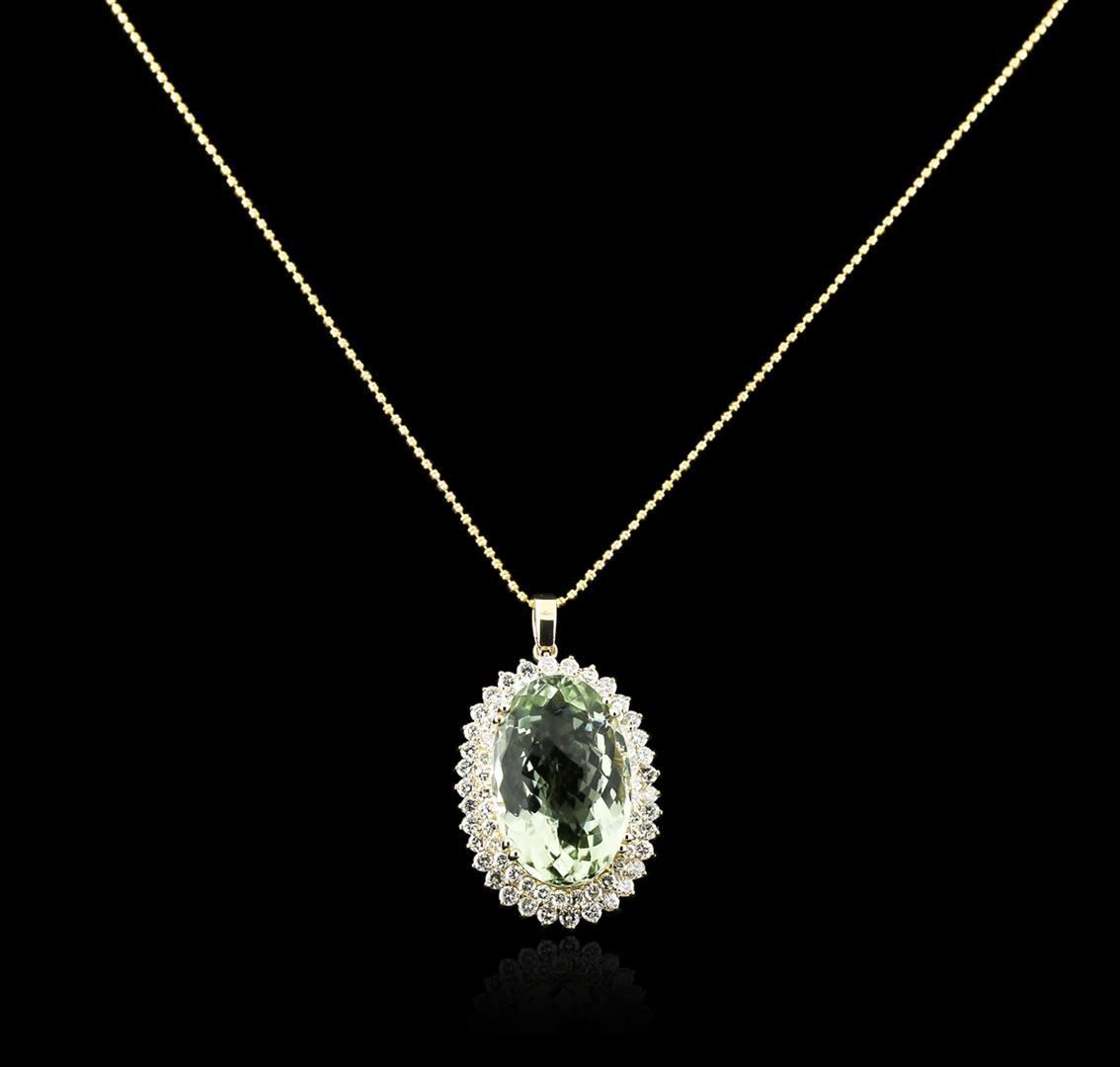 One electronically tested 14KT yellow gold ladies combination cast & assembled amethyst and diamond pendant & chain 18.0" long, thin double bead link with a spring ring clasp with a bright polish finish. Identified with markings of "14K". Condition is new. Containing: One prong set oval modified mixed cut natural amethyst, measuring 27.00 x 18.00 x 11.70mm, approximate weight of 31.76ct., clarity is eye clean, light, very slightly grayish, green color, (GIA gB 3/3), cut is very good. Sixty-Eight prong set round brilliant cut diamonds, measuring 2.50 - 2.00 x 1.35mm (depth est.) approximate total weight of 68 Stones = 2.83ct. Clarity: SI-2 to I-2. Color: K - L, Cut is Good. Diamonds and colored gemstones are graded in the mounting, unless otherwise stated. Colored gemstones are presumed to have been subjected to commonly used enhancement processes. Total Weight of Colored Stones 31.76ct. Total Weight of Diamonds 2.83ct. Total Weight of Pendant & Chain 20.00 grams. GGL Appraised.