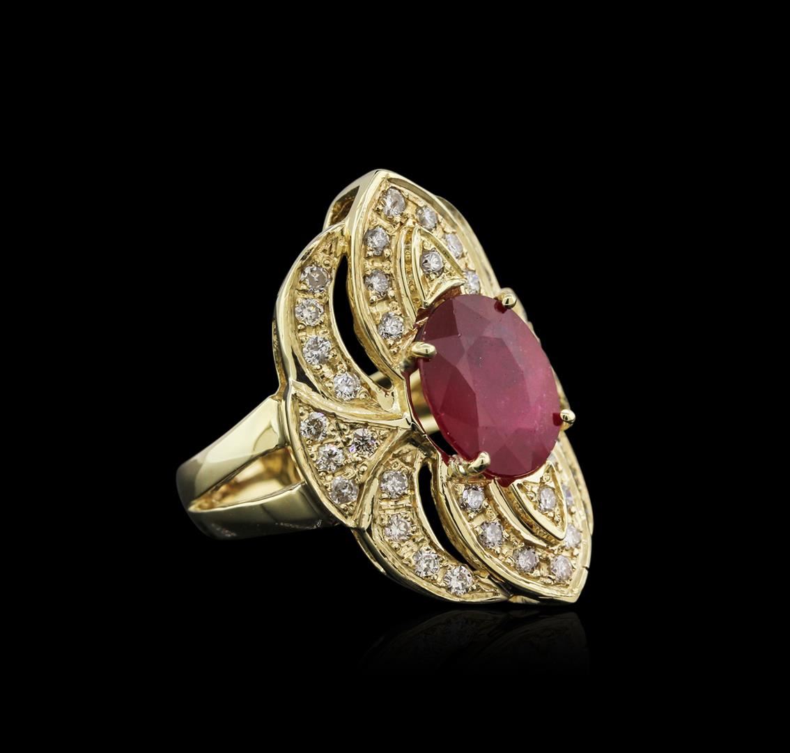 One electronically tested 14KT yellow gold ladies cast ruby and diamond ring with a bright polish finish. Identified with markings of "14K". Condition is new. Containing: One prong set oval modified brilliant cut natural ruby, measuring 11.00 x 9.10 x 4.83mm, approximate weight of 4.06ct., clarity is heavily included, type II, medium dark, very slightly brownish, strongly purplish red color, (GIA stpR 6/3), cut is good. Forty prong set round brilliant cut diamonds, measuring 1.50 - 1.50 x 0.90mm (depth est.) approximate total weight of 40 Stones = 0.49ct. Clarity: SI-1 to SI-2. Color: I - J, Cut is Good. All diamonds and colored gemstones are graded in the mounting, unless otherwise stated. Colored gemstones are presumed to have been subjected to commonly used enhancement processes. Total Weight of Colored Stones 4.06ct. Total Weight of Diamonds 0.49ct. Total Weight of Ring 9.60 grams. GGL Appraised at $3,250.00.