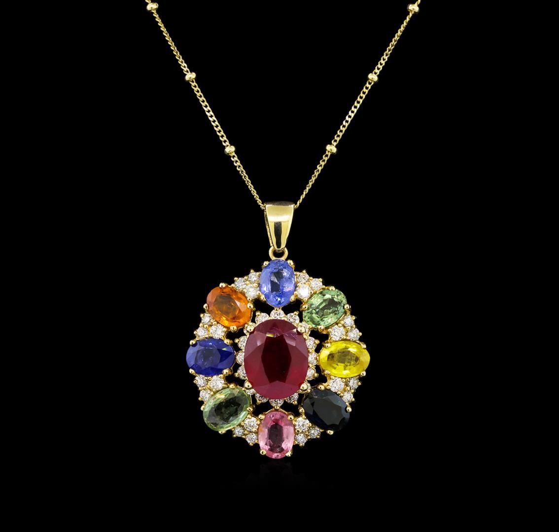 One electronically tested 14KT yellow gold ladies cast ruby, sapphire and diamond pendant & chain 18.0" long, with a spring ring clasp with a bright polish finish. Identified with markings of "14K". Condition is new. Containing: One prong set oval modified brilliant cut natural ruby, measuring 10.60 x 8.40 x 5.46mm, approximate weight of 4.42ct., clarity is heavily included, medium dark, moderately strong, purple red color, (GIA PR 6/4), cut is good. Eight prong set oval modified brilliant cut natural multicolor sapphires, measuring 7.00 x 5.00 x 3.25mm, approximate total weight of 7.79ct., clarity is moderately included, type II, medium light, very slightly grayish, blue, green, orange, pink and yellow color, (GIA V 4/3), cut is good. Forty prong set round brilliant cut diamonds, measuring 1.90 - 1.50 x 1.02mm (depth est.) approximate total weight of 40 Stones = 0.97ct. Clarity: SI-1 to I-1. Color: H - J, Cut is Good. Colored gemstones are presumed to have been subjected to commonly used enhancement processes. All diamonds and colored gemstones are graded in the mounting, unless otherwise stated. Total Weight of Colored Stones 12.21ct. Total Weight of Diamonds 0.97ct. Total Weight of Pendant & Chain 9.30 grams. GGL Appraised at $5,045.00.