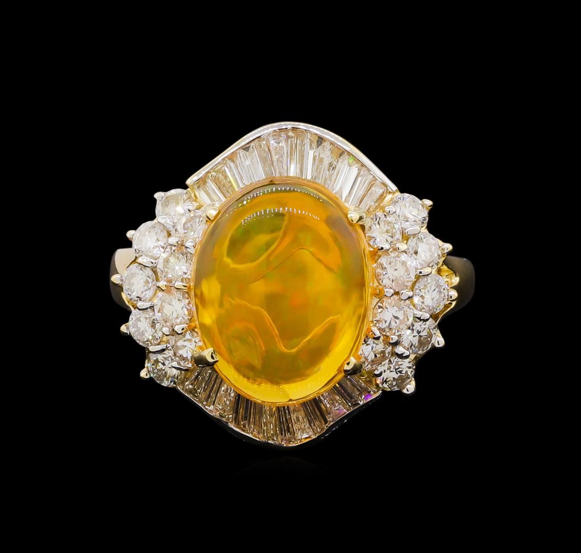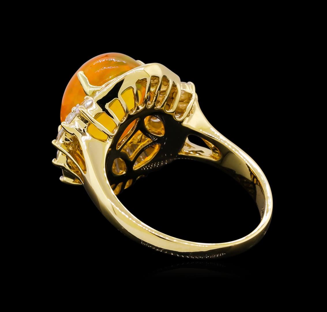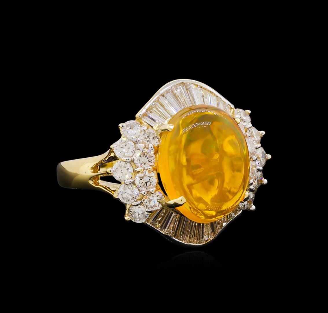 One electronically tested 14KT yellow gold ladies cast opal and diamond ring. The featured opal is set within a stylized diamond bezel supported by three-way split shoulders, completed by a two millimeter wide band. Bright polish finish with rhodium accents. Identified with markings of "14K". Condition is new, good workmanship. Containing: One jelly opal that is cut in a oval shaped cabochon and is prong set, measuring 12.00 mm long x 10.00 mm wide, and 5.48 mm thick and the approximate weight is 4.43 carats. The opal has a somewhat bright, orange-green play of color (fire) in a flashfire pattern; a high dome; a good cut; no inclusions; slight variation in base in its brightness and pattern; and is somewhat directional. Graded in the setting. Eighteen prong set round brilliant cut diamonds, measuring 2.30 - 2.20 x 1.35mm (depth est.) approximate total weight of 18 Stones = 0.85ct. Graded in the setting. Clarity: SI-2 to I-1. Color: F - H Twenty-Four channel set baguette cut diamonds, measuring from 2.40 x 1.10 x 0.77mm (depth est.) to 3.80 x 1.20 x 0.84mm (depth est.) approximate total weight of 24 Stones = 0.63ct. Graded in the setting. Clarity: VVS-2 to VS-2. Color: F - H. Total Weight of Diamonds 1.48ct. Total Weight of Opals 4.43ct. Total Weight of Ring 5.34 grams. AIG Appraised at $6,250.00.