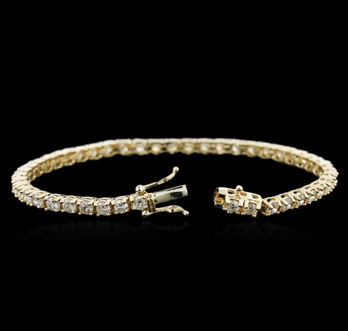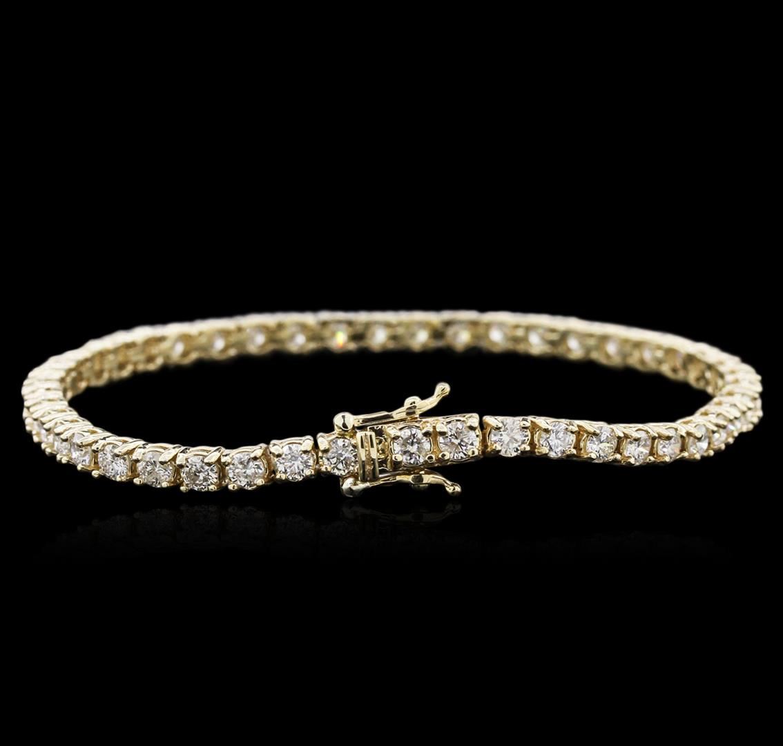 One electronically tested 14KT yellow gold ladies cast diamond tennis bracelet with a hidden box clasp with safety closer with a bright polish finish. Measurements: 7" in length Identified with markings of "14K". Condition is new. Containing: Forty-Six prong set round brilliant cut diamonds, measuring 3.00 - 3.00 x 1.80mm (depth est.) approximate total weight of 46 Stones = 4.60ct. Clarity: SI-2 to I-2. Color: J - K, Cut is Good. Diamonds are graded in the mounting, unless otherwise stated. Total Weight of Diamonds 4.60ct. Total Weight of Tennis Bracelet 10.60 grams. GGL Appraised at $5,945.00.