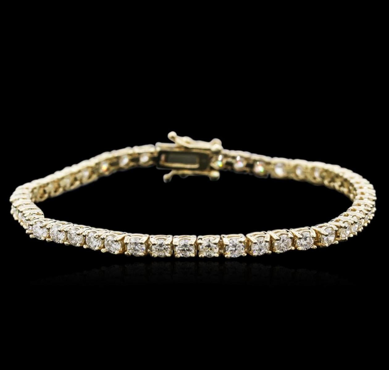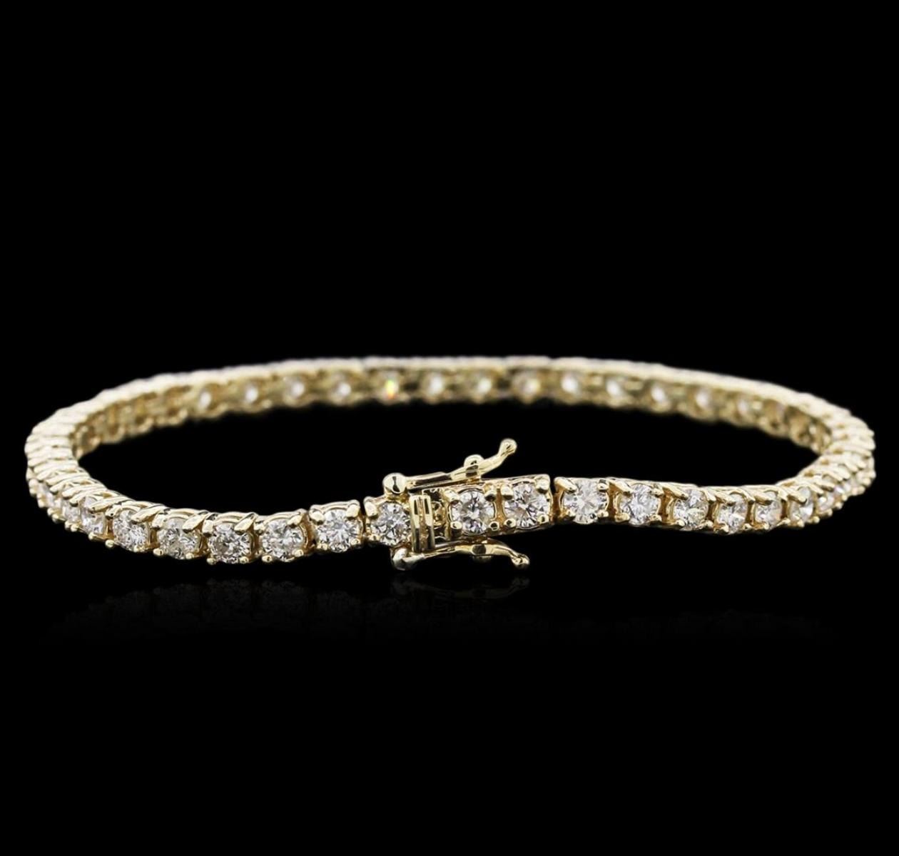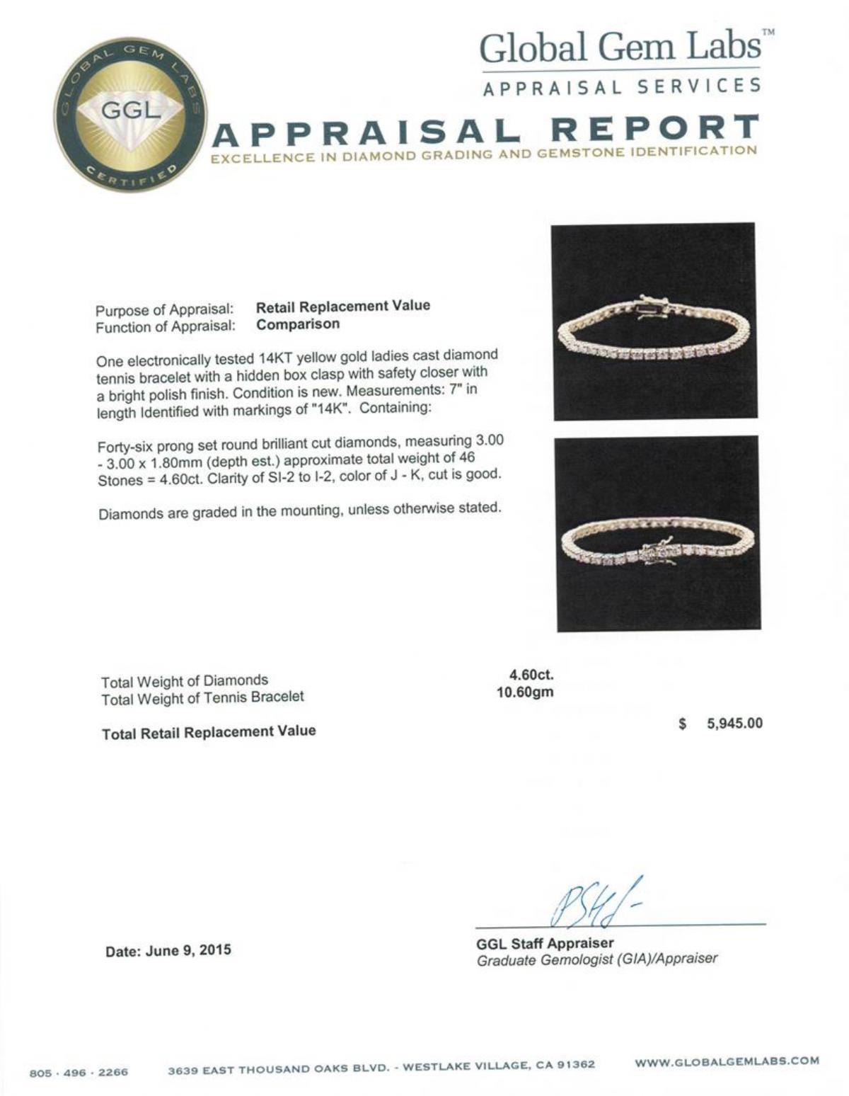 One electronically tested 14KT yellow gold ladies cast diamond tennis bracelet with a hidden box clasp with safety closer with a bright polish finish. Measurements: 7" in length Identified with markings of "14K". Condition is new. Containing: Forty-Six prong set round brilliant cut diamonds, measuring 3.00 - 3.00 x 1.80mm (depth est.) approximate total weight of 46 Stones = 4.60ct. Clarity: SI-2 to I-2. Color: J - K, Cut is Good. Diamonds are graded in the mounting, unless otherwise stated. Total Weight of Diamonds 4.60ct. Total Weight of Tennis Bracelet 10.60 grams. GGL Appraised at $5,945.00.