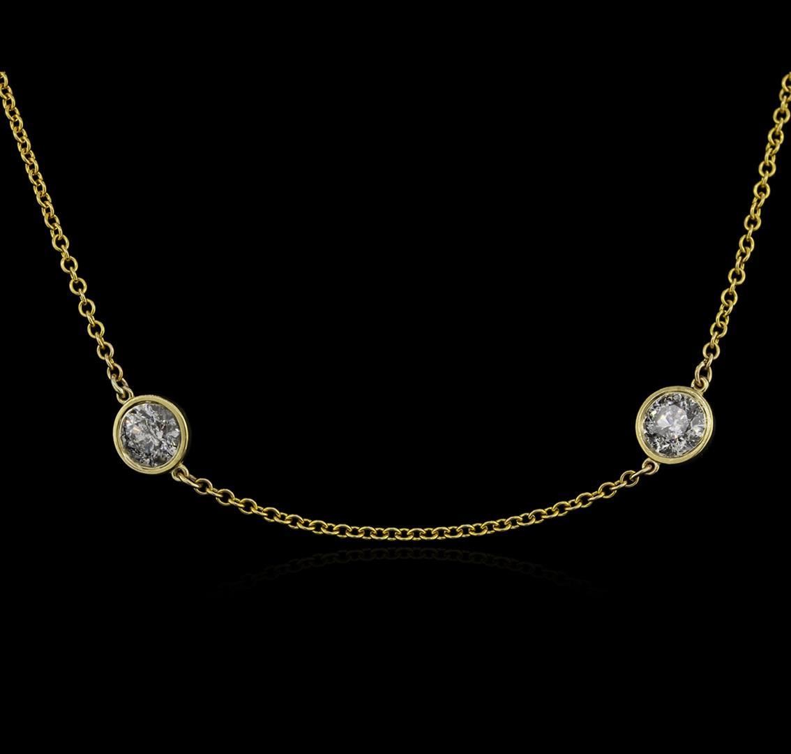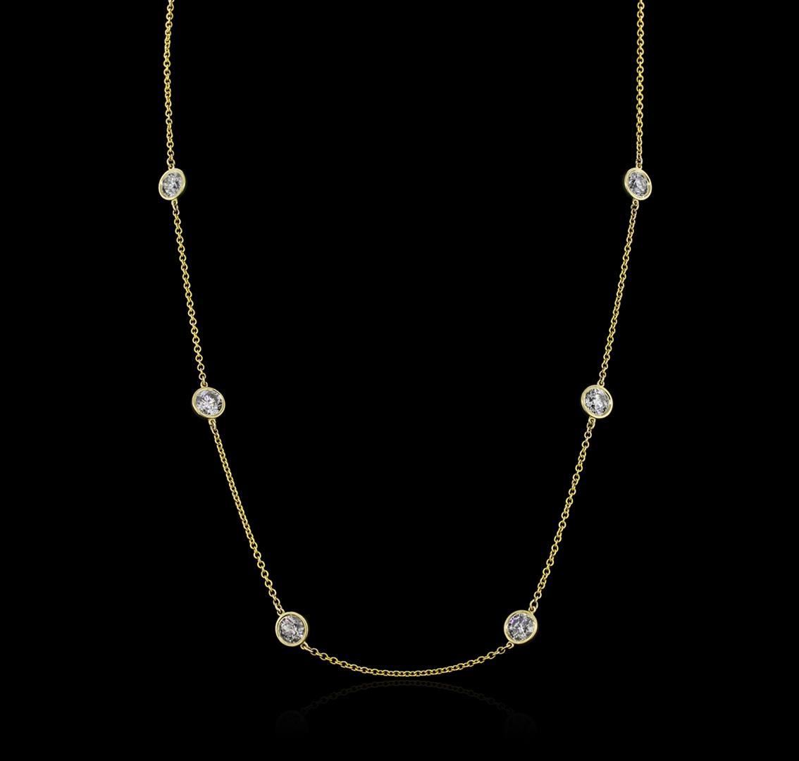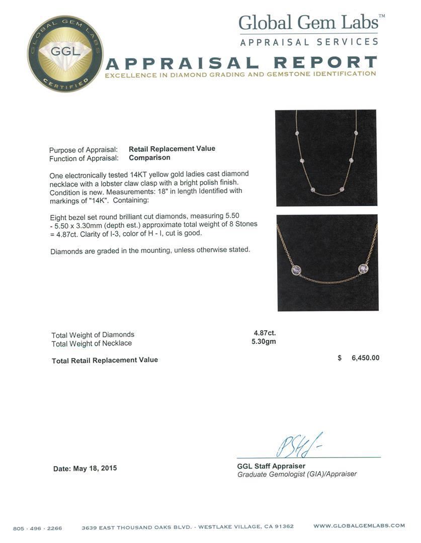 One electronically tested 14KT yellow gold ladies cast diamond necklace with a lobster claw clasp with a bright polish finish. Measurements: 18" in length Identified with markings of "14K". Condition is new. Containing: Eight bezel set round brilliant cut diamonds, measuring 5.50 - 5.50 x 3.30mm (depth est.) approximate total weight of 8 Stones = 4.87ct. Clarity: I-3. Color: H - I, Cut is Good. Diamonds are graded in the mounting, unless otherwise stated. Total Weight of Diamonds 4.87ct. Total Weight of Necklace 5.30 grams. GGL Appraised.