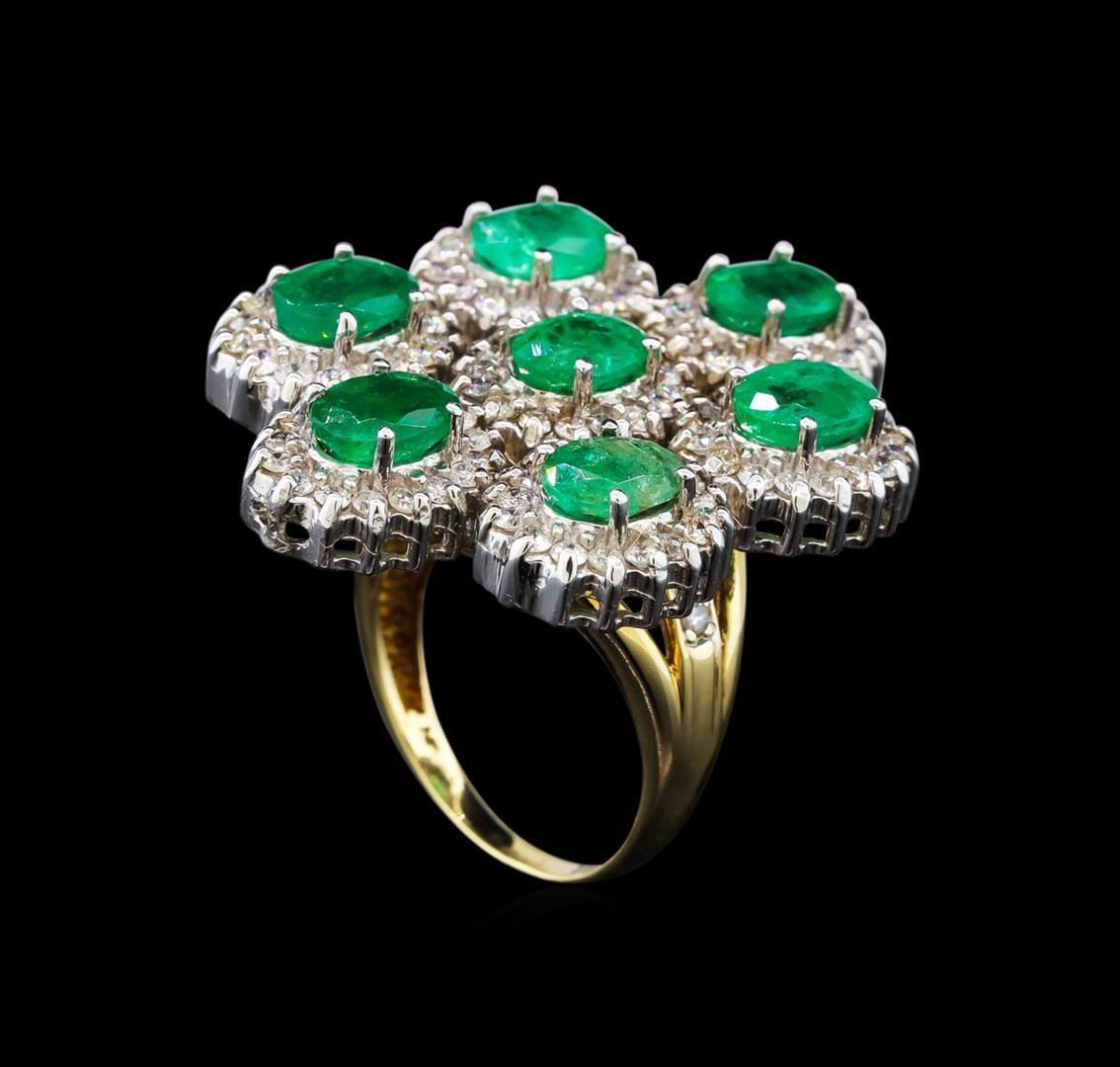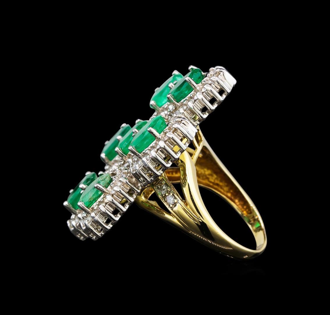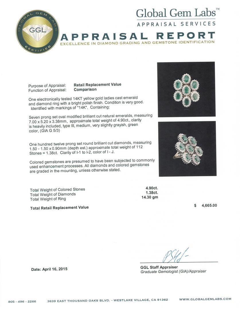 One electronically tested 14KT yellow gold ladies cast emerald and diamond ring with a bright polish finish. Identified with markings of "14K". Condition is very good. Containing: Seven prong set oval modified brilliant cut natural emeralds, measuring 7.00 x 5.20 x 3.38mm, approximate total weight of 4.90ct., clarity is heavily included, type III, medium, very slightly grayish, green color, (GIA G 5/3)One Hundred Twelve prong set round brilliant cut diamonds, measuring 1.50 - 1.50 x 0.90mm (depth est.) approximate total weight of 112 Stones = 1.38ct. Clarity: I-1 to I-2. Color: I - J. Colored gemstones are presumed to have been subjected to commonly used enhancement processes. All diamonds and colored gemstones are graded in the mounting, unless otherwise stated. Total Weight of Colored Stones 4.90ct. Total Weight of Diamonds 1.38ct. Total Weight of Ring 14.30 grams. GGL Appraised.