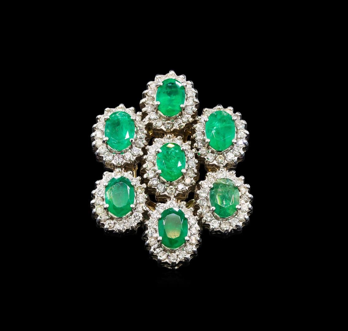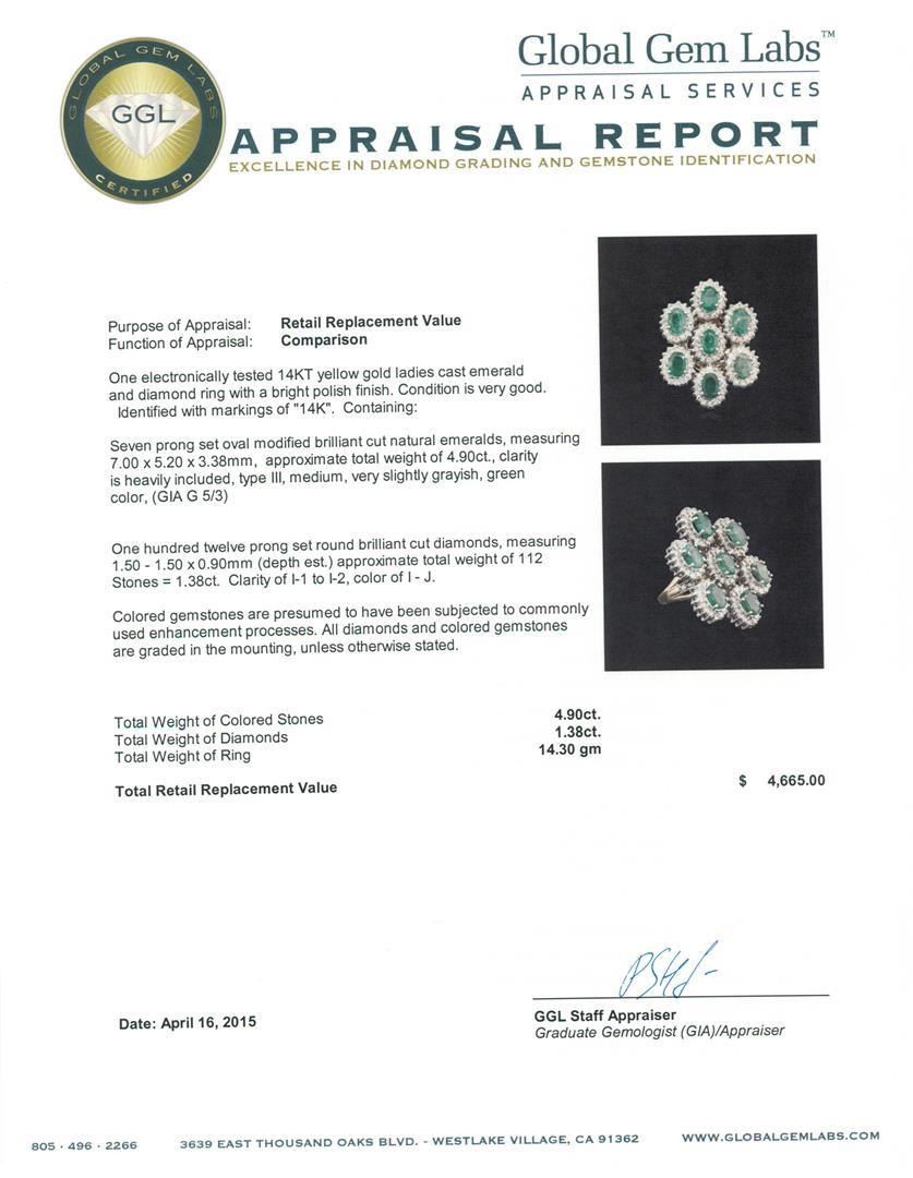 One electronically tested 14KT yellow gold ladies cast emerald and diamond ring with a bright polish finish. Identified with markings of "14K". Condition is very good. Containing: Seven prong set oval modified brilliant cut natural emeralds, measuring 7.00 x 5.20 x 3.38mm, approximate total weight of 4.90 ct., clarity is heavily included, type III, medium, very slightly grayish, green color, (GIA G 5/3)One Hundred Twelve prong set round brilliant cut diamonds, measuring 1.50 - 1.50 x 0.90mm (depth est.) approximate total weight of 112 Stones = 1.38ct. Clarity: I-1 to I-2. Color: I - J. Colored gemstones are presumed to have been subjected to commonly used enhancement processes. All diamonds and colored gemstones are graded in the mounting, unless otherwise stated. Total Weight of Colored Stones 4.90 ct. Total Weight of Diamonds 1.38ct. Total Weight of Ring 14.30 grams. GGL Appraised.