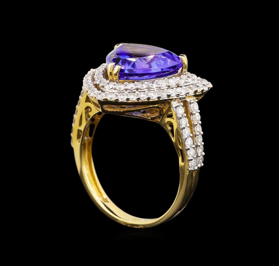 One electronically tested 14KT yellow gold ladies cast tanzanite and diamond ring with a split shoulder shank with a bright polish finish. Trademark is Orianne. Identified with markings of "14K". Condition is new. Containing: One prong set triangle modified brilliant cut natural tanzanite, measuring 10.71 x 10.43 x 7.37mm, approximate weight of 4.96ct., clarity is eye clean, type I, medium light, moderately strong, violetish blue color, (GIA vB 4/4), cut is good. Eighty-Seven prong set round brilliant cut diamonds, measuring 1.20 - 1.20 x 0.72mm (depth est.) approximate total weight of 87 Stones = 0.55ct. Clarity: SI-2 to I-2. Color: I - J, Cut is Good. All diamonds and colored gemstones are graded in the mounting, unless otherwise stated. Colored gemstones are presumed to have been subjected to commonly used enhancement processes.. Total Weight of Colored Stones 4.96ct. Total Weight of Diamonds 0.55ct. Total Weight of Ring 6.20 grams. GGL Appraised.