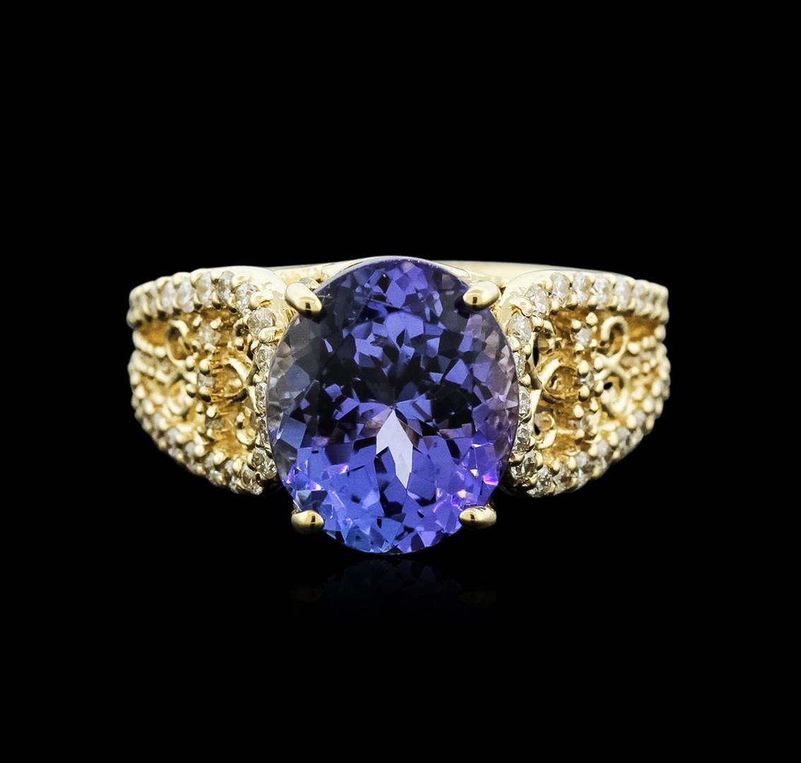 One electronically tested 14KT yellow gold ladies cast tanzanite and diamond ring with a bright and brushed finish. Identified with markings of "14K". Condition is new. Containing: One prong set oval modified brilliant cut natural tanzanite, measuring 11.30 x 9.50 x 6.60mm, approximate weight of 4.98ct., clarity is eye clean, type I, medium light, very slightly grayish, violet color, (GIA V 4/3), cut is good. Fifty-Six prong set round brilliant cut diamonds, measuring 1.50 - 1.20 x 0.81mm (depth est.) approximate total weight of 56 Stones = 0.50ct. Clarity: SI-2 to I-2. Color: I - J. Colored gemstones are presumed to have been subjected to commonly used enhancement processes. All diamonds and colored gemstones are graded in the mounting, unless otherwise stated. Total Weight of Colored Stones 4.98ct. Total Weight of Diamonds 0.50ct. Total Weight of Ring 5.80 grams. GGL Appraised at $5,760.00.