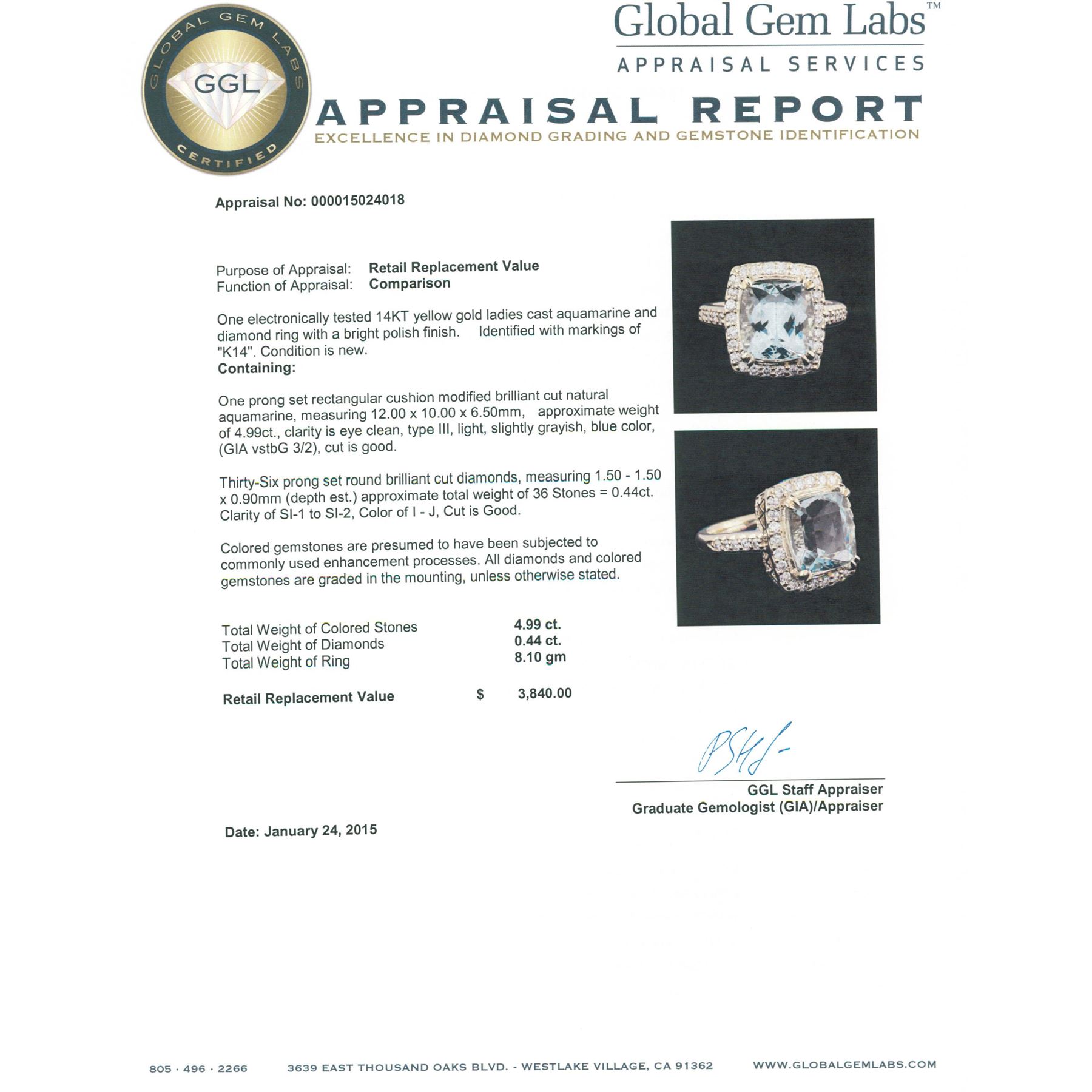 One electronically tested 14KT yellow gold ladies cast aquamarine and diamond ring with a bright polish finish. Identified with markings of "K14". Condition is new. Containing: One prong set rectangular cushion modified brilliant cut natural aquamarine, measuring 12.00. x 10.00. x 6.50mm, approximate weight of 4.99ct., clarity is eye clean, type III, light, slightly grayish, blue color, (GIA vstbG 3/2), cut is good. Thirty-Six prong set round brilliant cut diamonds, measuring 1.50 - 1.50 x 0.90mm (depth est.) approximate total weight of 36 Stones = 0.44ct. Clarity: SI-1 to SI-2. Color: I - J, Cut is Good. Colored gemstones are presumed to have been subjected to commonly used enhancement processes. All diamonds and colored gemstones are graded in the mounting, unless otherwise stated. Total Weight of Colored Stones 4.99ct. Total Weight of Diamonds 0.44ct. Total Weight of Ring 8.10 grams. GGL Appraised.