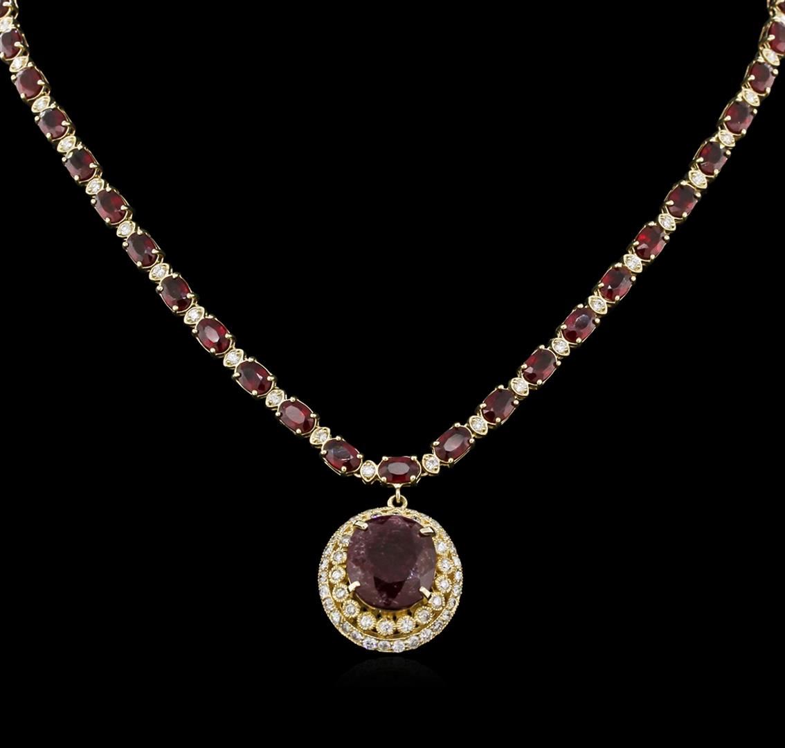 One electronically tested 14KT yellow gold ladies cast & assembled ruby and diamond necklace. Seventeen and one-half inch length necklace features a ruby and diamond pendant supported by a flexible ruby and diamond ribbon, terminating in a concealed clasp with safety. Bright polish finish with milgrain detailing. Identified with markings of "14K". Condition is new, good workmanship. Containing: One prong set oval mixed cut natural ruby, measuring 15.00. x 13.50 x 7.25mm, 8%. bulge factor, approximate weight of 12.72ct., clarity is heavily included, type II, dark, very slightly brownish, slightly purplish red color, (GIA slpR 7/3), cut is good. Transmitting light somewhat diffusely, transparent to translucent. Naturally occurring internal & external characteristics are present. Indications of laboratory high temperature heat treatment, with glass & flux additives. Graded in the setting. Forty-six prong set oval mixed cut natural rubies, measuring 6.00. x 4.00. x 2.90mm, 6%. bulge factor, approximate total weight of 28.06ct., clarity is heavily included, type II, medium dark, very slightly brownish, slightly purplish red color, (GIA slpR 6/3), cut is good. Transmitting light somewhat diffusely, transparent to translucent. Naturally occurring internal & external characteristics are present. Indications of laboratory high temperature heat treatment, with glass & flux additives. Measurements & the color grade are an average for the group. Graded in the setting. Ruby has a low tolerance to rhodium plating, repolishing the surface, & ultrasonic cleaning. Ninety-Four bezel and prong set round brilliant cut diamonds, measuring 2.10 - 2.00. x 1.23mm (depth est.) approximate total weight of 94 Stones = 3.06ct. Graded in the setting. Clarity: SI-1 to I-1 . Color: G - I. Total Weight of Colored Stones 40.78ct. Total Weight of Diamonds 3.06ct. Total Weight of Necklace 32.32 grams. AIG Appraised at $19,490.00.