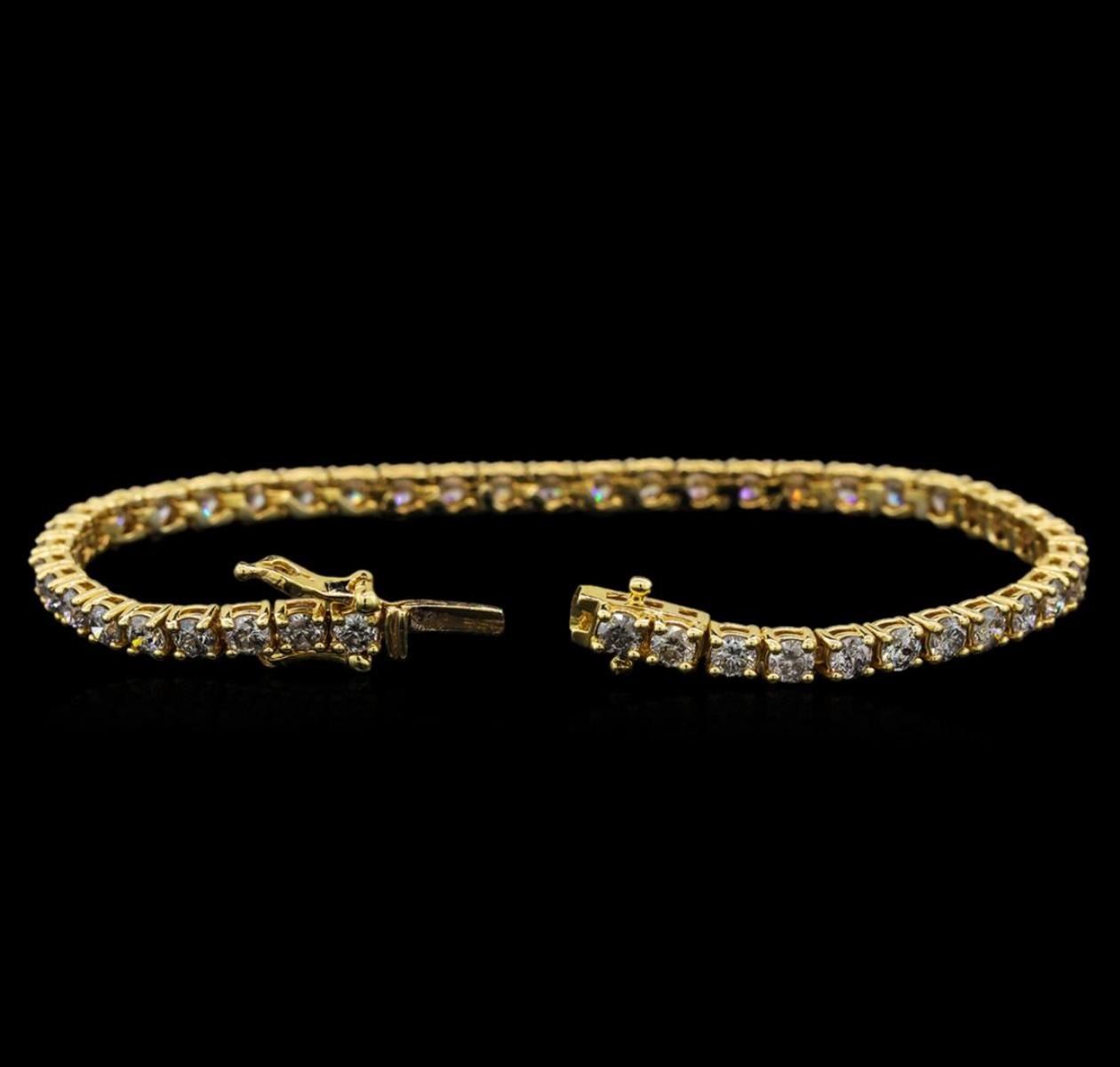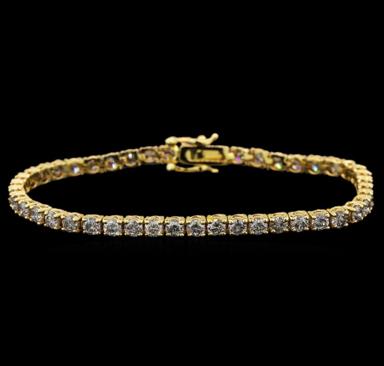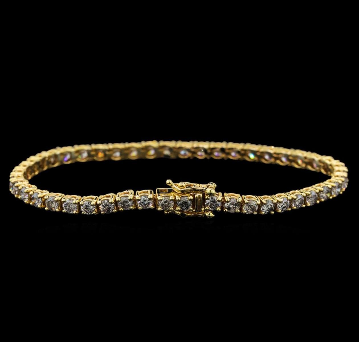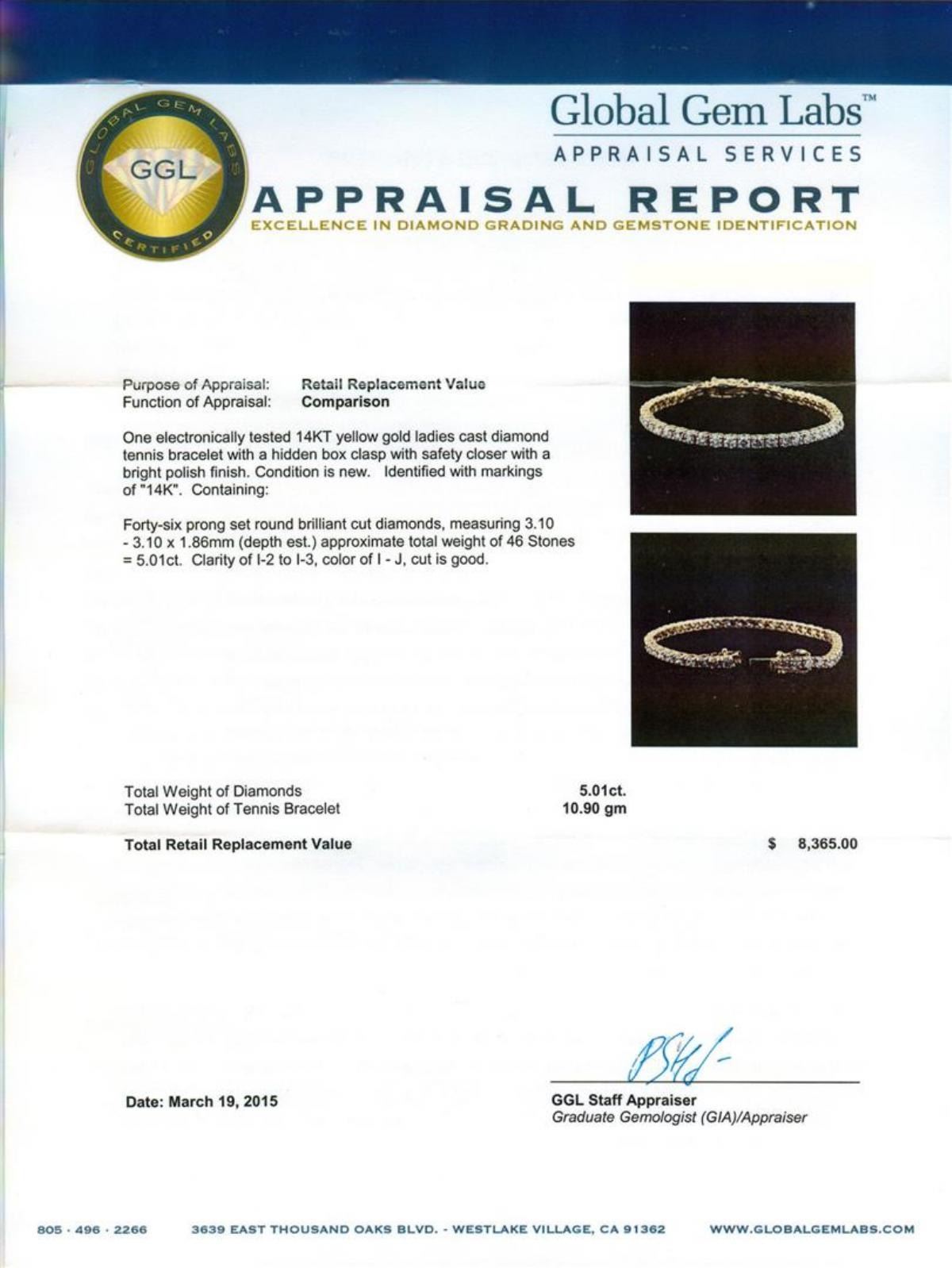 One electronically tested 14KT yellow gold ladies cast diamond tennis bracelet with a hidden box clasp with safety closer with a bright polish finish. Measurements: 7" in length Identified with markings of "14K". Condition is new. Containing: Forty-Six prong set round brilliant cut diamonds, measuring 3.10 - 3.10 x 1.86mm (depth est.) approximate total weight of 46 Stones = 5.01ct. Clarity: I-2 to I-3. Color: I - J, Cut is Good. All diamonds are graded in the mounting, unless otherwise stated. Total Weight of Diamonds 5.01ct. Total Weight of Tennis Bracelet 10.90 grams. GGL Appraised at $8,365.00.