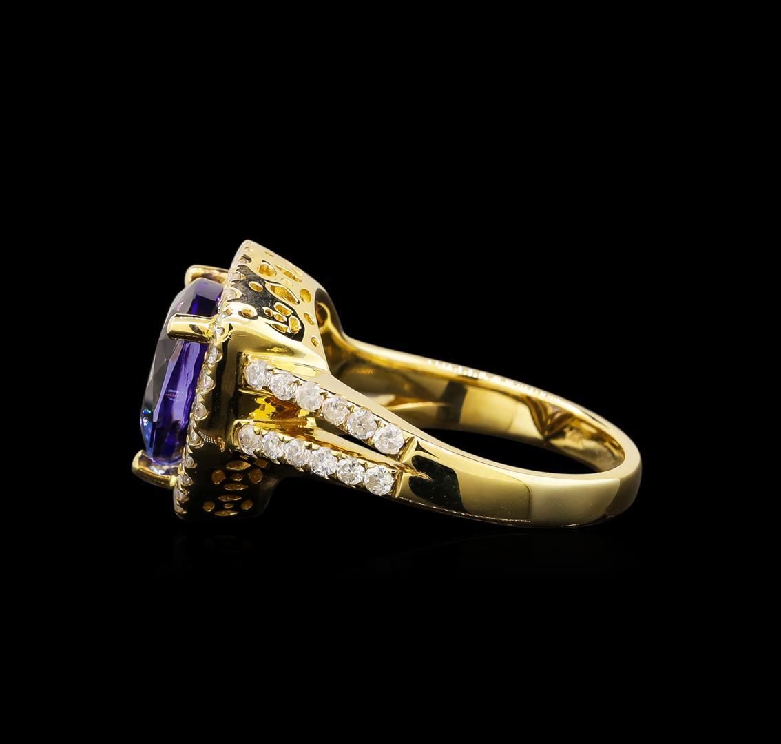 One electronically tested 14KT yellow gold ladies cast tanzanite and diamond ring with a bright polish finish. Trademark is Orianne. Identified with markings of "14K". Condition is new. Containing: One prong set triangle modified brilliant cut natural tanzanite, measuring 11.00 x 11.00 x 6.90mm, approximate weight of 5.03ct., clarity is eye clean, type I, medium, very slightly grayish, bluish violet color, (GIA bV 5/3), cut is good. Fifty-One prong set round brilliant cut diamonds, measuring 1.50 - 1.50 x 0.90mm (depth est.) approximate total weight of 51 Stones = 0.63ct. Clarity: I-1 to I-2. Color: J - K, Cut is Good. All diamonds and colored gemstones are graded in the mounting, unless otherwise stated. Colored gemstones are presumed to have been subjected to commonly used enhancement processes.. Total Weight of Colored Stones 5.03ct. Total Weight of Diamonds 0.63ct. Total Weight of Ring 9.30 grams. GGL Appraised.
