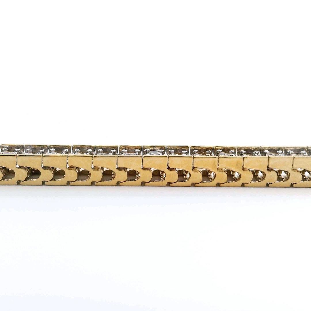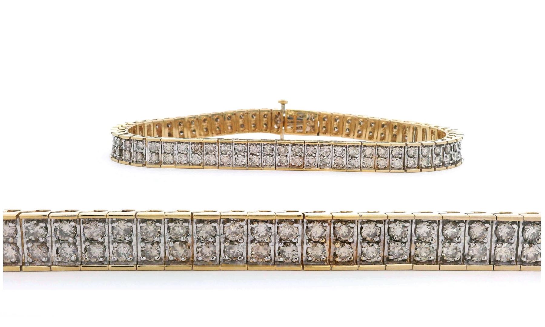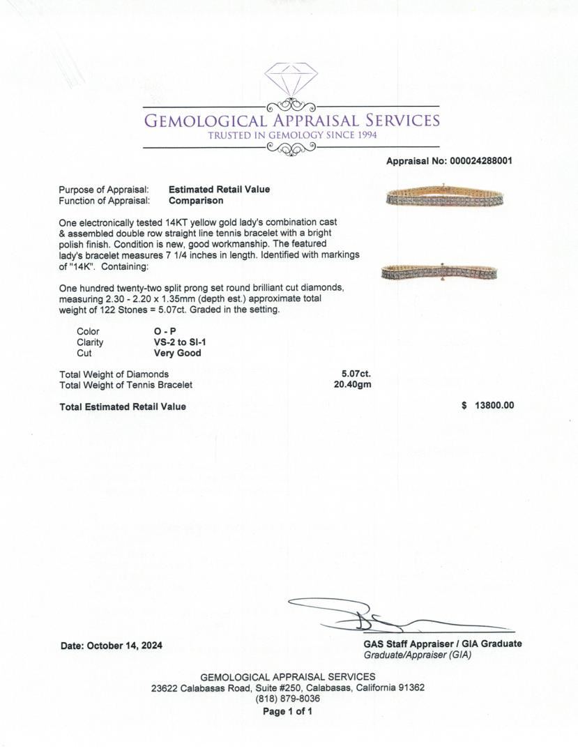 A striking 14KT yellow gold double-row diamond tennis bracelet featuring 122 round brilliant cut diamonds totaling 5.07 carats. Measuring 7 1/4 inches, this elegant bracelet is crafted with a bright polish finish and secured with a tongue clasp for durability and style. Perfect for elevating any look. Estimated Retail Value: $13,800.