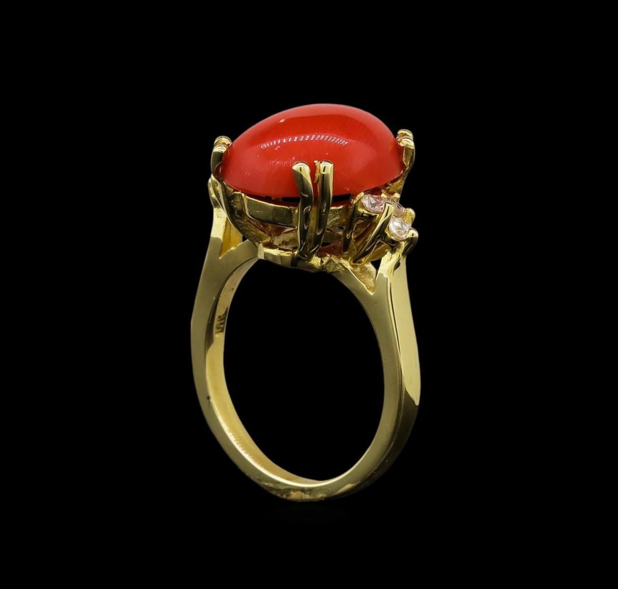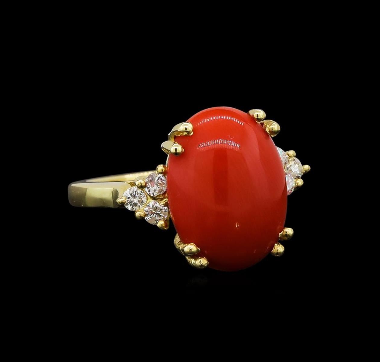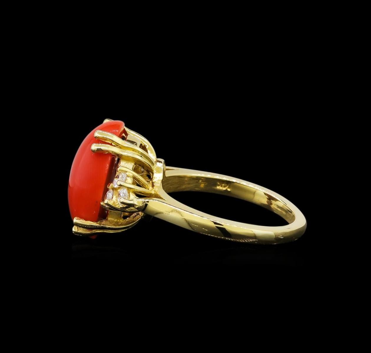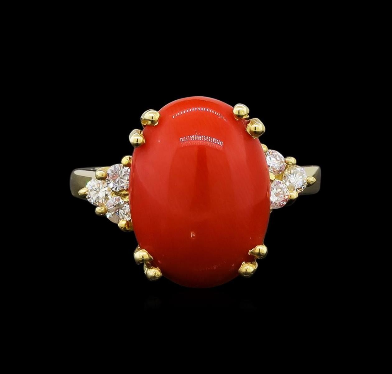 One electronically tested 14KT yellow gold ladies cast coral and diamond ring with a bright polish finish. Identified with markings of "14K". Condition is new. Containing: One prong set oval cabochon cut natural red coral, measuring 15.00 x 11.00 x 7.15mm, approximate weight of 6.25ct., clarity is severely included, medium dark, brownish, red color, (GIA R 6/1), cut is good. Six prong set round brilliant cut diamonds, measuring 2.30 - 2.30 x 1.38mm (depth est.) approximate total weight of 6 Stones = 0.25ct. Clarity: SI-1 to SI-2. Color: I - J, Cut is Good. Colored gemstones are presumed to have been subjected to commonly used enhancement processes. All diamonds and colored gemstones are graded in the mounting, unless otherwise stated. Total Weight of Colored Stones 6.25ct. Total Weight of Diamonds 0.25ct. Total Weight of Ring 6.36 grams. GGL Appraised at $1,960.00.