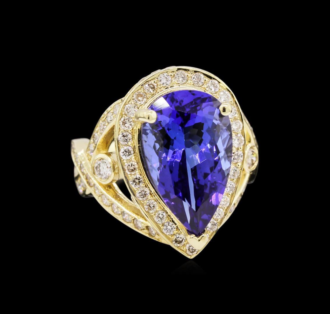One electronically tested 14KT yellow gold ladies cast tanzanite and diamond ring with a bright polish finish. Condition is new, good workmanship. The featured tanzanite is set within a diamond bezel, supported by diamond set intertwined ribbons of diamonds as shoulders and completed by a four millimeter wide band. Identified with markings of "14K". Containing: One prong set pear modified brilliant cut natural tanzanite, measuring 15.79 x 9.73 x 7.74mm, exact weight 7.74ct., clarity is eye clean, type I, medium dark, moderately strong, violetish blue color, (GIA vB 6/4), cut is good. Transmitting light with no distortion, transparent. GIA Gemological Report attached. Graded loose prior to setting in the GIA Laboratory, Report #6157951680.Tanzanite is a very rare gemstone that is only found in the country of Tanzania. Originally discovered in 1967. Tiffany & Company, named the stone Tanzanite. It is found in the Usumburu Mountains that border the Umba Valley of northern Tanzania. Tanzanite occurs in gray, brown, violet, blue, reddish-purple, & green. The gem is interesting because of its exceptional pleochroism. Rotated in different directions a tanzanite will exhibit multiple changes of color. Tanzanite has a low tolerance to ultrasonic cleaning, and should not be cleaned using this method. One Hundred Thirty-Two bead & bezel set round brilliant cut diamonds, measuring 2.50 - 1.50 x 1.20mm (depth est.) approximate. Total Weight of 132 Stones = 1.84ct. Graded in the setting. Clarity: SI-1 to I-1. Color: G - I. Total Weight of Colored Stones 7.74ct. Total Weight of Diamonds 1.84ct. Total Weight of Ring 10.10 grams. AIG Appraised.