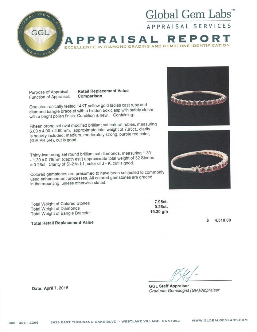 One electronically tested 14KT yellow gold ladies cast ruby and diamond bangle bracelet with a hidden box clasp with safety closer with a bright polish finish. Condition is new. Containing: Fifteen prong set oval modified brilliant cut natural rubies, measuring 6.00 x 4.00 x 2.60mm, approximate total weight of 7.95ct., clarity is heavily included, medium, moderately strong, purple red color, (GIA PR 5/4), cut is good. Thirty-Two prong set round brilliant cut diamonds, measuring 1.30 - 1.30 x 0.78mm (depth est.) approximate total weight of 32 Stones = 0.26ct. Clarity: SI-2 to I-1. Color: J - K, Cut is Good. Colored gemstones are presumed to have been subjected to commonly used enhancement processes. All colored gemstones are graded in the mounting, unless otherwise stated. Total Weight of Colored Stones 7.95ct. Total Weight of Diamonds 0.26ct. Total Weight of Bangle Bracelet 19.30 grams. GGL Appraised at $4,510.00.
