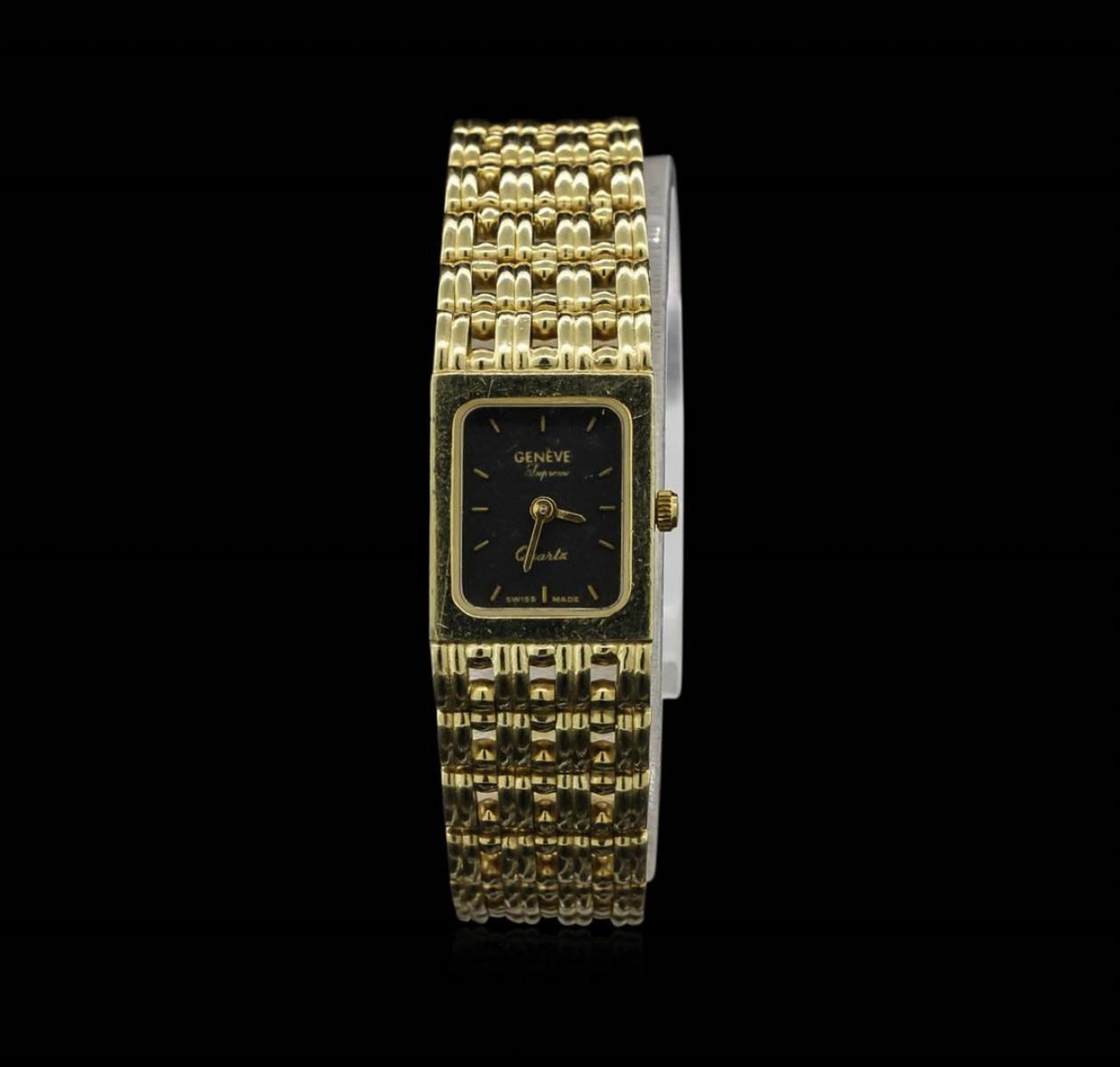 One 14KT Yellow Gold Geneve Supreme Wristwatch. Band: 14KT yellow gold. Dial: black marked swiss made.
