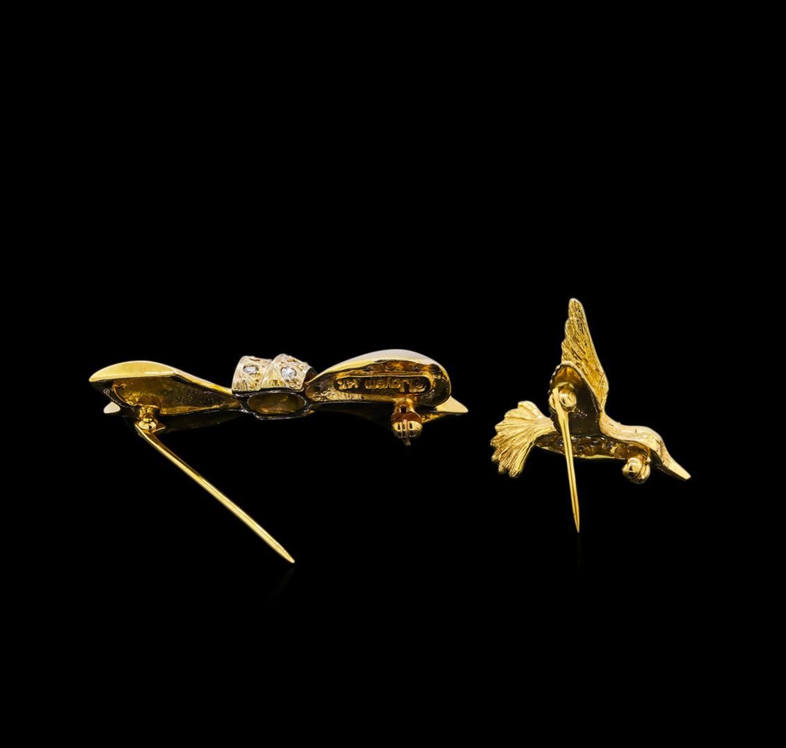 14KT yellow gold hummingbird and ribbon pins weighing a total of 13.30 grams.