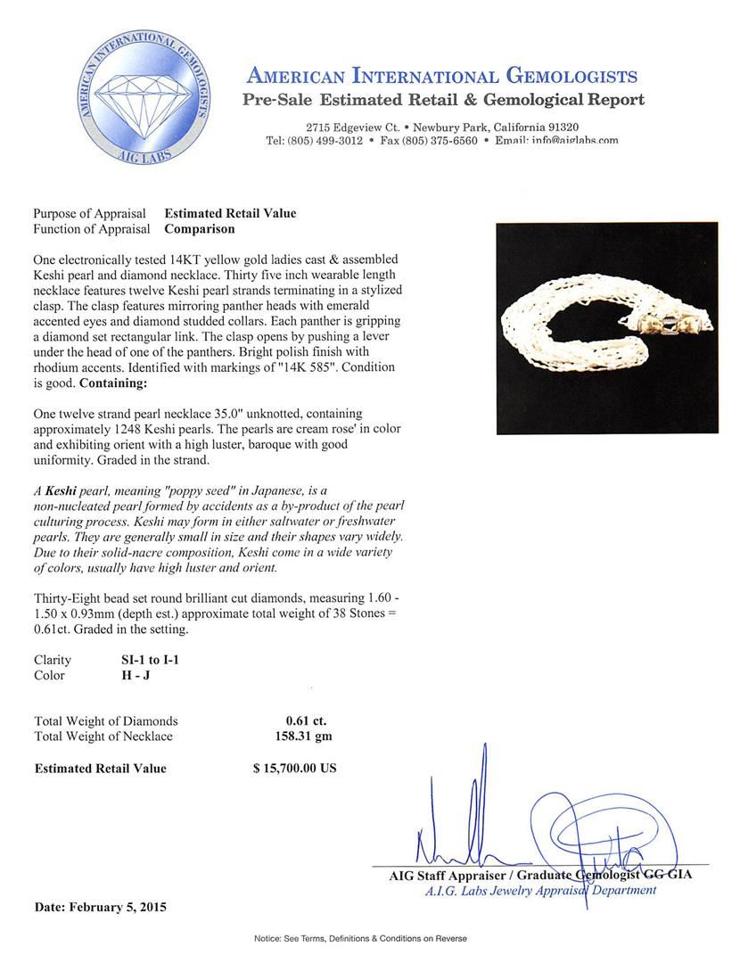 One electronically tested 14KT yellow gold ladies cast & assembled Keshi pearl and diamond necklace. Thirty five inch wearable length necklace features twelve Keshi pearl strands terminating in a stylized clasp. The clasp features mirroring panther heads with emerald accented eyes and diamond studded collars. Each panther is gripping a diamond set rectangular link. The clasp opens by pushing a lever under the head of one of the panthers. Bright polish finish with rhodium accents. Identified with markings of "14K 585". Condition is good. Containing: One twelve strand pearl necklace 35.0" unknotted, containing 124 keshi pearls, The pearls are cream rose' in color and exhibiting orient with a high luster, baroque with good uniformity Graded in the strand. A Keshi pearl, meaning "poppy seed" in Japanese, is a non-nucleated pearl formed by accidents as a by-product of the pearl culturing process. Keshi may form in either saltwater or freshwater pearls. They are generally small in size and their shapes vary widely. Due to their solid-nacre composition, Keshi come in a wide variety of colors, usually have high luster and orient. Thirty-Eight bead set round brilliant cut diamonds, measuring 1.60 - 1.50 x 0.93mm (depth est.) approximate total weight of 38 Stones = 0.61ct. Graded in the setting. Clarity: SI-1 to I-1. Color: H - J. Total Weight of Diamonds 0.61ct. Total Weight of Necklace158.31 grams. AIG Appraised.