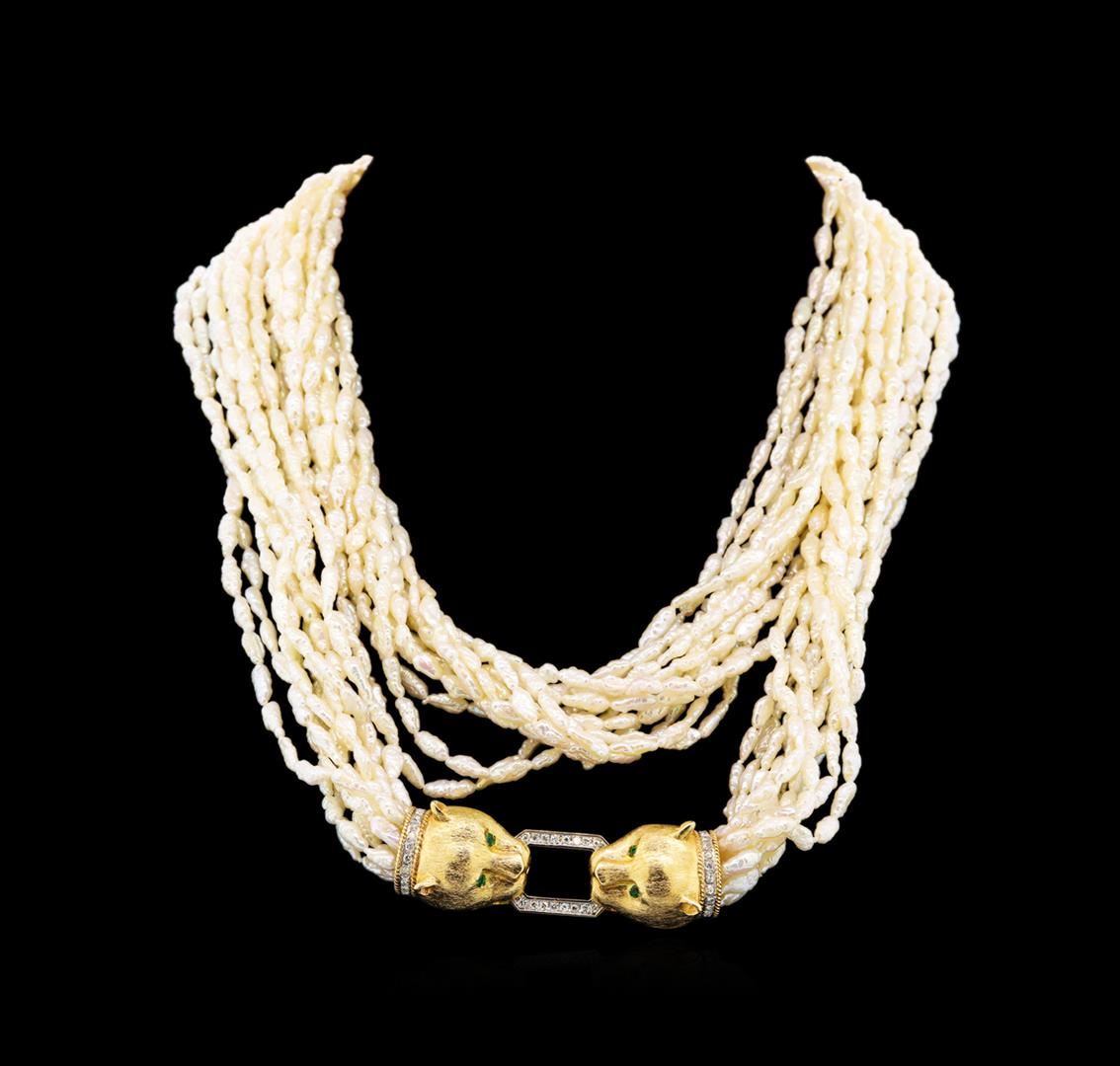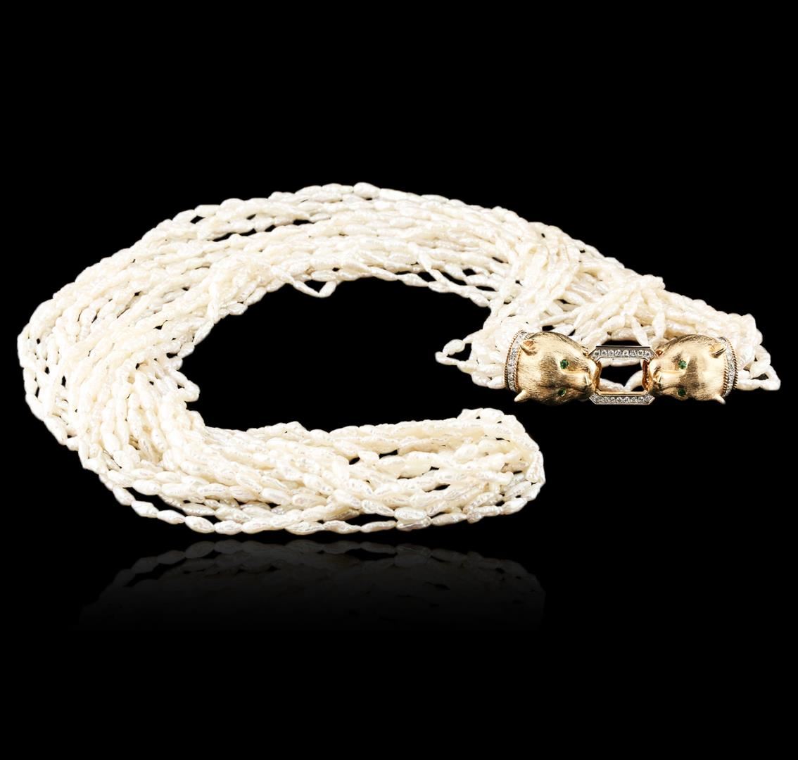 One electronically tested 14KT yellow gold ladies cast & assembled Keshi pearl and diamond necklace. Thirty five inch wearable length necklace features twelve Keshi pearl strands terminating in a stylized clasp. The clasp features mirroring panther heads with emerald accented eyes and diamond studded collars. Each panther is gripping a diamond set rectangular link. The clasp opens by pushing a lever under the head of one of the panthers. Bright polish finish with rhodium accents. Identified with markings of "14K 585". Condition is good. Containing: One twelve strand pearl necklace 35.0" unknotted, containing 124 keshi pearls, The pearls are cream rose' in color and exhibiting orient with a high luster, baroque with good uniformity Graded in the strand. A Keshi pearl, meaning "poppy seed" in Japanese, is a non-nucleated pearl formed by accidents as a by-product of the pearl culturing process. Keshi may form in either saltwater or freshwater pearls. They are generally small in size and their shapes vary widely. Due to their solid-nacre composition, Keshi come in a wide variety of colors, usually have high luster and orient. Thirty-Eight bead set round brilliant cut diamonds, measuring 1.60 - 1.50 x 0.93mm (depth est.) approximate total weight of 38 Stones = 0.61ct. Graded in the setting. Clarity: SI-1 to I-1. Color: H - J. Total Weight of Diamonds 0.61ct. Total Weight of Necklace158.31 grams. AIG Appraised.
