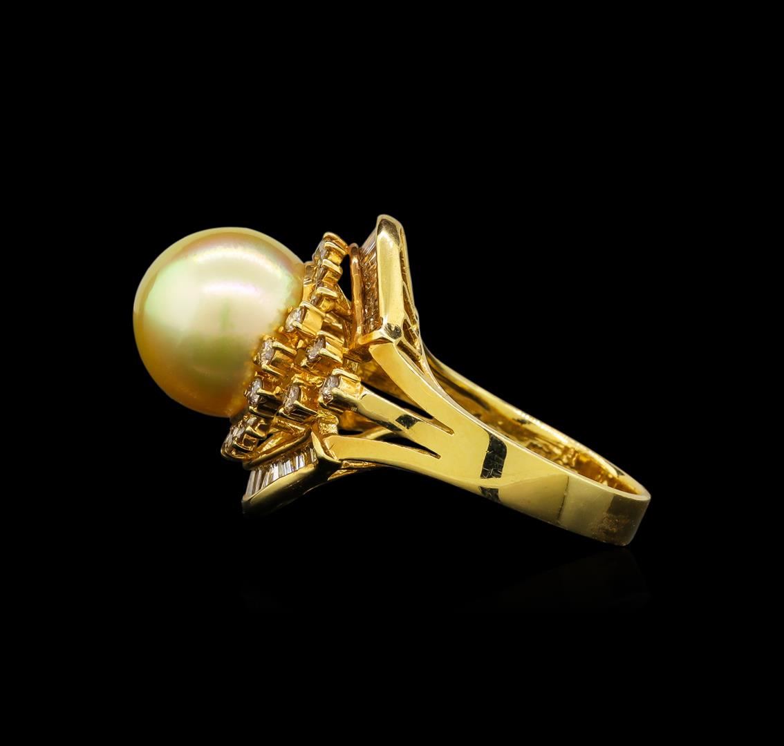 One electronically tested 14KT yellow gold ladies cast south sea cultured pearl & diamond ring with a bright polish finish. The featured south sea cultured pearl is set within a stylized diamond bezel supported by mirroring diamond ribbons, completed by a three millimeter wide band. Identified with markings of "14K 585". Condition is good. Containing: One south sea cultured pearl, 11.5mm in size. The pearl is golden in color with a high luster, thick nacre, all round, lightly spotted Graded in the setting. South Sea Cultured Pearls are farmed in the ocean waters throughout Australia, the Philippines, Indonesia, and the southern coast of China. Australia's main culturing industry is located near the city of Broome, in the northwest, on the Kimberley coast. South Sea cultured pearls form in the Pinctada Maxima oyster, the world's largest (up to 34cm) pearl cultivating oyster. The Indian & Pacific Ocean, the Java & the South China Sea, are the native waters of the Pinctada Maxima oyster. There are two varieties of the Pinctada Maxima: the Gold Lipped oyster which produces the golden color pearls, and the Silver Lipped oyster which produces white color pearls. The South Sea cultured pearl takes from about two to three years to grow. It is produced by inserting a large bead into the oyster when it is about two years old. The South Sea pearl nacre has a unique satiny appearance, due partly to the fast moving and clean waters on the South Seas. Twenty-Six prong set round brilliant cut diamonds, measuring 1.80 - 1.70 x 1.05mm (depth est.) approximate total weight of 26 Stones = 0.61ct. Graded in the setting. Clarity: SI-1 to I-1. Color: J - L Thirty-Four channel set baguette cut (tapered) diamonds, measuring from 1.70 x 1.00 x 0.70mm (depth est.) to 2.10 x 1.40 x 0.98mm (depth est.) approximate total weight of 34 Stones = 0.60ct. Graded in the setting. Clarity: VS-1 to SI-1. Color: I - K. Total Weight of Diamonds 1.21ct. Total Weight of Ring 8.13 grams. AIG Appraised.