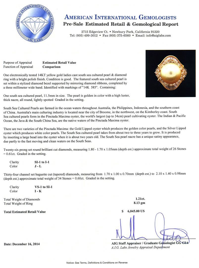 One electronically tested 14KT yellow gold ladies cast south sea cultured pearl & diamond ring with a bright polish finish. The featured south sea cultured pearl is set within a stylized diamond bezel supported by mirroring diamond ribbons, completed by a three millimeter wide band. Identified with markings of "14K 585". Condition is good. Containing: One south sea cultured pearl, 11.5mm in size. The pearl is golden in color with a high luster, thick nacre, all round, lightly spotted Graded in the setting. South Sea Cultured Pearls are farmed in the ocean waters throughout Australia, the Philippines, Indonesia, and the southern coast of China. Australia's main culturing industry is located near the city of Broome, in the northwest, on the Kimberley coast. South Sea cultured pearls form in the Pinctada Maxima oyster, the world's largest (up to 34cm) pearl cultivating oyster. The Indian & Pacific Ocean, the Java & the South China Sea, are the native waters of the Pinctada Maxima oyster. There are two varieties of the Pinctada Maxima: the Gold Lipped oyster which produces the golden color pearls, and the Silver Lipped oyster which produces white color pearls. The South Sea cultured pearl takes from about two to three years to grow. It is produced by inserting a large bead into the oyster when it is about two years old. The South Sea pearl nacre has a unique satiny appearance, due partly to the fast moving and clean waters on the South Seas. Twenty-Six prong set round brilliant cut diamonds, measuring 1.80 - 1.70 x 1.05mm (depth est.) approximate total weight of 26 Stones = 0.61ct. Graded in the setting. Clarity: SI-1 to I-1. Color: J - L Thirty-Four channel set baguette cut (tapered) diamonds, measuring from 1.70 x 1.00 x 0.70mm (depth est.) to 2.10 x 1.40 x 0.98mm (depth est.) approximate total weight of 34 Stones = 0.60ct. Graded in the setting. Clarity: VS-1 to SI-1. Color: I - K. Total Weight of Diamonds 1.21ct. Total Weight of Ring 8.13 grams. AIG Appraised.